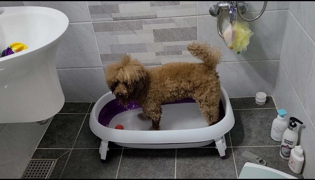 이미 엎질러진 물이기에 단비에게 공을 던져주니 신이 나서는 욕실에서 거실까지 쏜살같이 왔다 갔다 뛰어다니며 사방에 물이 묻은 몸을 털고 다니며 맘껏 기쁨을 표현한다. 맞다! 아기가 태어나기 전까지 십여 년간 욕실의 욕조는 단비 꺼였었다!!