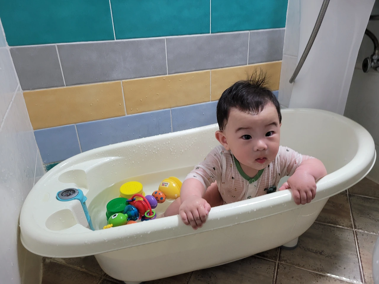 너무 어리둥절해서 샤워기로 헹구고 나와야겠다 싶어 넣어주니 또 장난감을 만지작 거리며 잘 노는 것이 아닌가! 이게 무슨 일인가 싶어 다친 데가 없는지 아기 몸을 이리저리 살펴보는데 너무 희한하게도 외상의 흔적은 없었다.