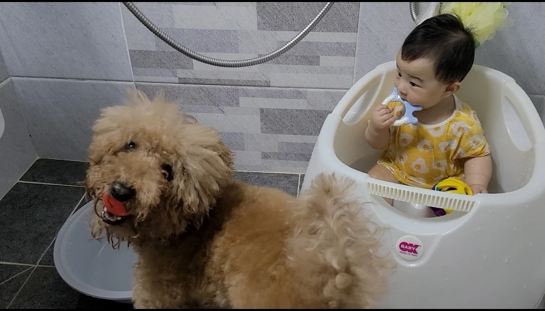 낮은 욕조에서는 자꾸 밖으로 나오려고 해서 일어서도 되는 욕조로 갈아타고 한시름 놓았건만, 오늘 드디어 일이 벌어지고야 말았다.
