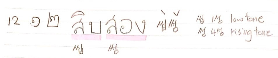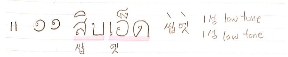 십일을 보면 십이 씹이고 일은 능이니까 씹능이라 할 것 같지만 그렇지 않다. 십일만 씹엣이라고 한다. 그리고 십이부터는 그대로 씹 + 썽 = 씹썽 그런 식으로 십이가 되니까 고대로 숫자를 붙이기만 하면 된다.