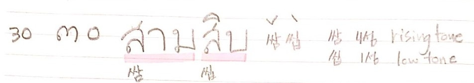 백 단위를 가장 많이 쓰게 될 것 같다. 백은 러이다. 이백 삼백은 계속해서 그대로 우리가 배운 숫자를 넣으면 된다. 이백은 이가 썽이니까 썽러이, 삼백은 삼이 쌈이니까 쌈러이, 사백은 사가 씨니까 씨러이, 오백은 오가 하니까 하러이... 요런 식으로 까오러이 즉 900까지 셀 수 있다. 그럼 여기 쓰여있는 러이를 보자.