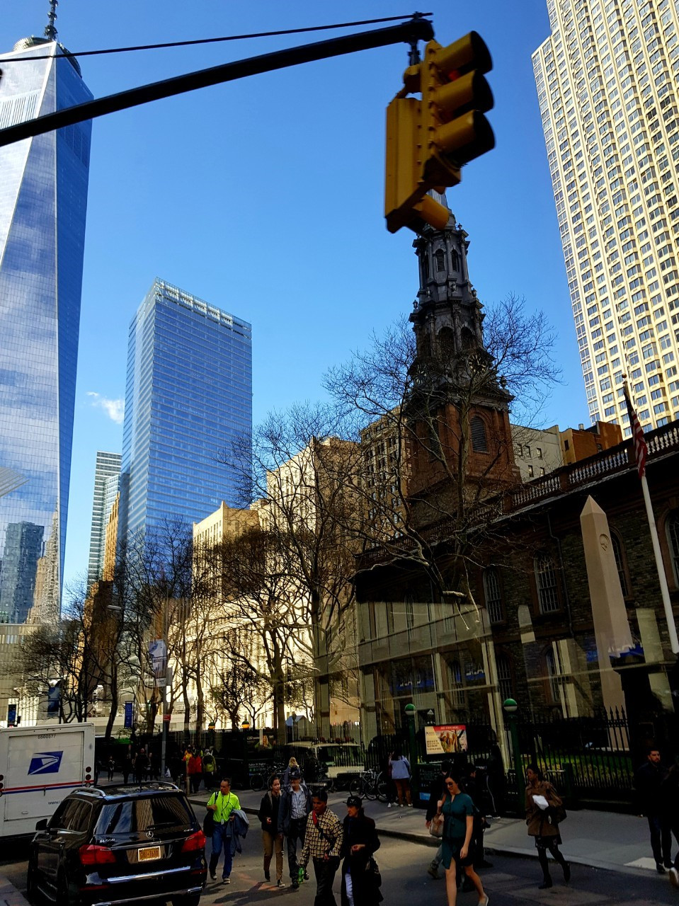 17세기 초 네덜란드인들이 여기를 뉴암스탈뎀이라며 정착하던 시절 인디언의 침입을 막기 위해 나무 벽 즉 Wall 을 세웠기에 월스트리트라는 이름이 되었단다. 이 나무벽은 1699년 영국군에의해 철거되고 도시이름도 뉴욕으로 바뀐다. 우리는 또!!! 쎌카 타이머2초 그 촬영을 시작했으니 순식간에 다다다다 모여 핸드폰 속 동그란 타이머가 뺑그르르 1에서 2로 바뀌는 걸 보며 최상의 표정짓기. 그게 너무 웃겨 깔깔 푸하하하 하늘은 푸르고 길은 막히고 걸어걸어 페리호를 타러 간다. 뉴욕시내를 구경하며 가다보니 한적한 풍경도 나오고 최첨단 모습도 나온다. 빌딩숲을 걷고 걸어 우리는 배 타러 간다.