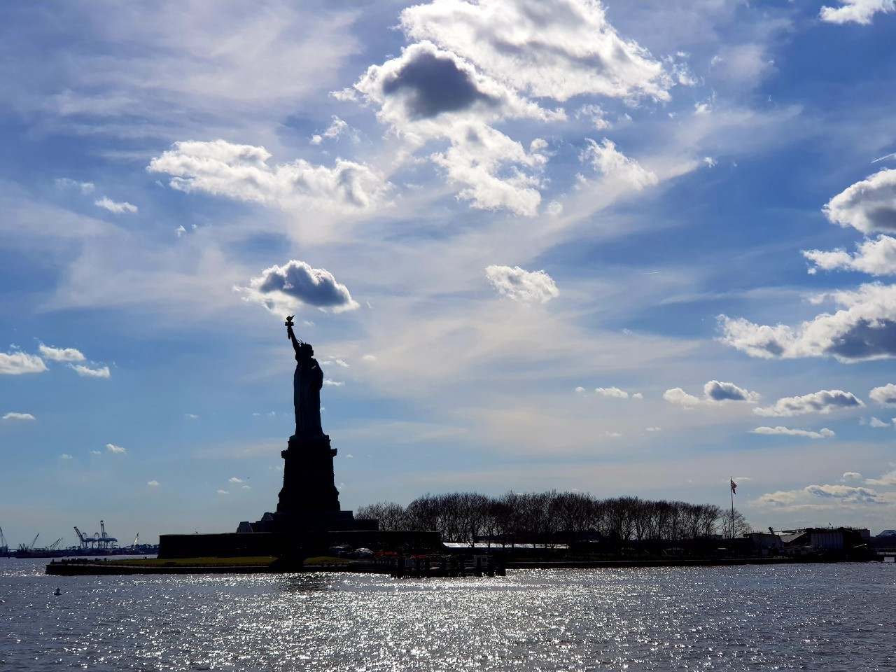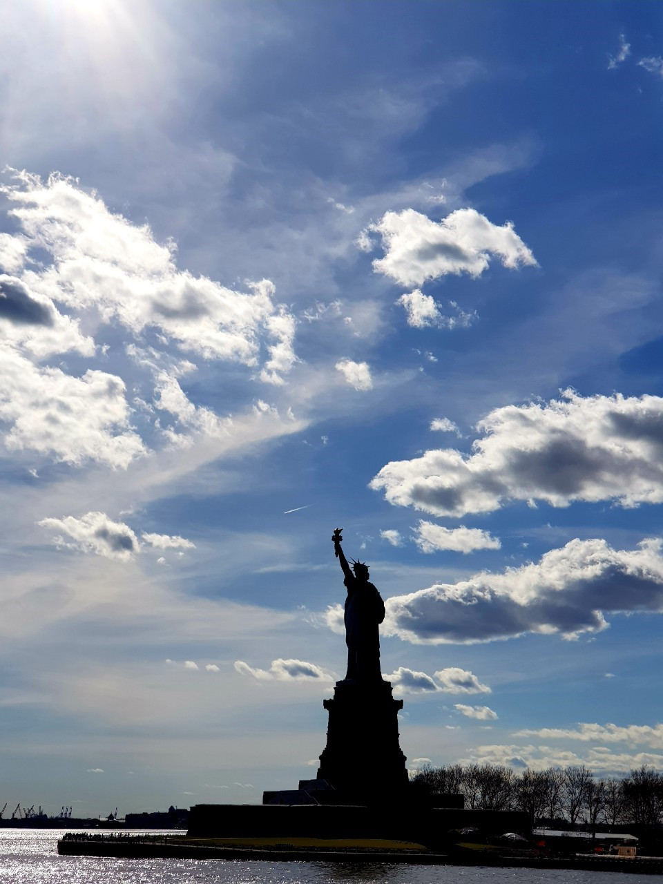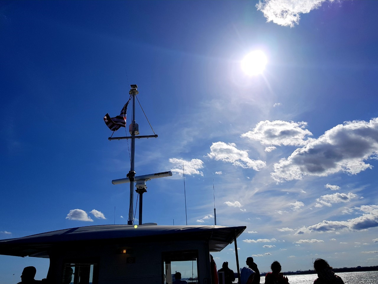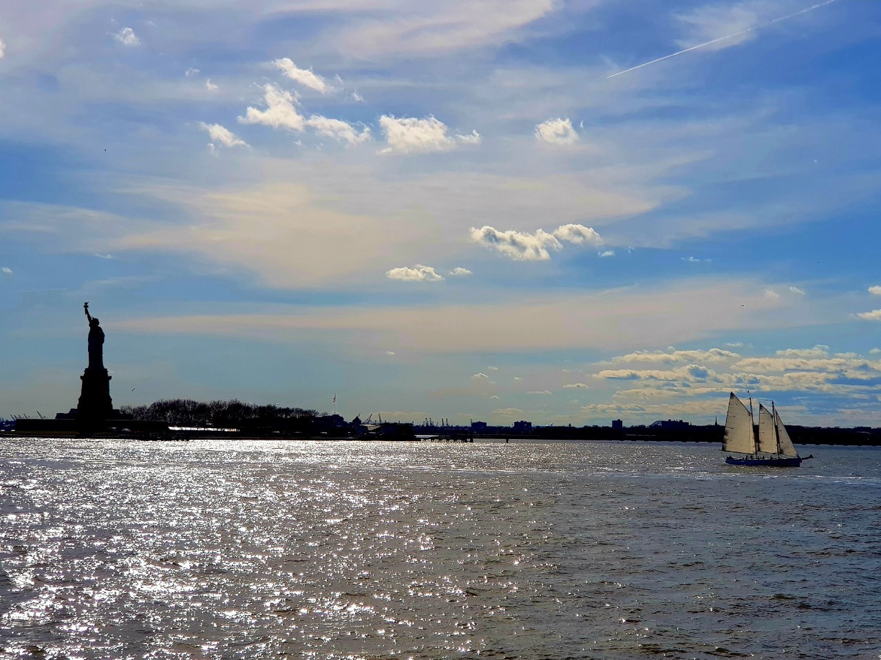 왕관에 달린 7개의 뿔은 북극해 남극해 남대서양 북대서양 북태평양 남태평양 인도양 7개의 바다와 전 세계의 대륙을 향해 자유의 빛이 뻗어 나간 다는 것을 의미한다. 몸을 감싸고 있는 긴 옷은 민주주의를 실행한 로마 공화국을 상징하고 자세히 보면 여신상이 쇠사슬을 발로 밟고 있는데 노예제도 폐지를 의미한단다. 캬~ 돛단배도 멋지고 스카이라인도 멋지고 파란 하늘도 멋지고 바다같은 강도 멋지고 캬~ 캬~ 캬~ 감탄사만 줄줄줄줄