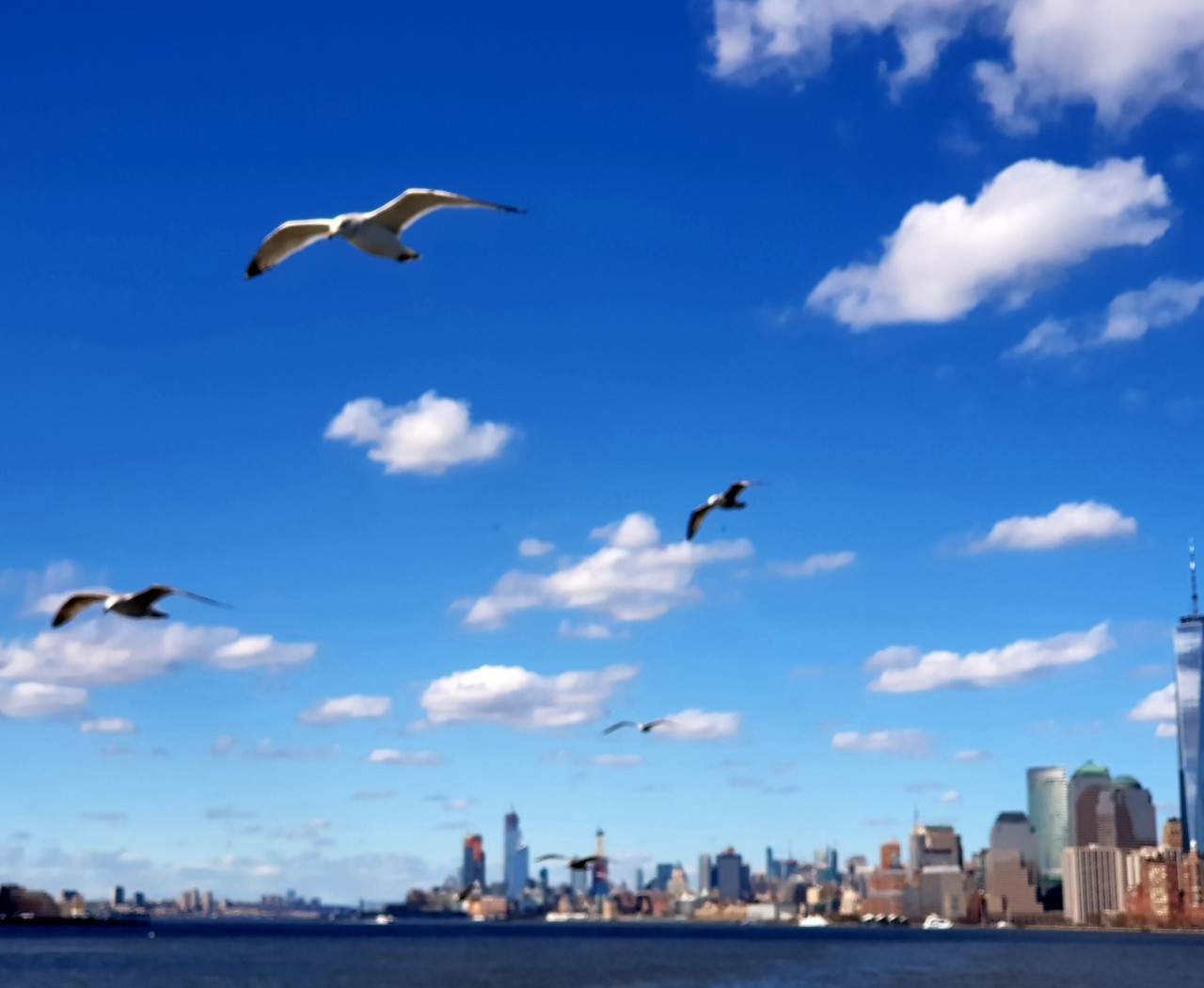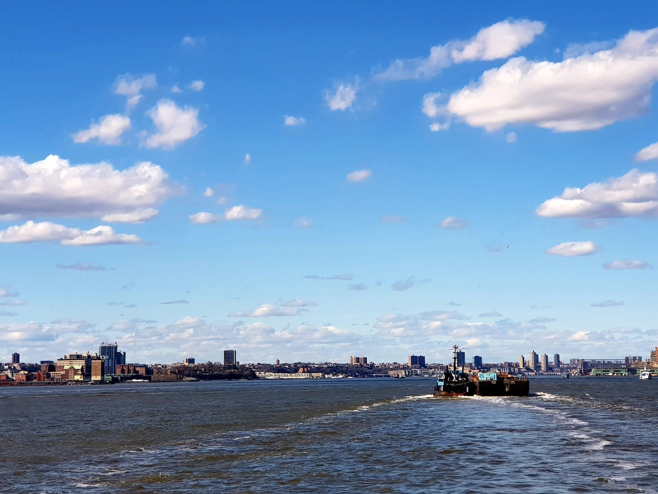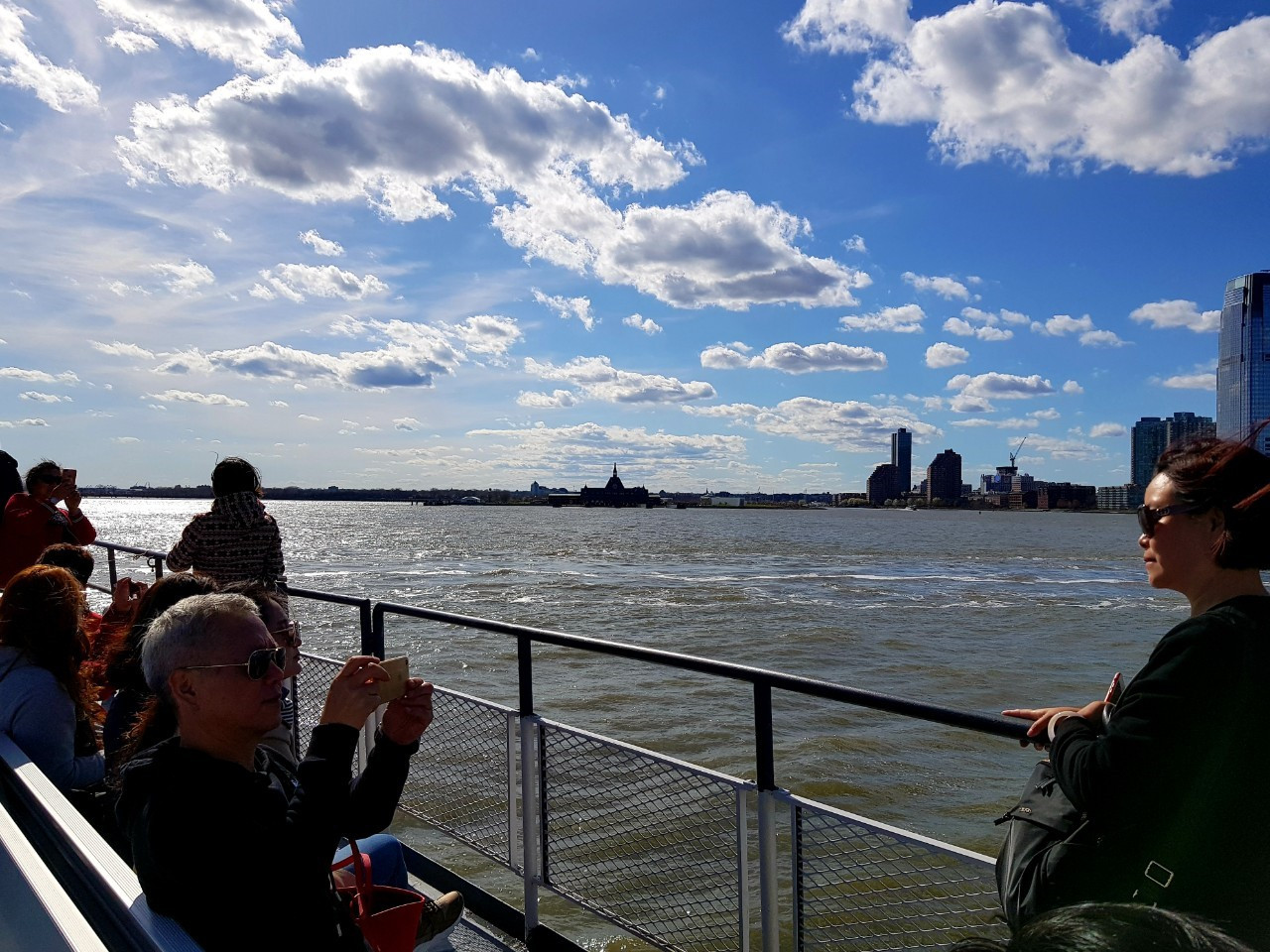 하늘은 파랗고 우리들은 두둥실 높이 높이 올라가 흰 구름이 된다. 알록달록 유니폼의 중국 학생들. 무척 어린데 이미 단체여행으로 뉴욕이라니? 선생님들 역시 아주 젊고 세련되었다. 발전하는 중국을 실감한다. 가장 편안한 자세. 배가 떠나기 전 평화로운 부두의 모습으로 자꾸 눈길이 간다. 누가 무얼하나? 언제나 다른 사람의 일상이 궁금한 나. 가이드님의 커피 기다리느라 거의 꼴찌로 승선한 우리들. 바다가 훤히 보이는 멋진 자리는 이미 다 점령되고 배 한가운데 궁둥이 걸칠 자리만 겨우 남아 있다. 거기라도 앉을 수 있다는 데 감사하며. 온갖 배들이 떠다니는 넓고 넓은 허드슨 강.