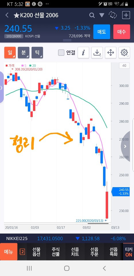 그래 잘하고 있는 거야. 난 아무것도 모른다. 그저 5일선이 20일 선 뚫고 빵 위로 올라가기를 기다릴 뿐. 5일선이 20일선을 뚫고 내려갈 때 매도한 것을 그대로 놓아두었다면 어제 선물 만기일로 정리될 때 그 수익은 어마어마했을 것이다. 그런데 중간에 이익실현 먹튀 어쩌고 잘난 척하며 빠져나왔던 것이다. 그땐 꼭 그것만 기록하고 너무 많이 빠져서 올라갈 듯이 보였으니까. 그게 얼마나 어리석은 짓이었나를 난 알아야 한다. 몇 번 그런 감에 의한 매매가 수익을 줄지 모르나 무원칙은 어느 한 날 나를 팍 쓰러지게 만들 것이다. 살아있어야 한다. 기진맥진 쓰러지면 안 된다. 천천히 하면 된다. 세월이 무궁무진인데 느긋하게 그냥 5일선이 빵! 20일선을 뚫고 위로 갈 때를 기다려 겸손하게 매매 하자. 글을 쓰면 마음이 다스려지니 다행이다. 난 목에 칼이 들어와도 5일선이 20일선 아래 있는데 정말 바닥 같다고 매수하는 일 따위는 절대 아니하리라. 파이팅!!!