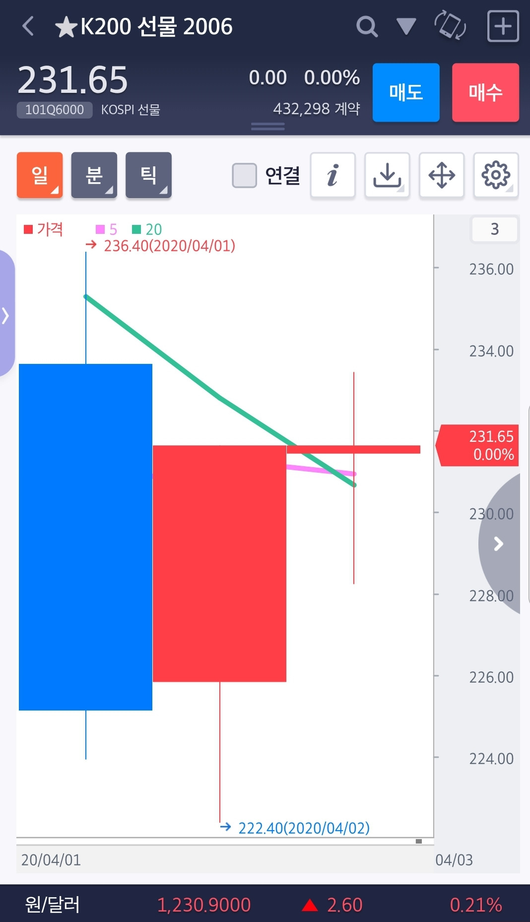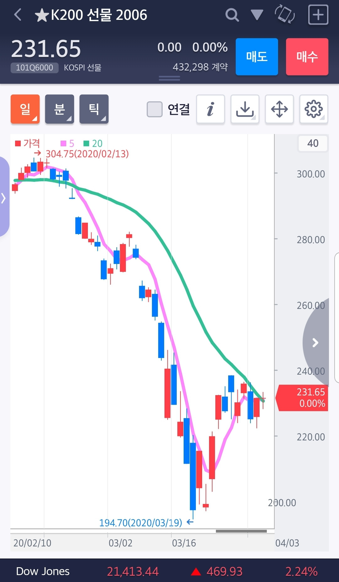 초록색은 20일선이고 분홍색은 5일선이다. 캬~ 얼마나 주야장천 내려왔는가. 정말 기막힌 하락이었다. 그 바닥을 잡으려고 난 언제부터 난리부르스를 떨었던가. 신호 따라 매도를 잘해놓고도 이렇게 내려갈 순 없어하면서 먹튀가 최고라고 2월 28일에 잘난 척 268.65에서 이익 실현하고 말았으니 몰라라하고 있었으면 도대체 요 거이 얼마나 큰 수익이란 말인가. 원칙대로 잘 지켜서 나의 아주 간단한 원칙. 5일선이 20일선과 꽝! 충돌할 때만 매매한다. 5일선이 20일선을 뚫고 내려갈 땐 매도, 올라갈 땐 매수. 그렇게 잘 매도해놓고 도저히 못 참고 이익을 챙겨버렸으니 아쉽다. 거기서 194.70까지 갔으니 물론 바닥에서 매수할 수는 없었겠으나 한번 계산이나 해보자. 268.65 - 194.70 = 73.95 우아아 아 73.95 포인트나 더 내려갔으니 요 거이 얼마냐. 1포인트당 25만 원의 수익이므로 73.95 x 25만 원 = 18,487,500원.