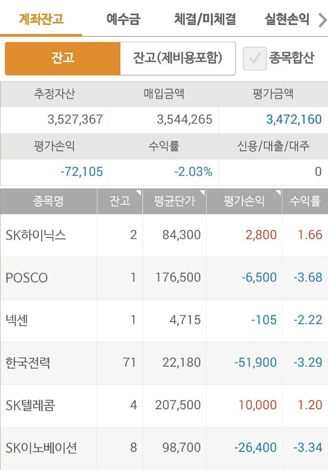 오늘 하루 종일 밖에 있느라 장이 모두 끝나고야 확인했다. 헉! 이럴 수가. 그야말로 에고고고 곡소리가 나올 지경이다. 하이고오오오 온통 시퍼러둥둥이다. 잔고에 나와있는 순서대로 차트를 보자. 나의 잘못이 있는지 있다면 무엇인지.