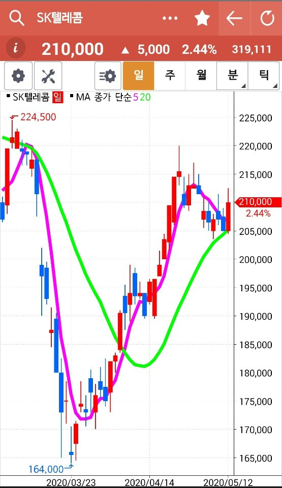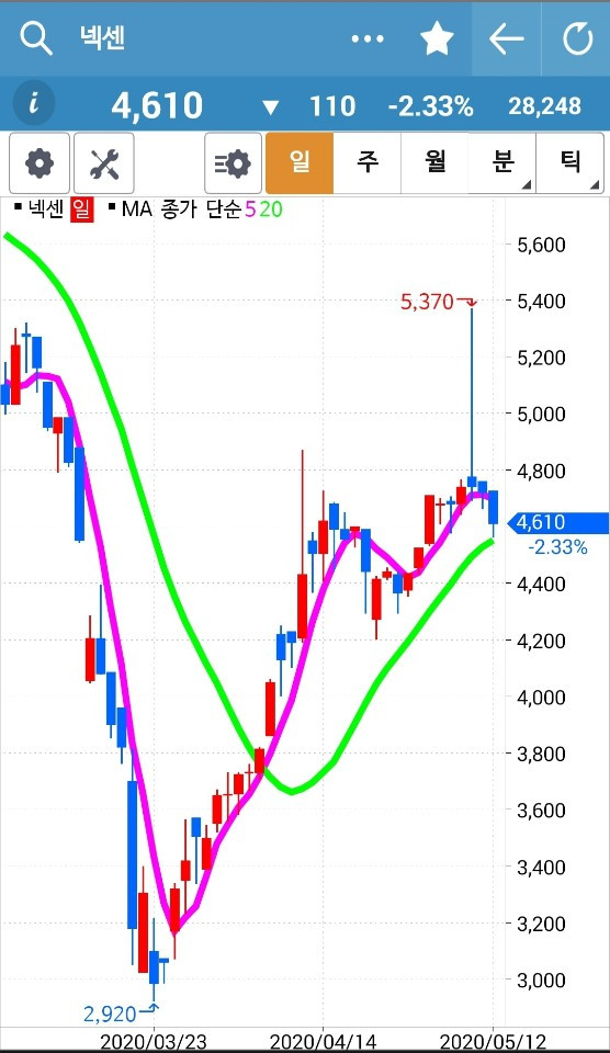 4천 원짜리 딱 한 개로 구경하고자 하는 이것. 역시 이상한 그림은 이상하게 가나보다. 그래도 20일선을 딱 부닥쳤는데 이제 어떻게 될까? 그대로 내려갈까? 단 한 주일지라도 20일선을 뚫고 아래로 내려가면 그땐 매도하리라. 난 훈련 중이니까 액수가 개수가 중요한 게 아니야. 이런 식으로 과연 되는지 직접 하면서 알아보고픈 거니까. 파이팅.