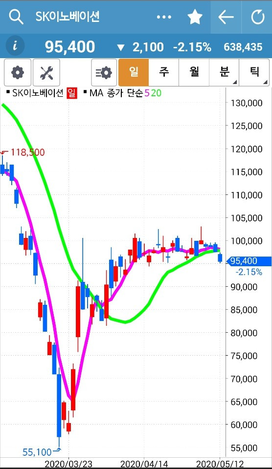 가격이 저렴하다고 맘껏 들어갔더니 하하 20일선 아래로 가볍게 내려온다. 물론 주가만 내려왔지 아직 5일선이 20일선 아래로 내려온 것은 아니니까 아직 행동개시는 아니다. 내일이라도 5일선이 20일선 아래로 내려오면 그때 매도다. 그럼. 난 할 수 있다. 손실에 눈 딱 감고 실행하리랏. 난 그걸 훈련 중이닷.
