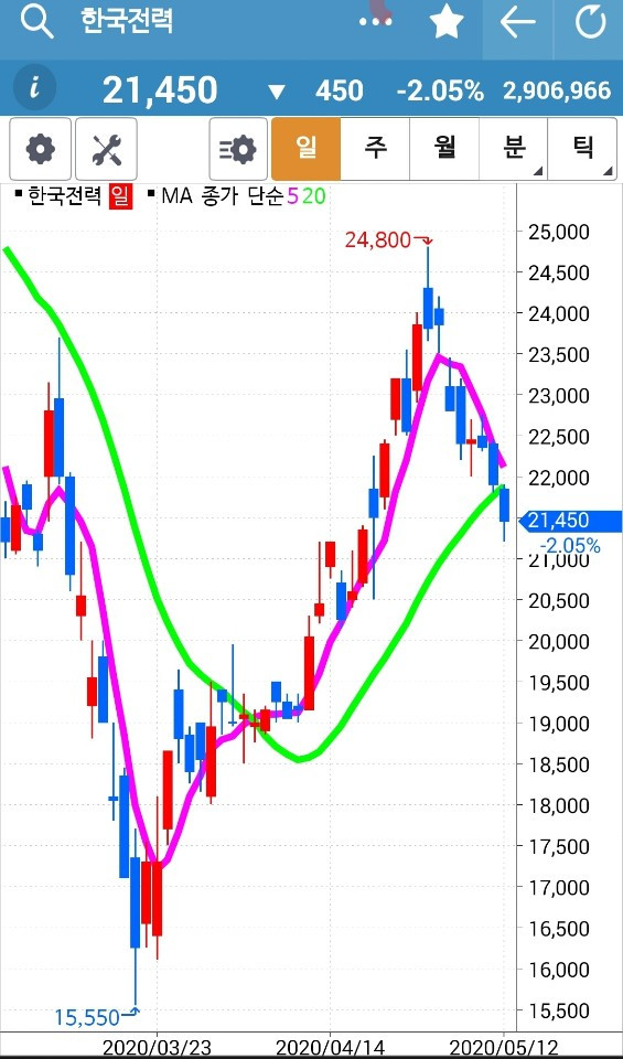 20일선을 지키지 않을까 해서 매수했는데 아니었다. 그렇지. 어쩐지 어제의 긴 음봉이 걸리더라니. 오늘 또 긴 음봉이 나오며 주가가 20일선 밑으로 내려왔다. 지지될 줄 알았던 20일선이 가볍게 무너진 것이다. 내일은 5일선이 20일선 아래로 고꾸라지지 않을까. 그래. 그건 그때 가서 생각하자. 고꾸라졌을 때 행동하면 된다. 오늘까지는 아직 5일선이 위에 있으니까 무사통과. 오케이. 20일 선을 부딪는 다고 꼭 사고 볼 일은 아니구나.