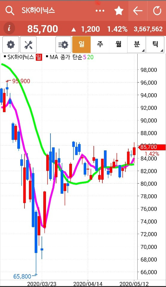 오호 바로바로 요런 모습. 20일선에 딱 부딪고 빵 튀어 오르는 이 모습을 기대한 건데 그중 요것 하나 만이 기대하는 모습을 보여주었다. 그런데 다른 것들은 20일 선 아래로 주가가 쭉 미끄러져버렸다. 에고고고다.