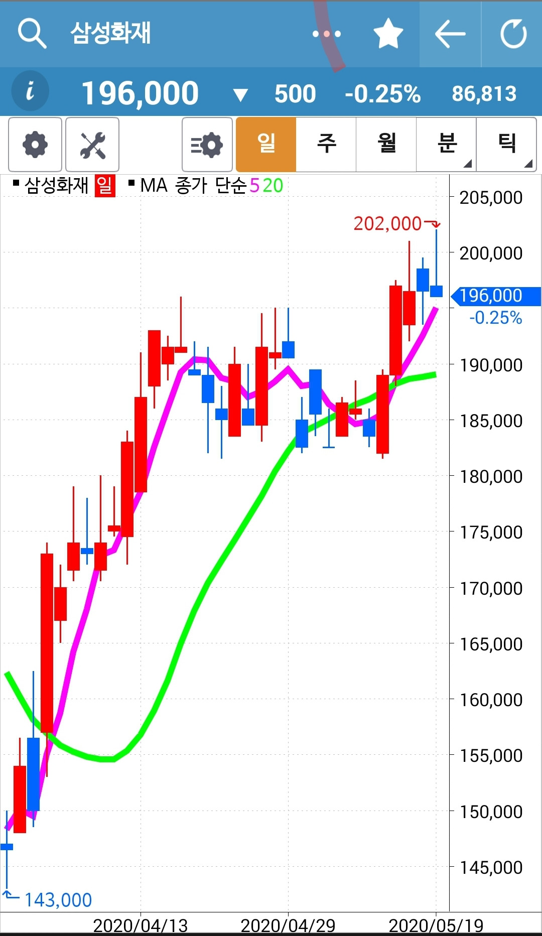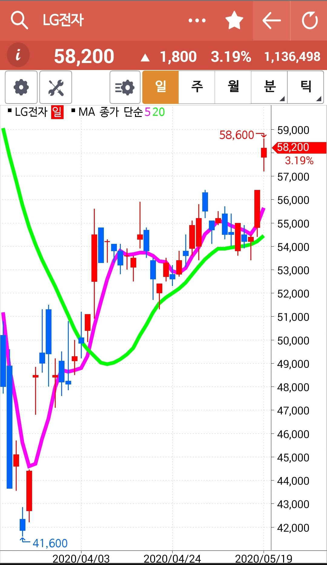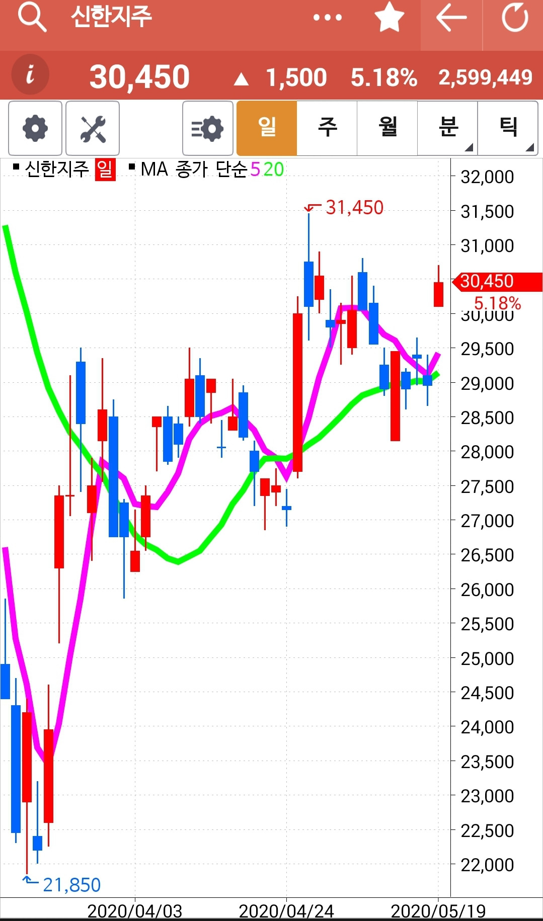 캬~ 이렇게 강하기 위해선 20일선을 아래로 뚫지 않고 지지되는 게 중요한가 보다. 흠. 멋지게 상승하고 있다. 그렇지. 그래야지. 5일선이 위니까 당연히 매수 유지.