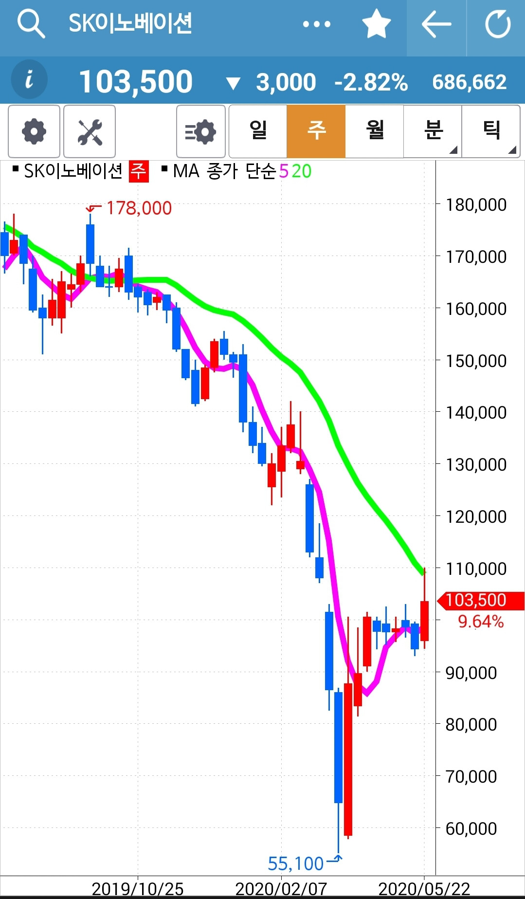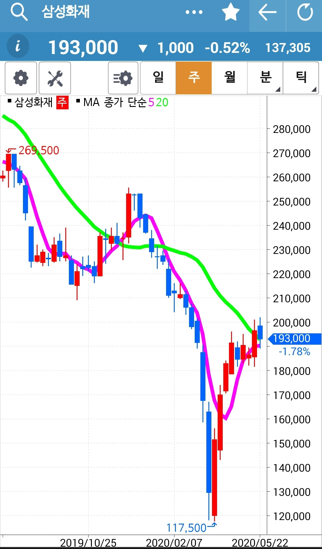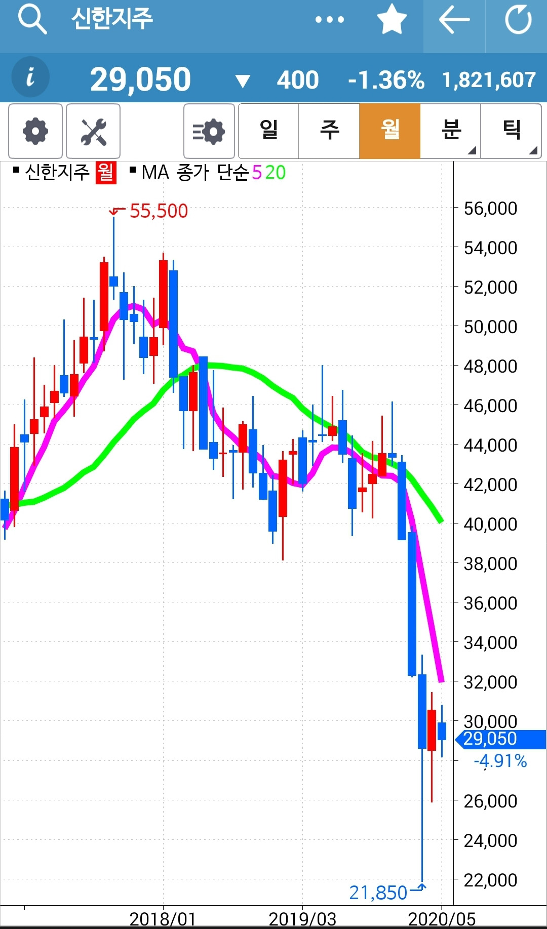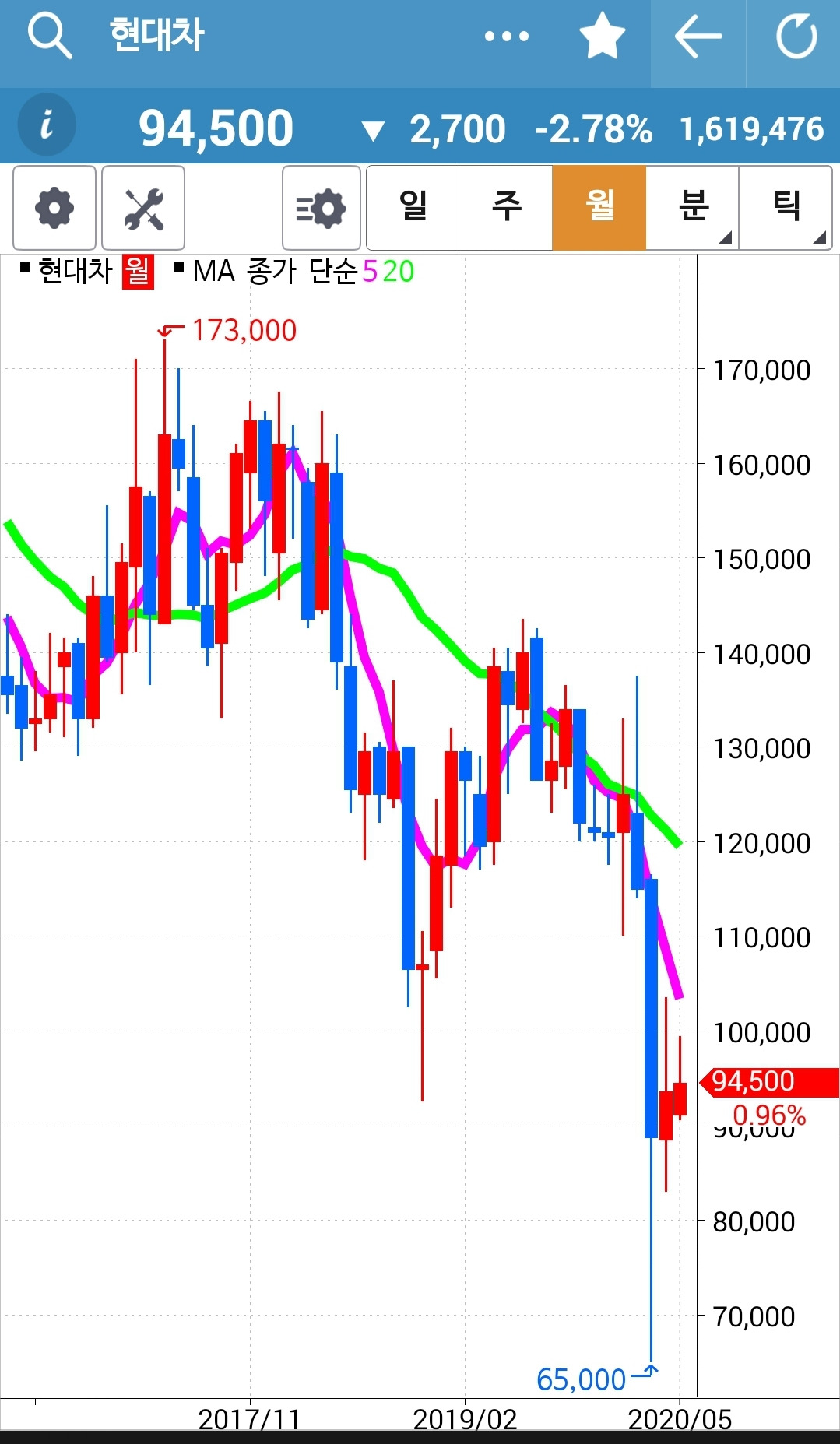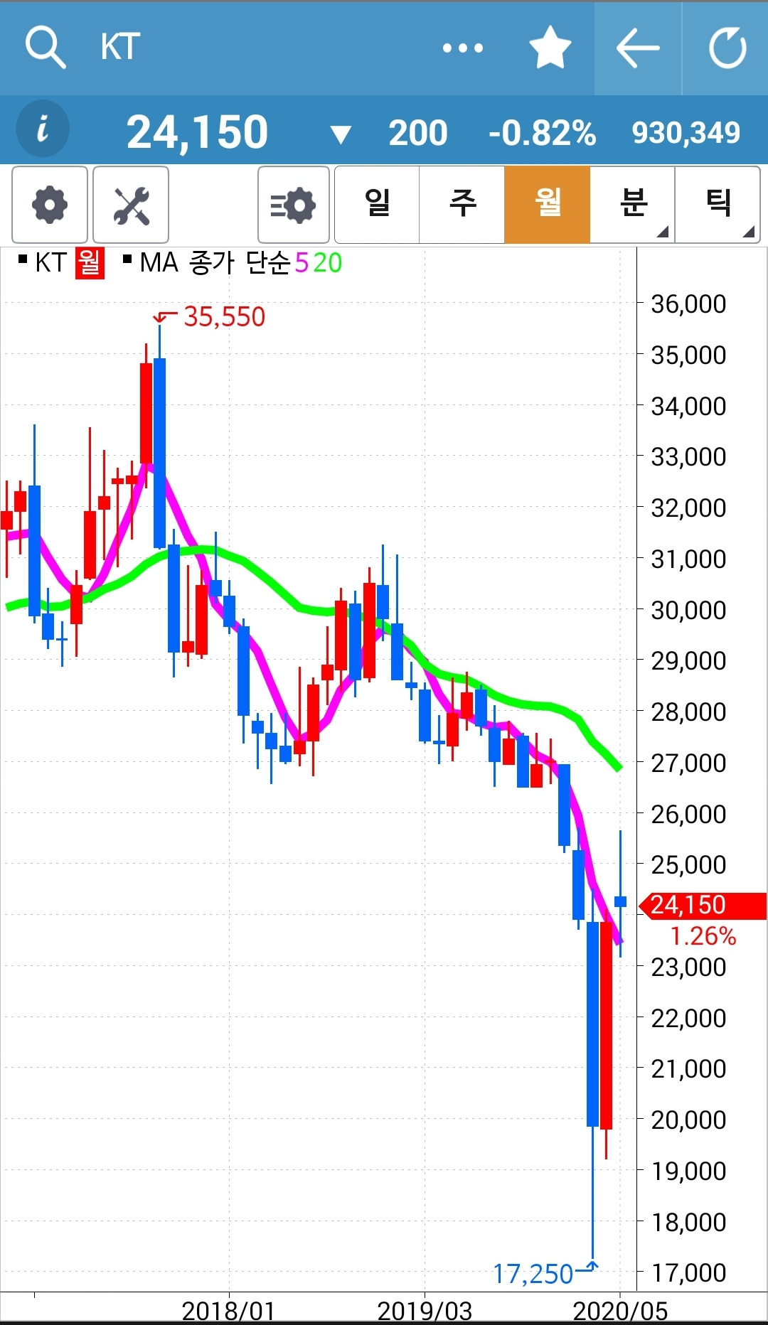 5일선이 20일선을 빵 뚫고 올라가 기쁨으로 매수하게 하더니 당장에 손실을 줄게 뭐람. 에고 갭하락에 긴 음봉. 그래도 어떡하나. 5일선이 20일선 위에 있음에 희망을 갖고 매수 유지! 주봉을 보면 살짝 위로 방향을 튼 5 주선이 다시 아래로 바뀌고 있다. 쭈욱쭉 올라가던 20 주선은 아래로 아직 힘차게 내려오는 중이고. 모두 돌리려면 시간 좀 꽤 걸리겠다. 난 왜 이렇게 장기적으로 내려가는 종목들만 가지고 이러고 있을까? 그러나 구체적으로 재무사항을 보지 않고도 그냥 막연히 망하지 않을 것 같은 큼지막한 회사라는 이유만으로 안심하고 들어갔다. 즉 게으름의 극치인 것이다. 종목 골라내는 수고도 좀 할 필요가 있다. 그러나 아직은 10분 이상을 투자하고 싶지 않다. 3시 20분부터 딱 십 분만 투자하리라. 나머지 시간을 여기 매달려있지 않으리라. 그러니 할 수 없다. 이렇게 할 밖에. 장기적으로 내려가고 있는 주식들이라 이렇게 여차하면 손실을 기록하는 것일 수도 있다. 월봉을 최근으로 확 크게 넓히니 구체적으로 보인다. 잘했다. 하하