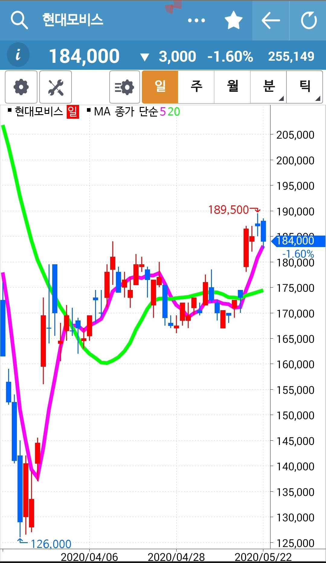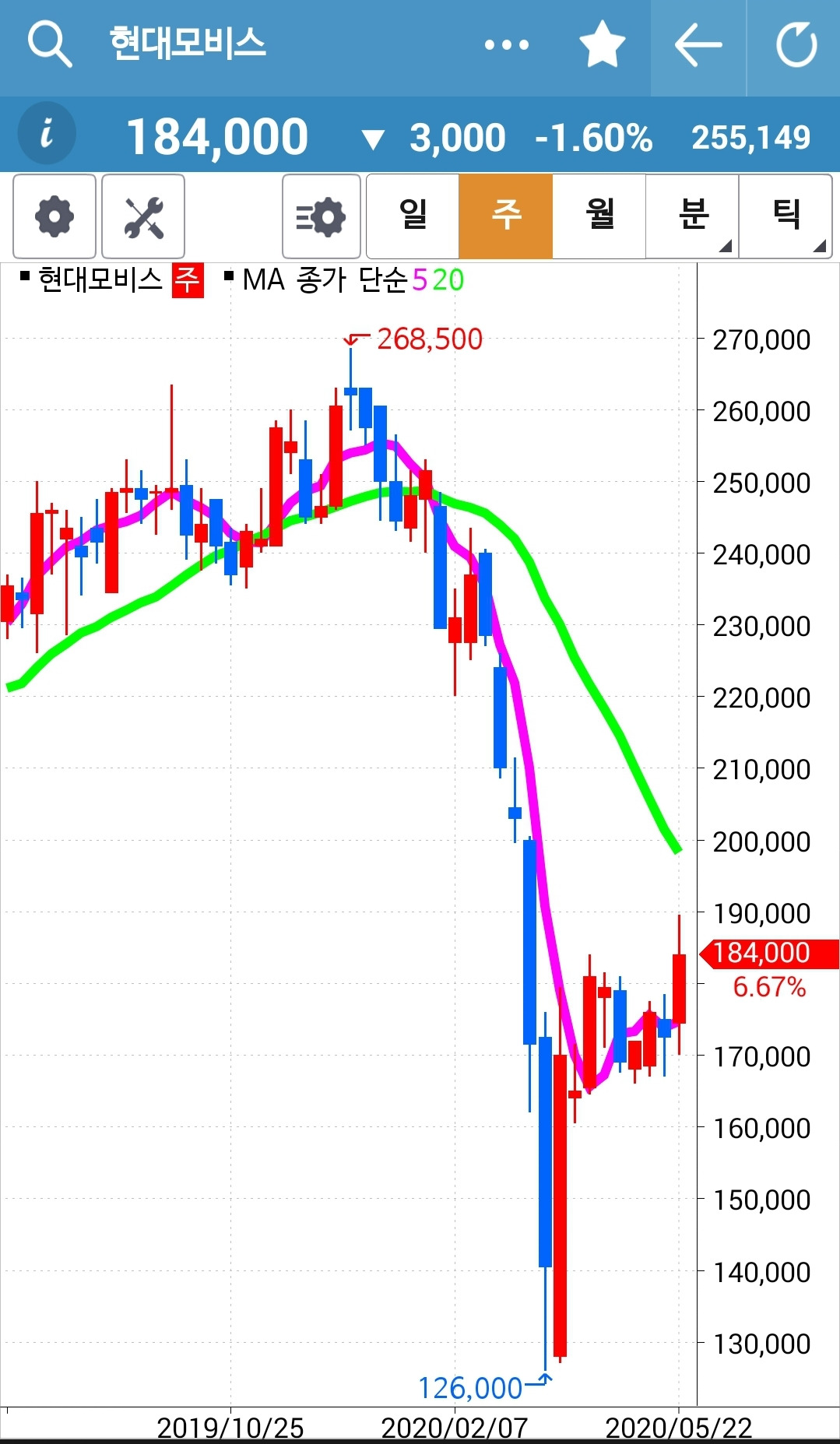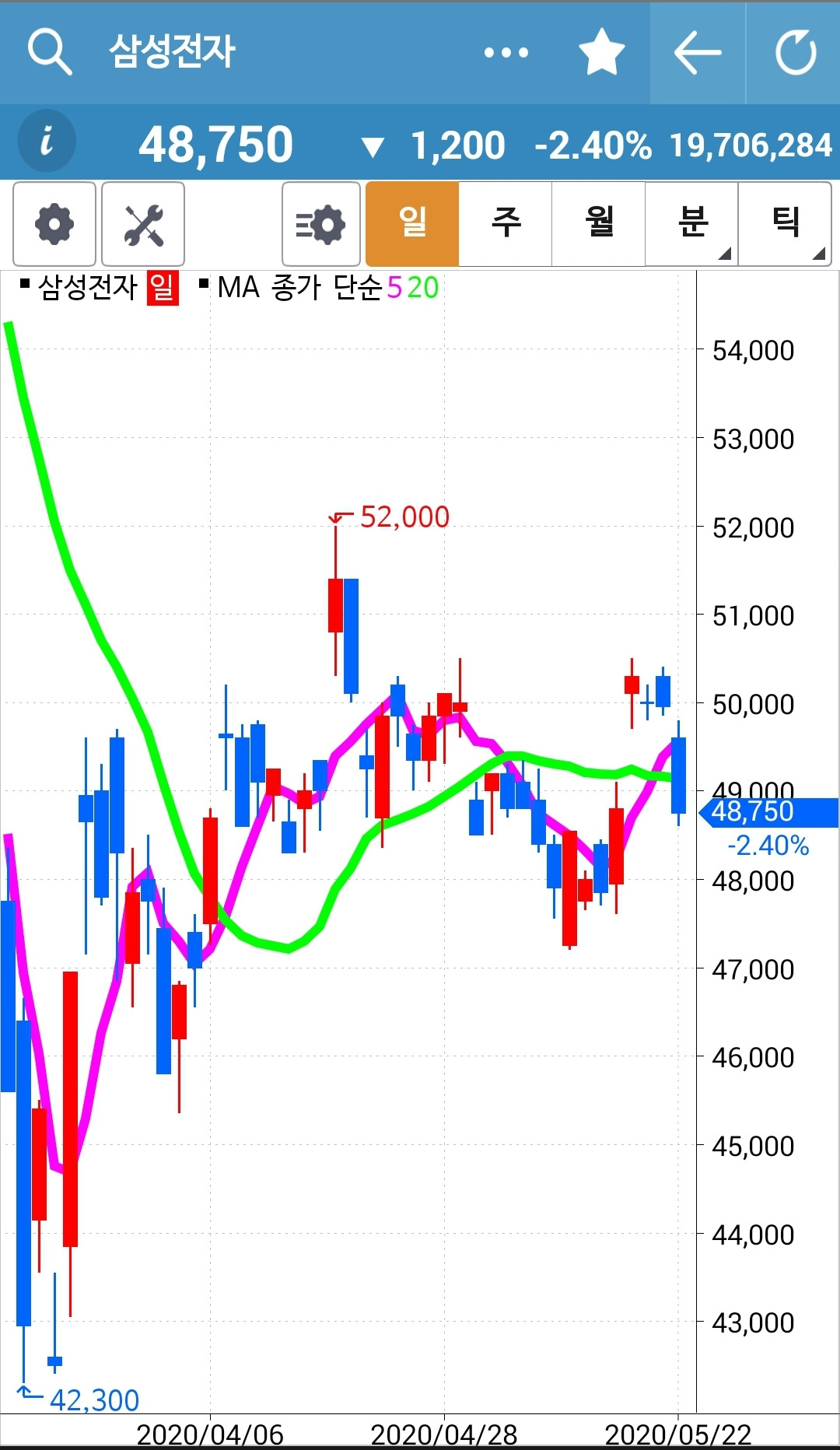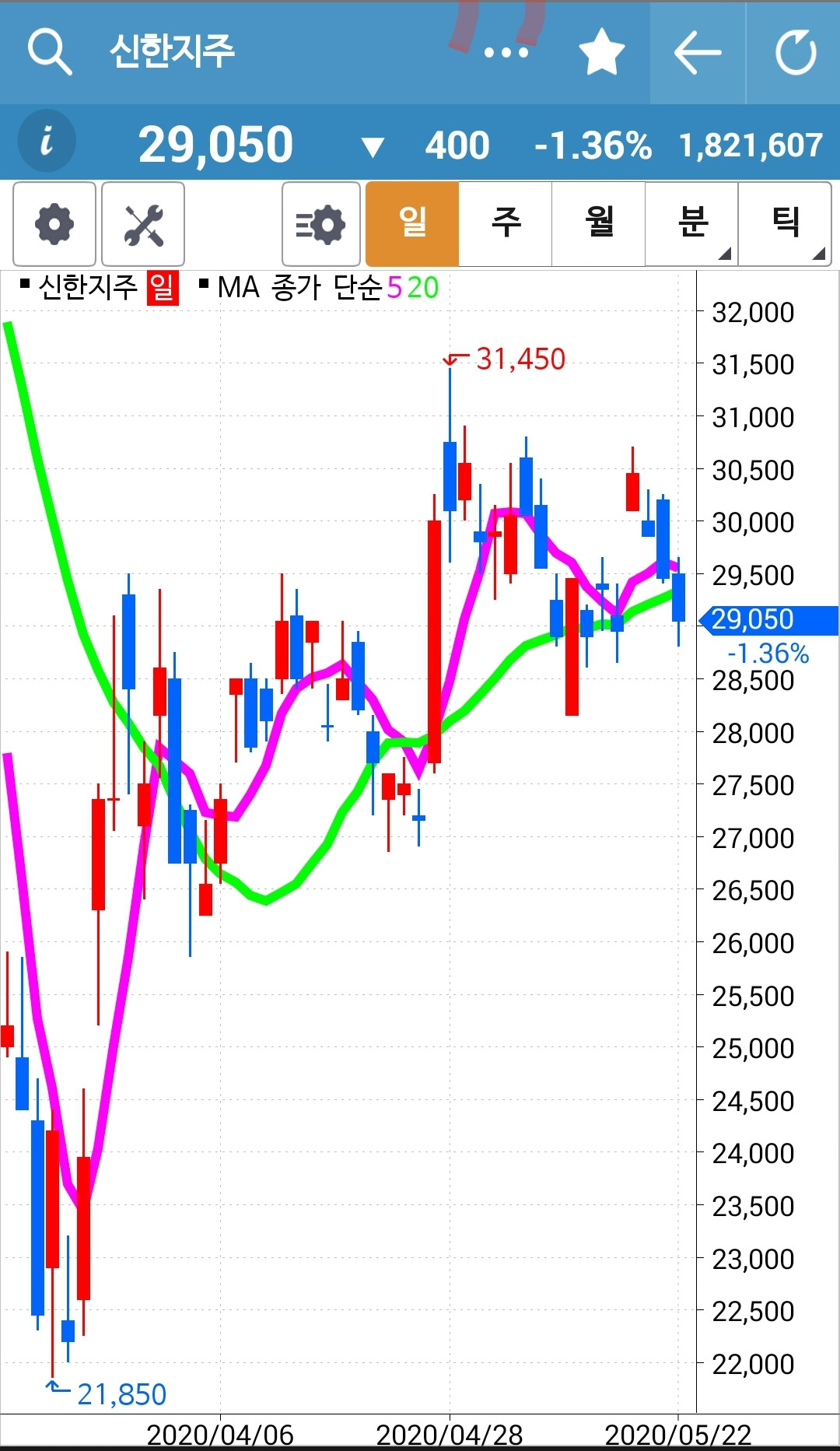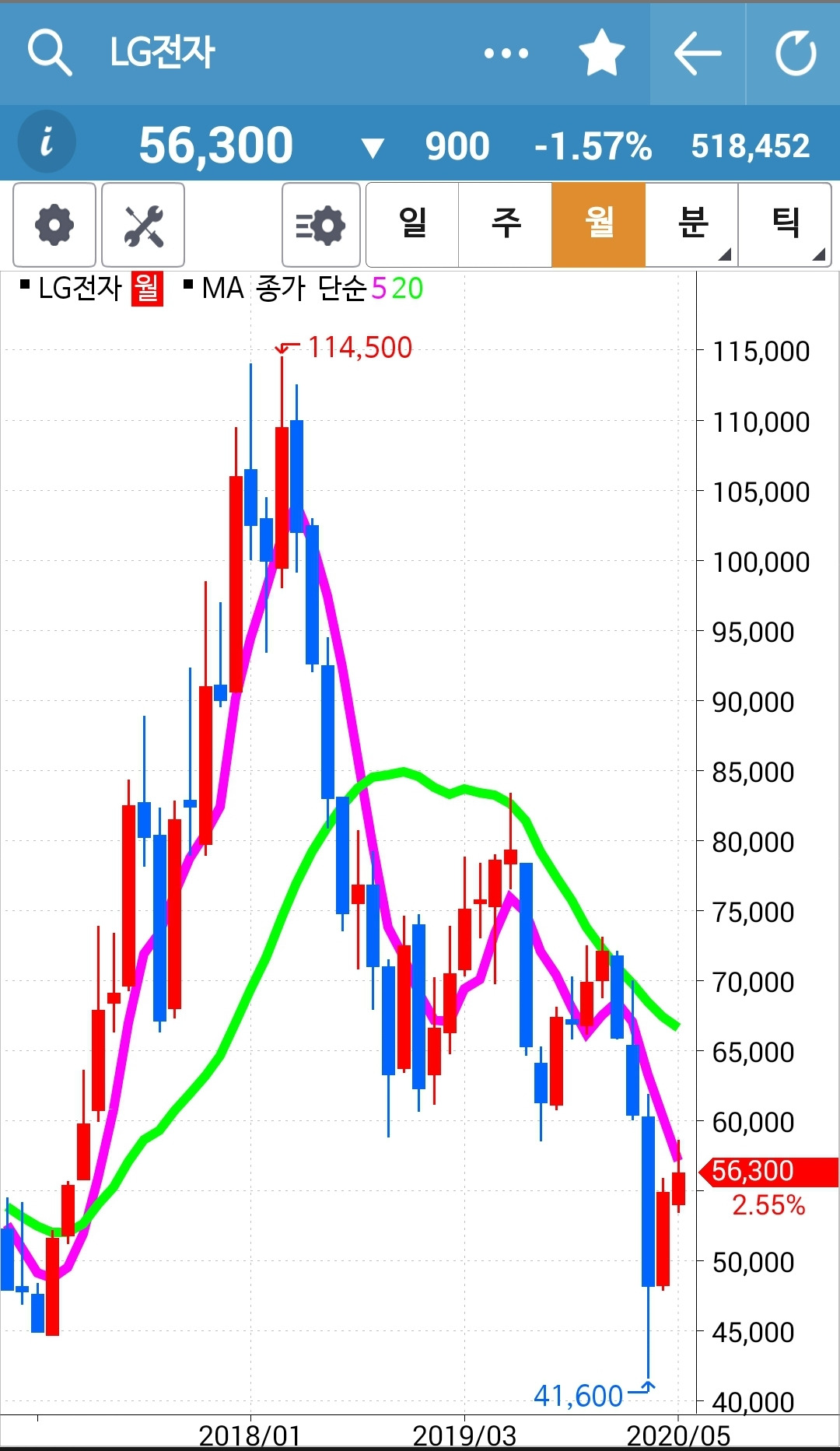 5일선이 20일선과 거리가 많이 벌어지면 그 간격을 좁히러 내려오는 것일까. 구불 탕 구불 탕 고개를 그리며 올라가고 있으니까. 그러려니 하자. 5일 선도 위로 향하고 20일 선도 위로 향하고 있는데 무엇이 걱정 일꼬. 그래. 난 일봉으로 매매하니까 이 5일선이 20일선 아래로 내려오는 순간 매도하기만 하면 된다. 그 나머지 순간엔 관람 그저 구경할 뿐이다. 주봉을 보니 5 주선이 위로 향하고 있고 20 주선에 딱 부딪히며 조정받고 있는 모양새. 역시 그런 중요 이평선들은 지지선이나 저항선 역할을 하는구나. 월봉은 모두가 아직 내려가는 상태. 겨우 양봉을 기록했을 뿐이구나. 그것도 긴 음봉에 못 미치는 작은 양봉을. 어찌 변하는가 계속 지켜보자. 하하 재밌다.