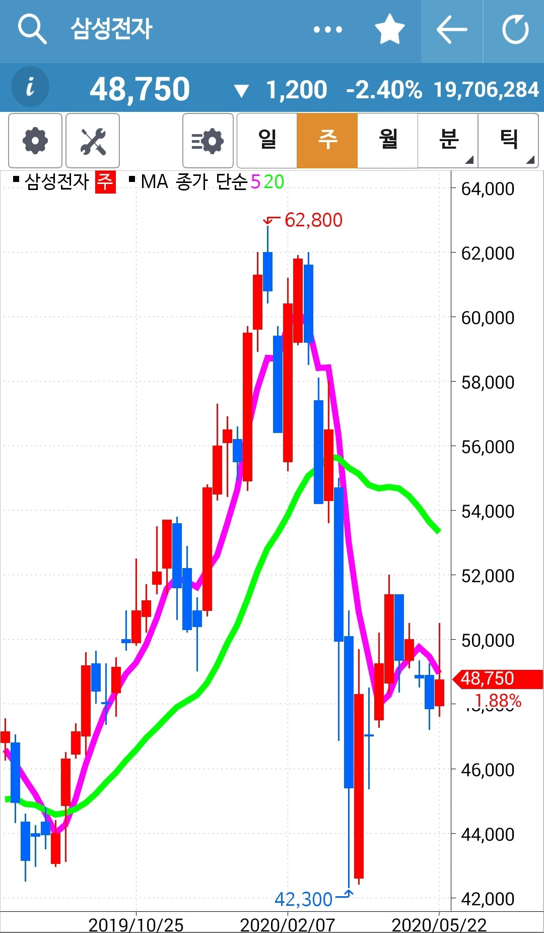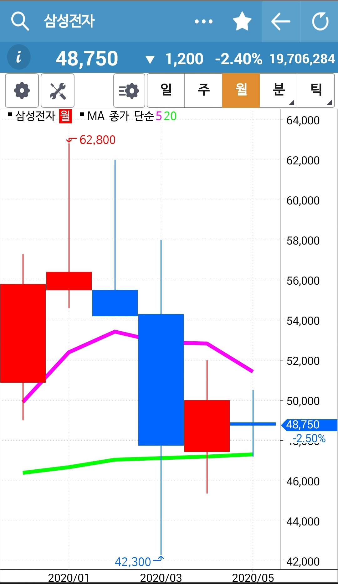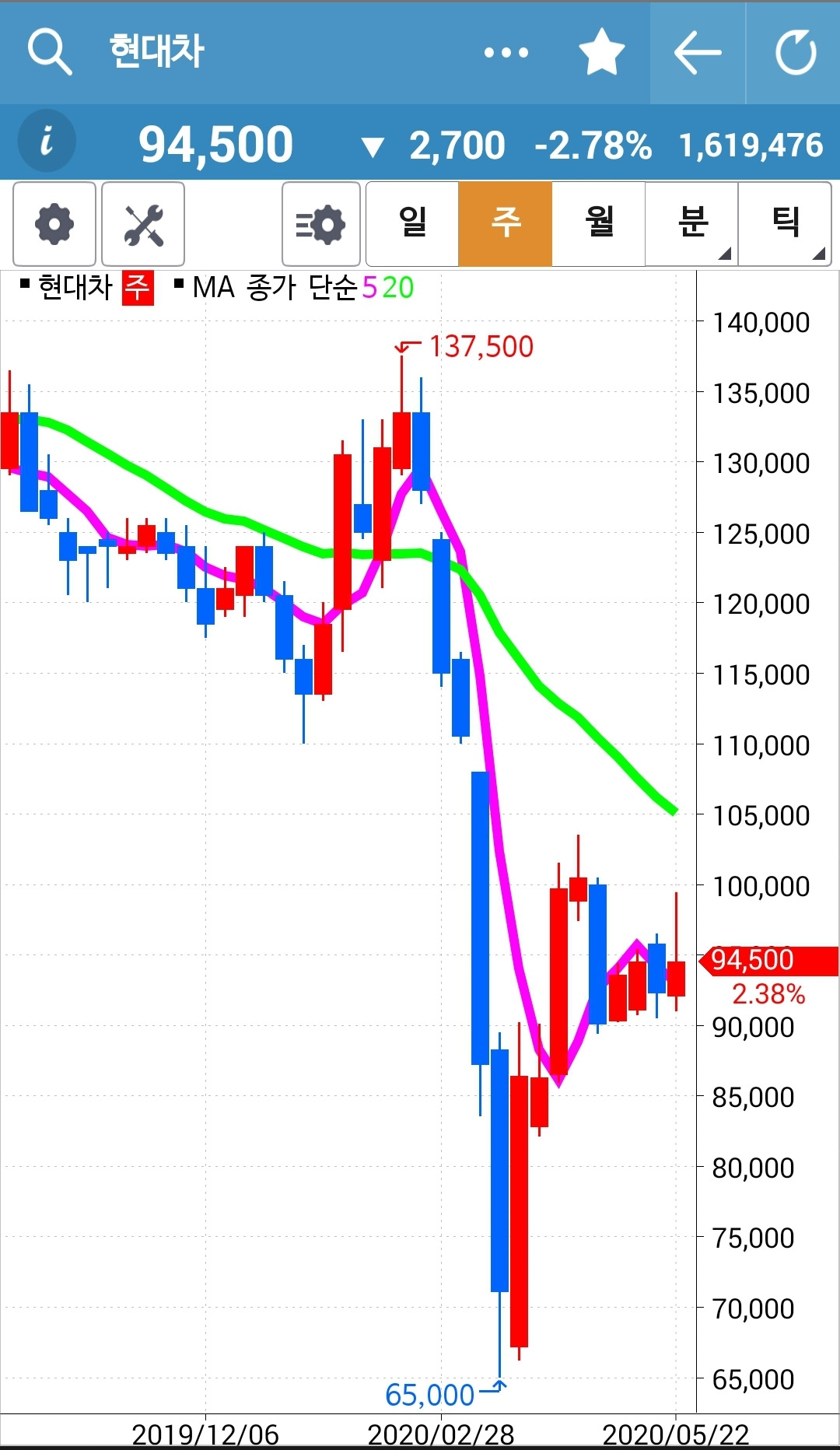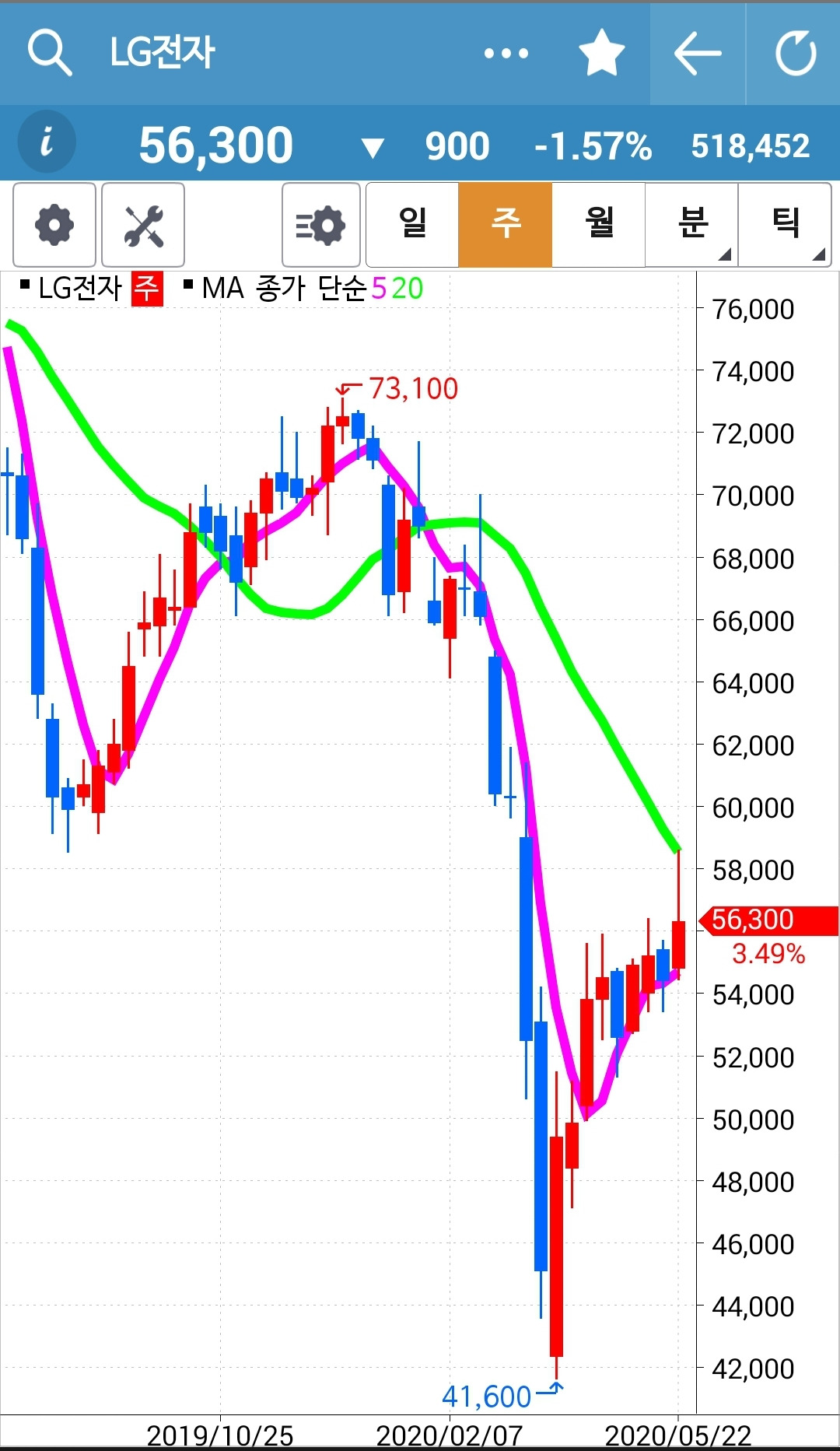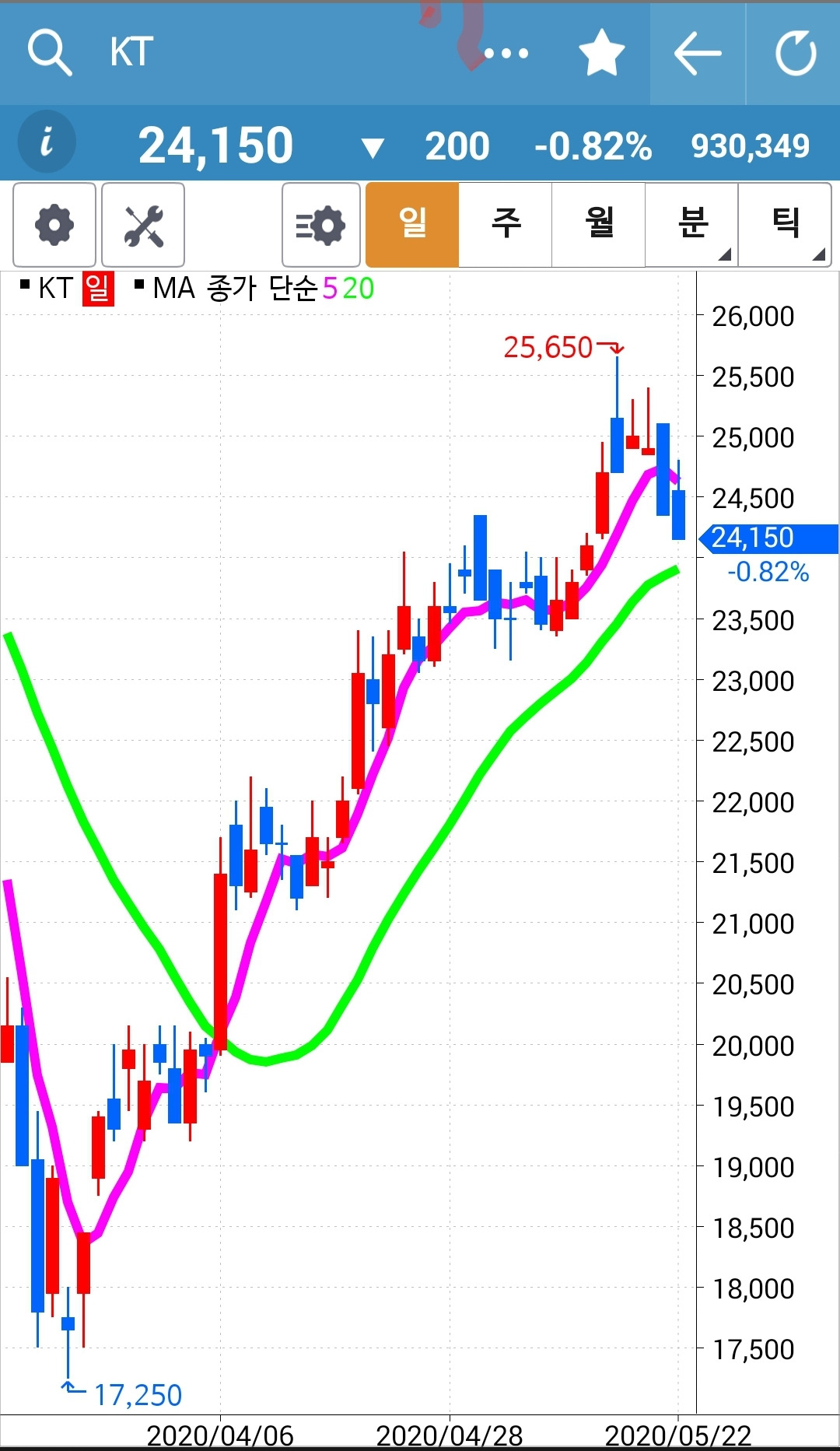 5일선이 20일선과 거리가 많이 벌어지면 그 간격을 좁히러 내려오는 것일까. 구불 탕 구불 탕 고개를 그리며 올라가고 있으니까. 그러려니 하자. 5일 선도 위로 향하고 20일 선도 위로 향하고 있는데 무엇이 걱정 일꼬. 그래. 난 일봉으로 매매하니까 이 5일선이 20일선 아래로 내려오는 순간 매도하기만 하면 된다. 그 나머지 순간엔 관람 그저 구경할 뿐이다. 주봉을 보니 5 주선이 위로 향하고 있고 20 주선에 딱 부딪히며 조정받고 있는 모양새. 역시 그런 중요 이평선들은 지지선이나 저항선 역할을 하는구나. 월봉은 모두가 아직 내려가는 상태. 겨우 양봉을 기록했을 뿐이구나. 그것도 긴 음봉에 못 미치는 작은 양봉을. 어찌 변하는가 계속 지켜보자. 하하 재밌다.