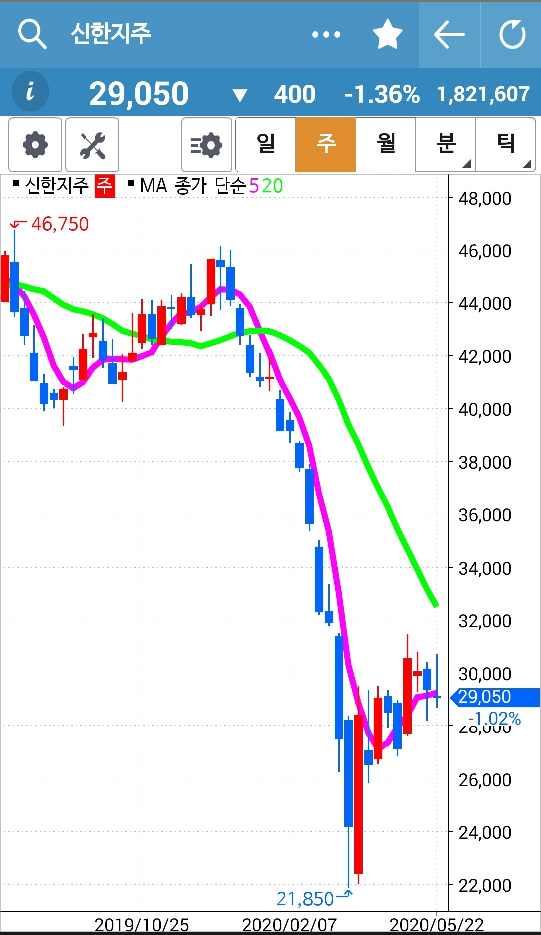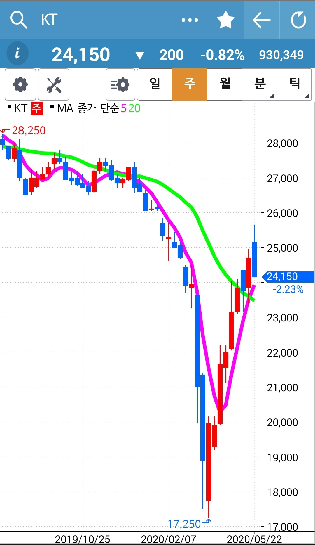 5일선이 쭉 위로 올라가 있는데 긴 음봉. 조심조심할 지어다. 그래도 5일선이 위니까 매수 유지. 주봉을 보자면 5 주선이 방향을 틀고 긴 양봉. 20 주선을 향해 달려가고 있다. 거기까진 가지 않을까. 월봉은 내려오는 중에 5개월 봉에 닿으려 하는구나 정도만 기억하자.