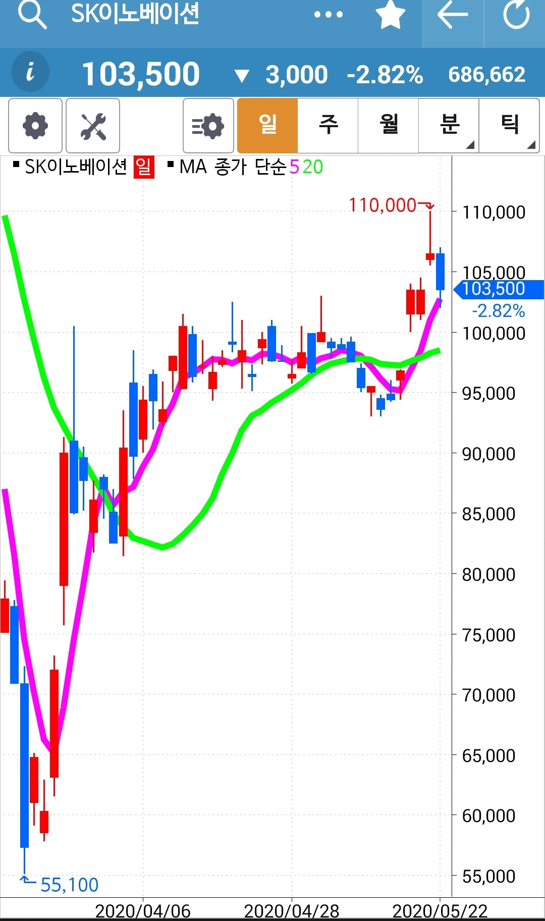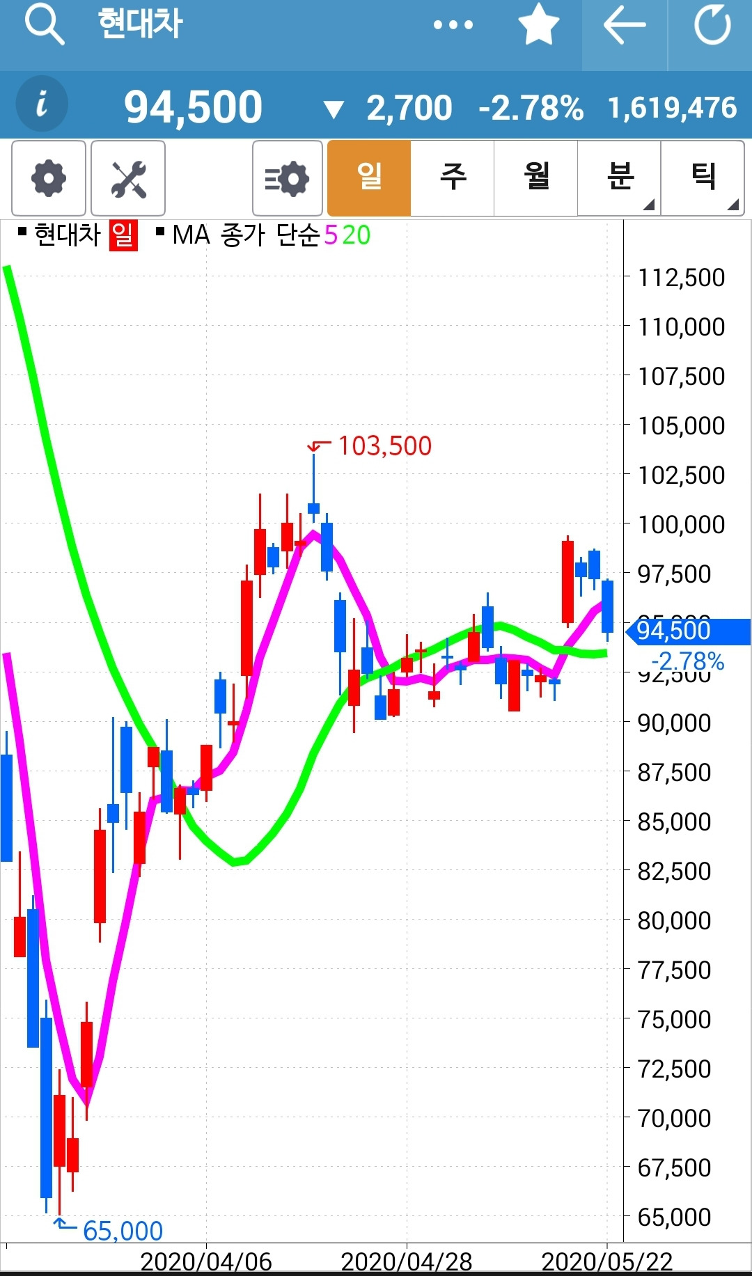신나게 올라가는 이 종목이 20일선을 향해 급하락하고 있다. 에고 고고다. 아직은 5일선이 위에 있으니 매수 유지다. 와우 주봉에선 5 주선이 20 주선을 가볍게 통과했다. 힘이 있구나. 그러나 뚫고 나서 음봉 기록 중. 힘들어 쉬어가는구나 생각하자. 월봉 역시 쭉쭉 내려가던 중에 긴 양봉을 기록하며 하락을 멈추었구나. 그래. 이렇게 주봉과 월봉은 그림을 감상할 뿐 내가 신경 써서 매매에 참고할 것은 오로지 일봉뿐이다. 5일선이 20일선 아래로 내려가면 무조건 매도한다. 오케이. 절대 딴짓 딴생각하지 말 것. 넵!