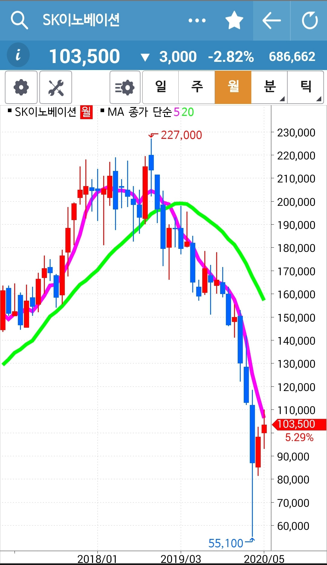 가격이 팍 올랐을 때 사서 손실이 이만저만이 아니다. 그러나 어쩌랴. 그렇게 긴 양봉이 나오는 날 5일선이 20일선을 빵 뚫고 올라갔으므로 매수할 밖에. 주가는 내려오지만 5일선이 20일선 위에 있으므로 매수 유지! 주봉을 보면 곤두박질하던 5 주선이 일단 방향을 틀었다. 상승 시도가 있는 것이다. 하하 그러나 월봉을 보니 아직 한참 내려가는 중이다. 시간은 많이 걸리겠구나 여유를 갖기로 한다. 아무리 그렇더라도 난 일봉으로 매매한다. 그러니까 5일선이 20일선 아래로 내려오는 순간 얄짤없이 매도! 해야 한다. 옛쏠!!!