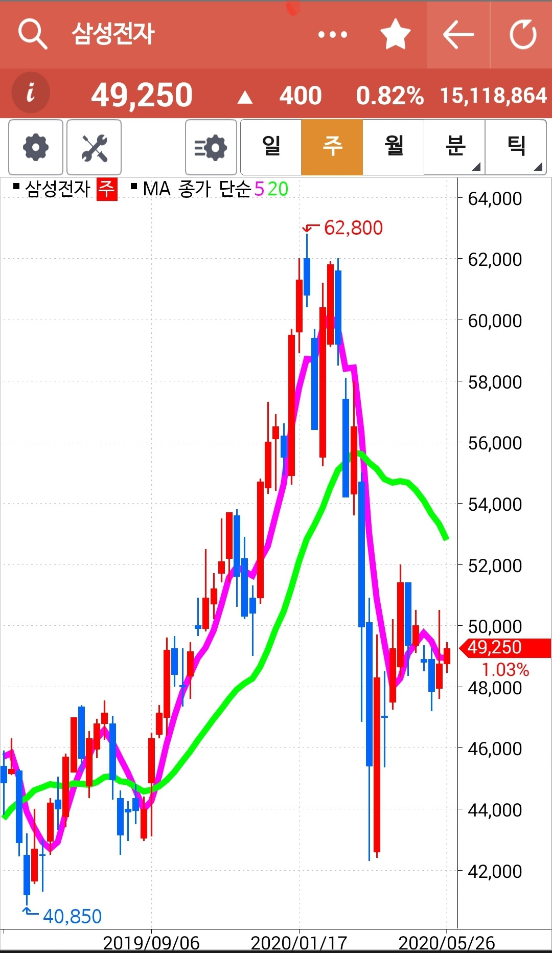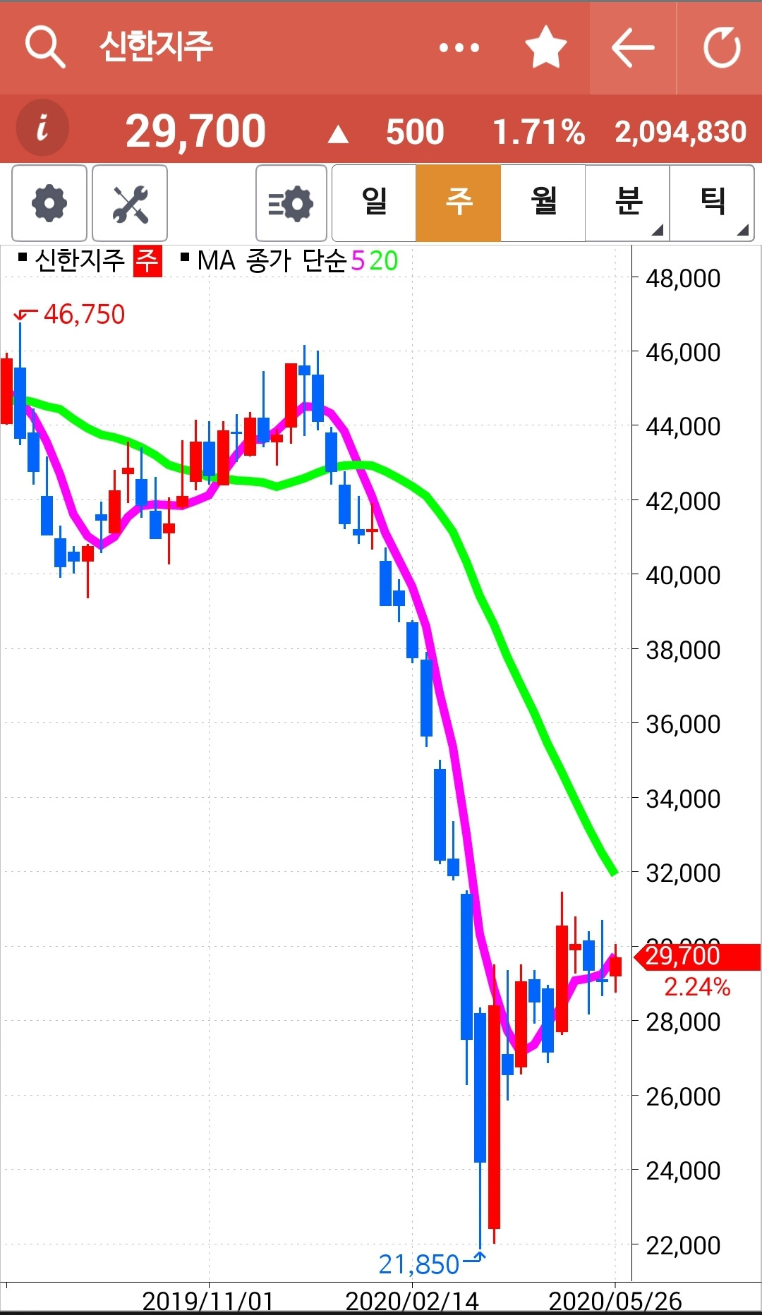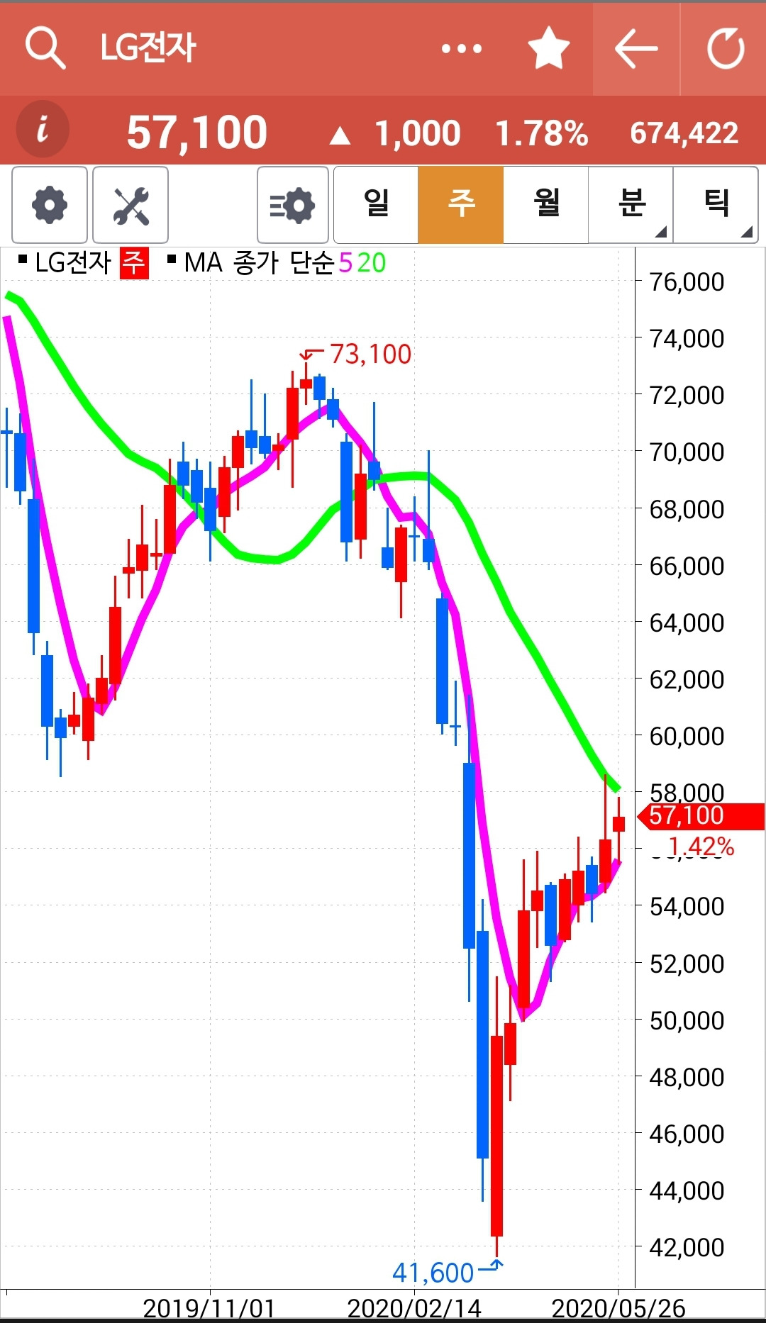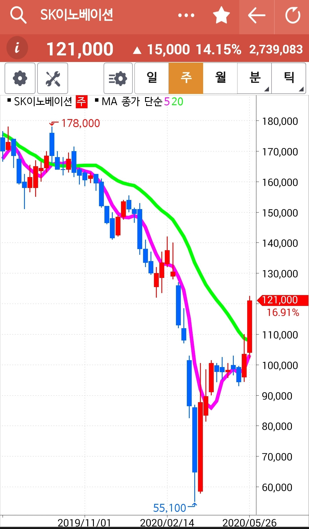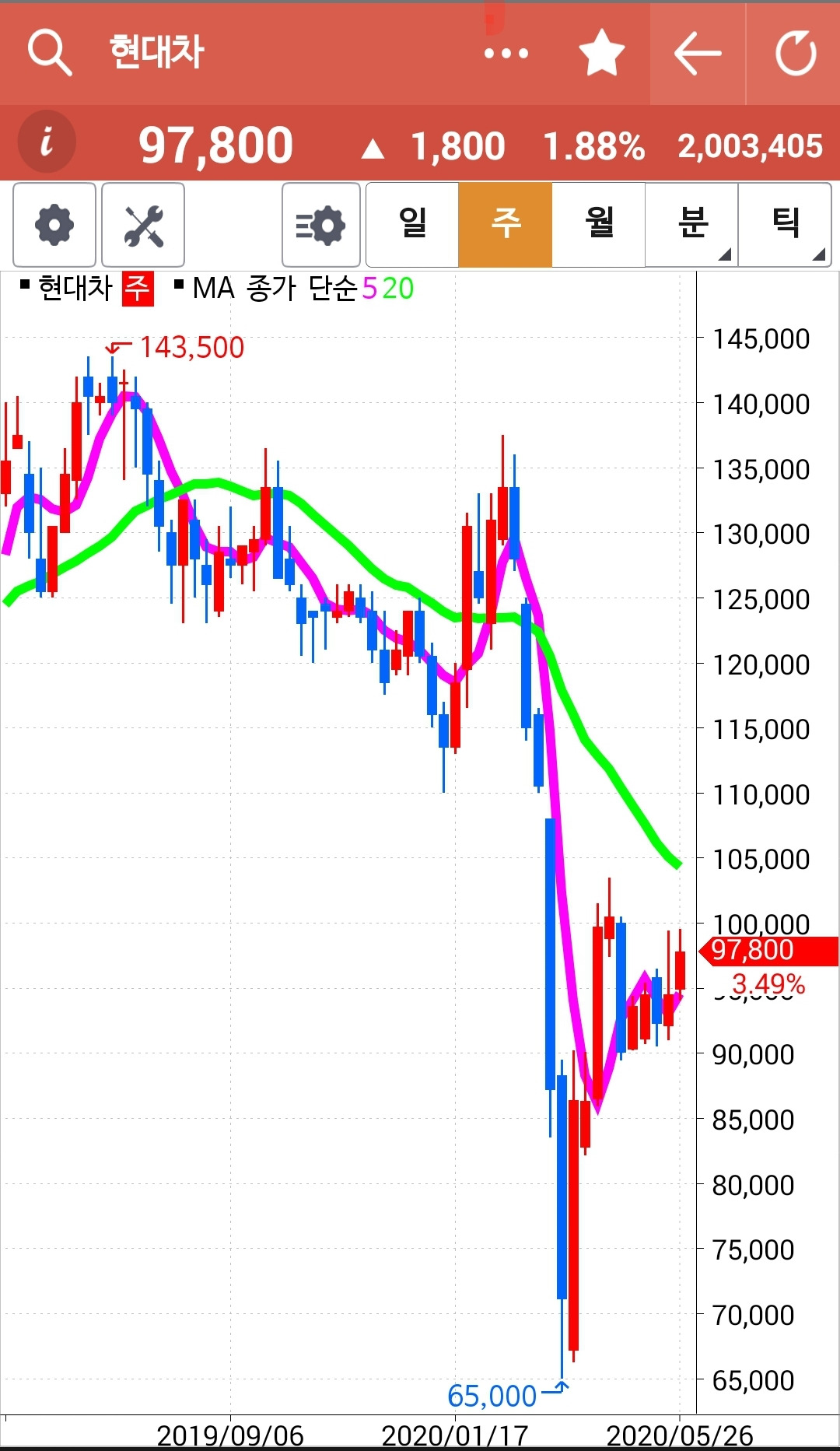 길고도 길었던 하락행진. 정말 반토막 이상이 났었구나. 얼마나 무시무시한가. 여하튼 5일선이 20일선 위에 있으므로 매수 유지. 주봉 5 주선이 하락에서 상승으로 방향을 턴한 것을 주의 깊게 보자.