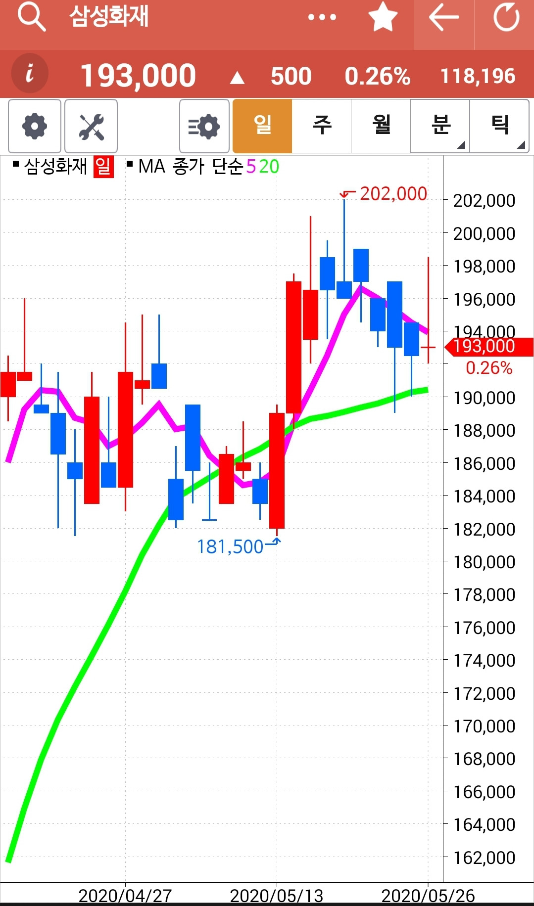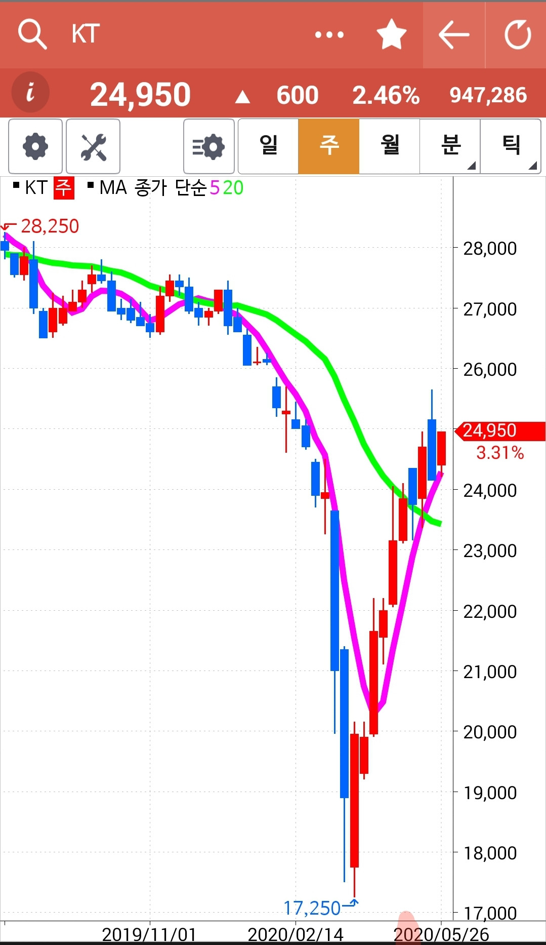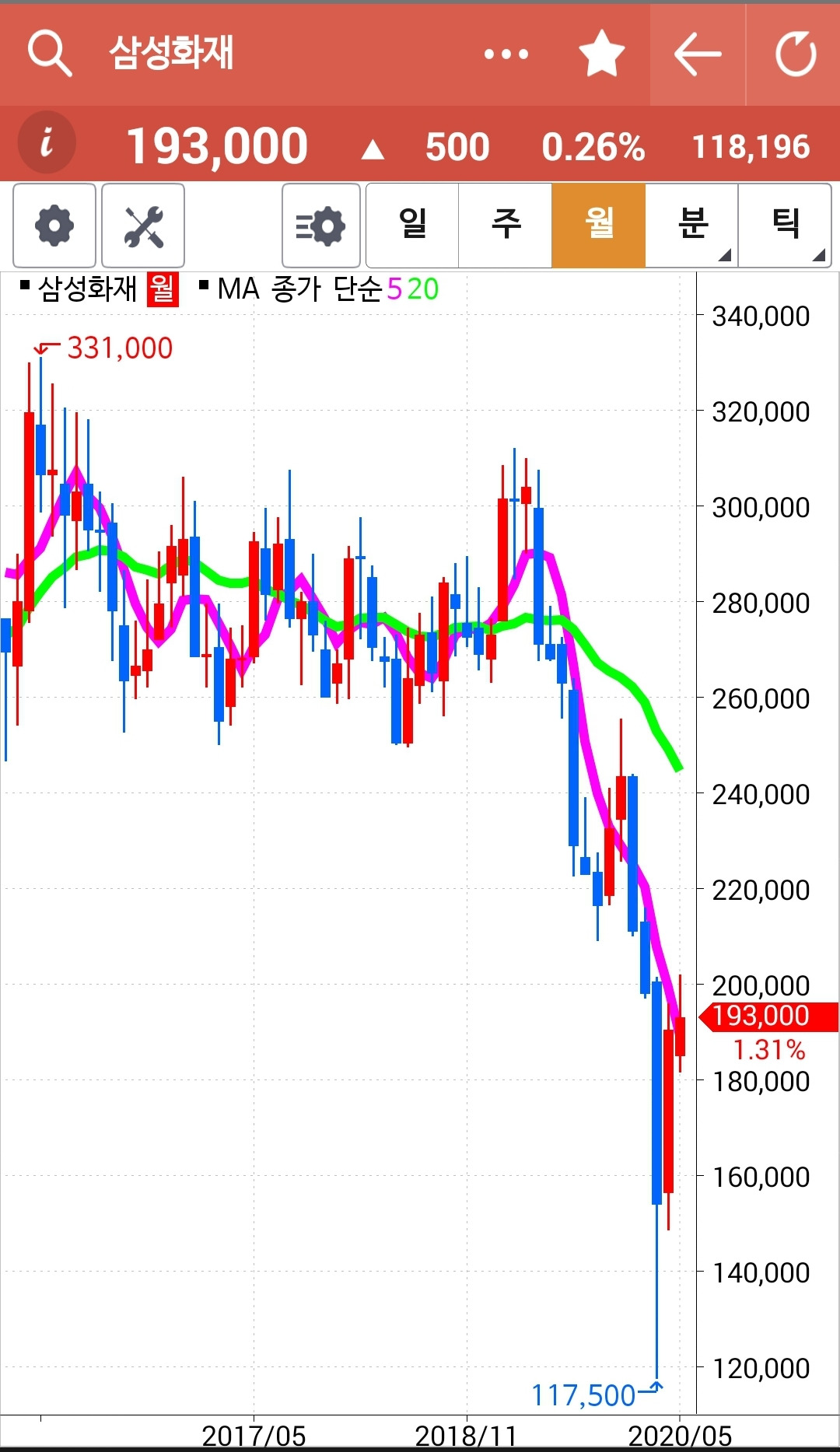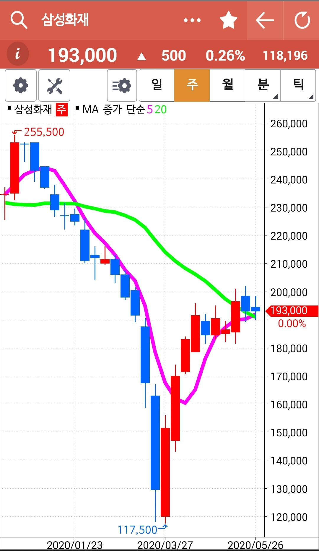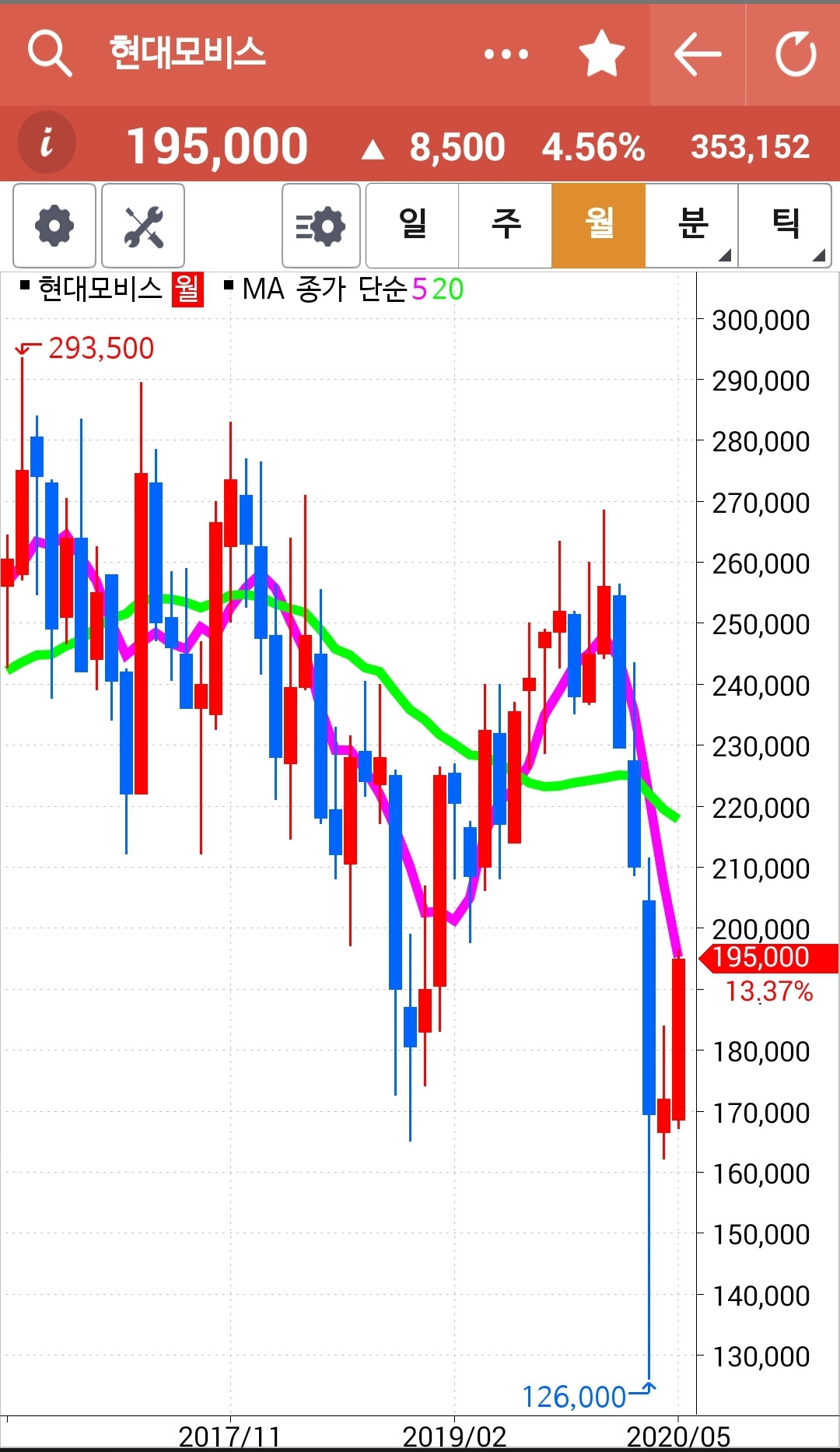 길고도 길었던 하락행진. 정말 반토막 이상이 났었구나. 얼마나 무시무시한가. 여하튼 5일선이 20일선 위에 있으므로 매수 유지. 주봉 5 주선이 하락에서 상승으로 방향을 턴한 것을 주의 깊게 보자.