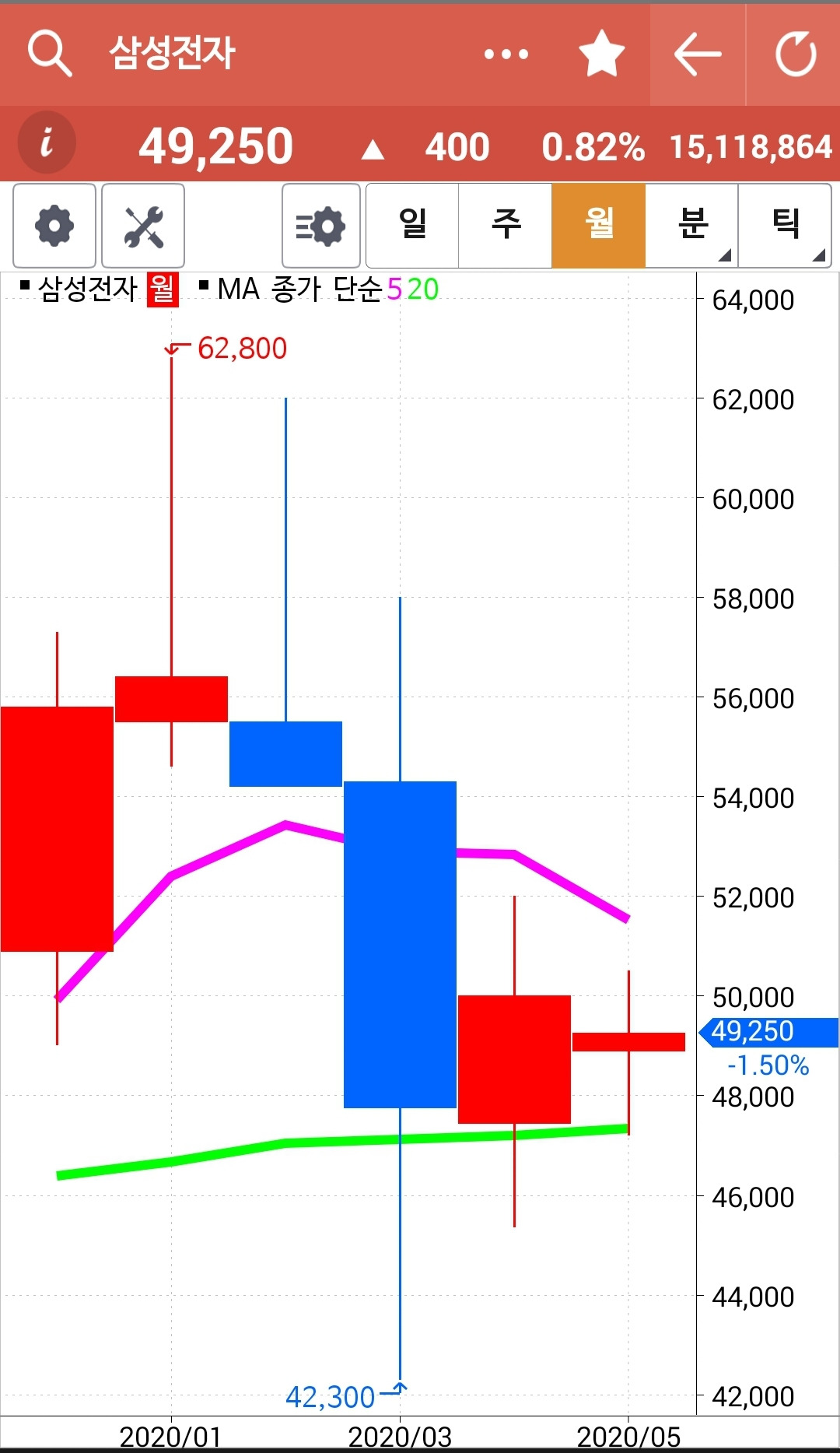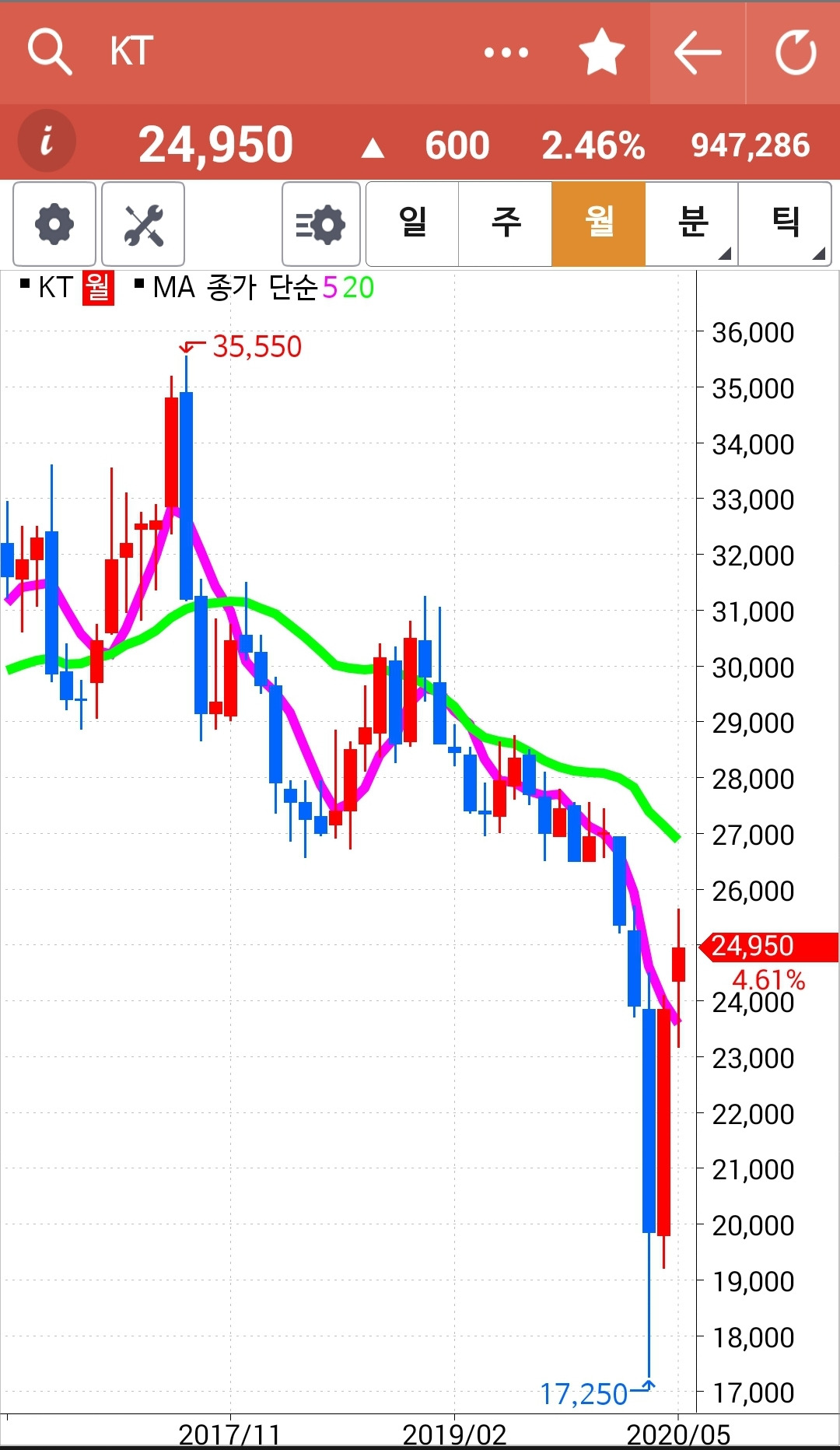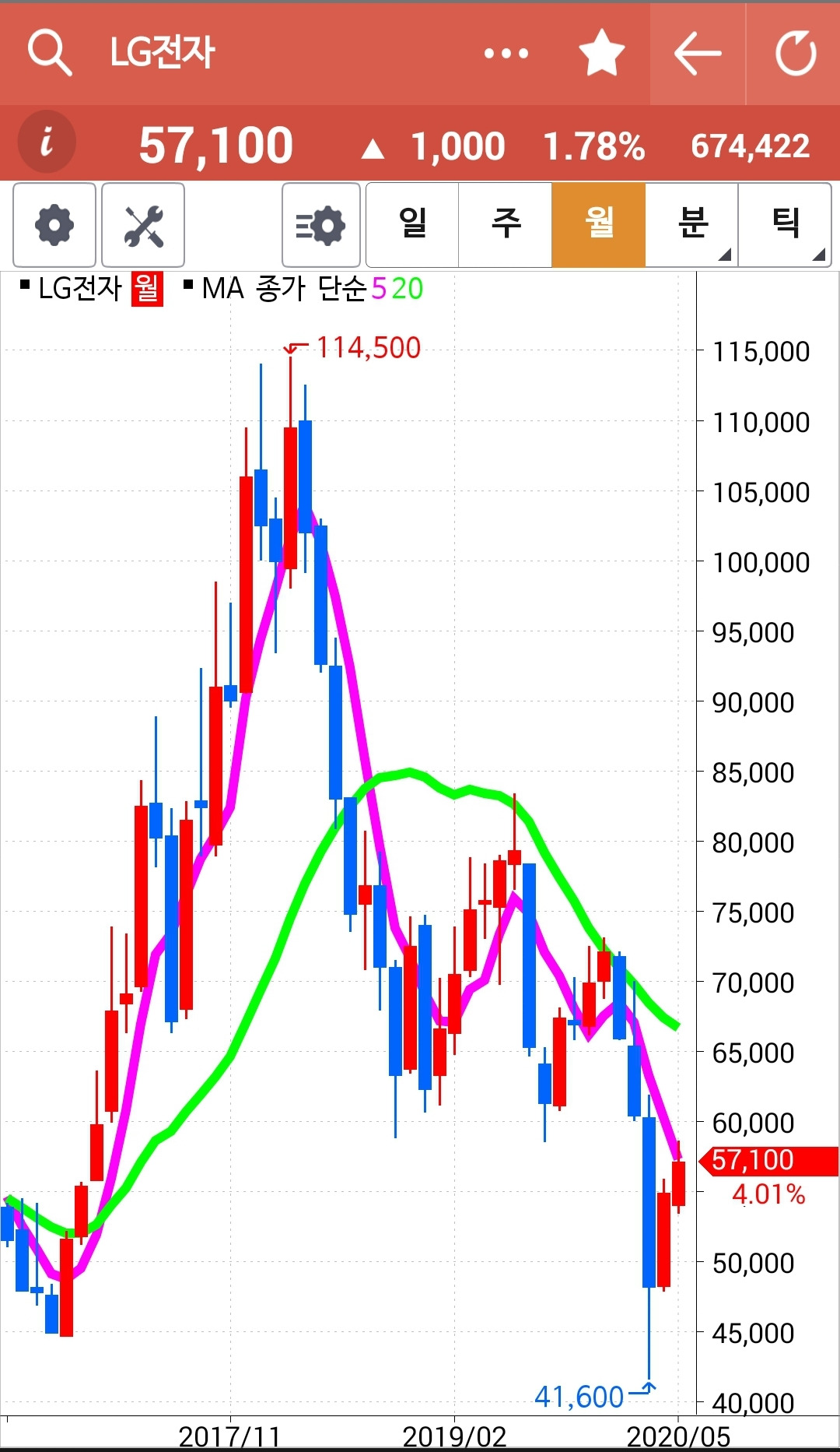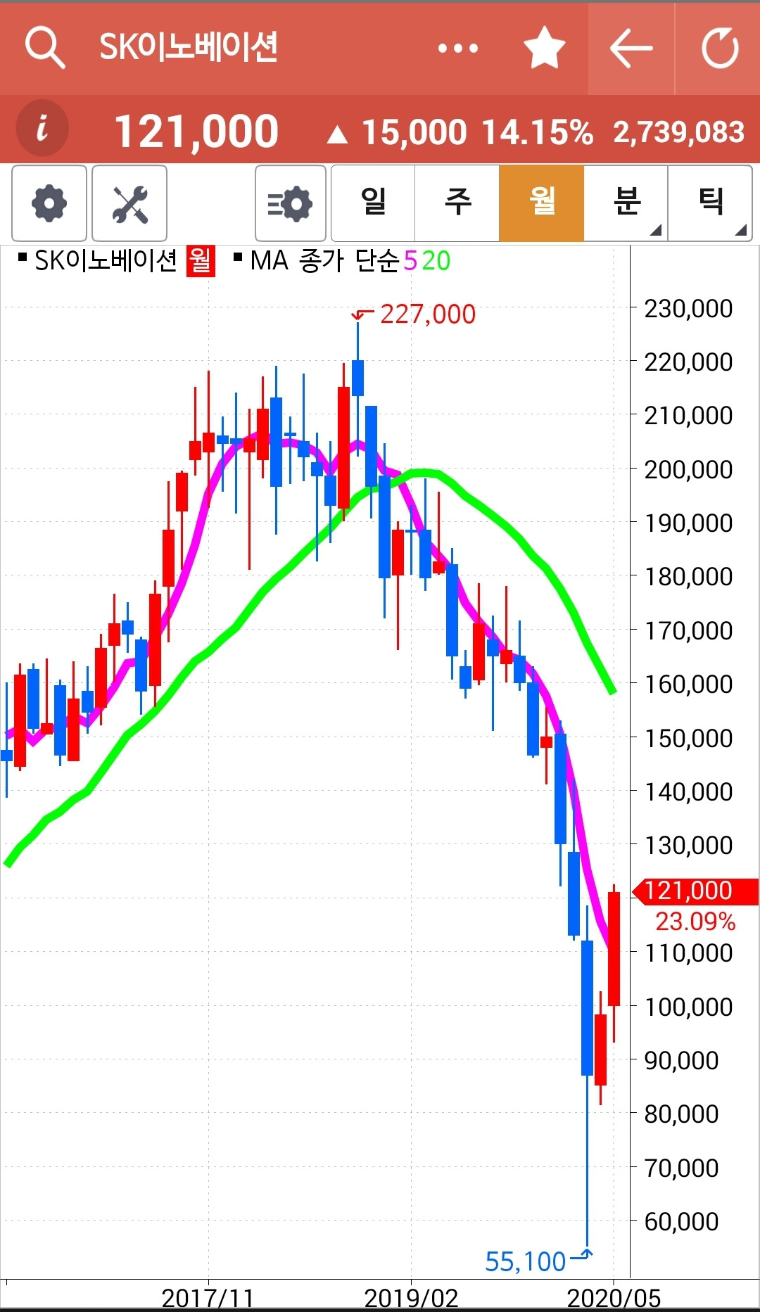 오홋. 일봉은 아주 신나게 올라가는 모습. 구비구비 고점 높이고 저점 높이고 좋아요. 5 주선은 위로 쭉쭉 향하고 있으나 내려오는 20 주선과 딱 마주치게 되는 게 문제. 월봉은 여전히 5개월선 20개월선 모두 하향이라는 것도 문제. 잘 지켜보자.
