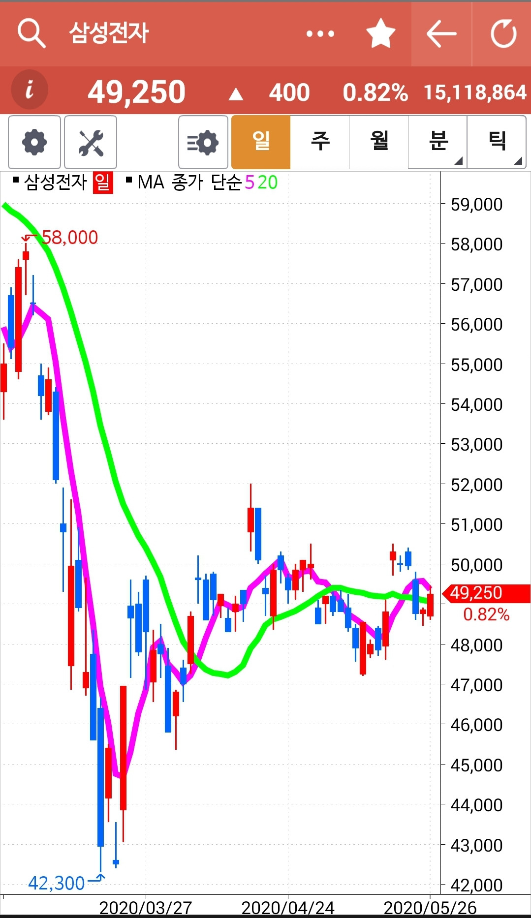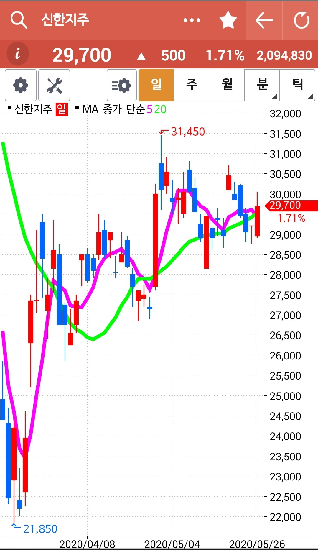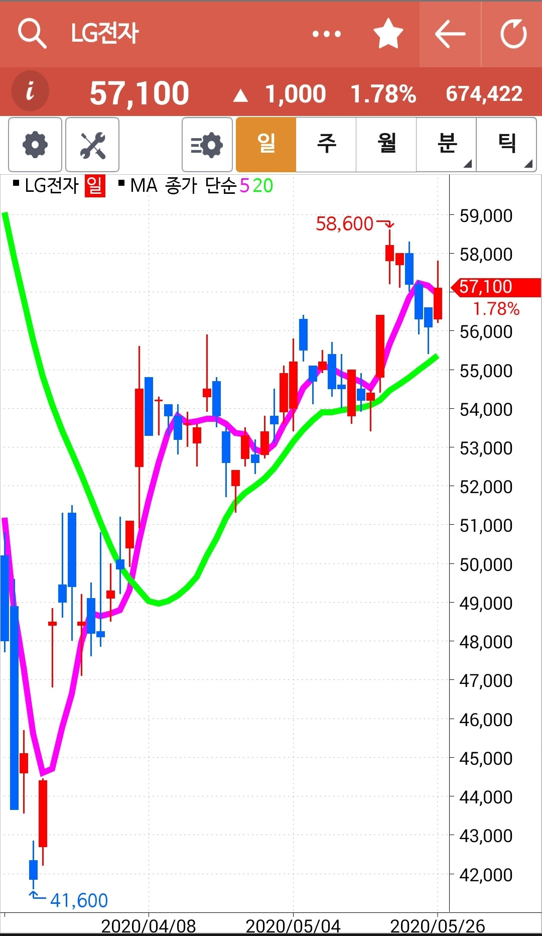 5일선이 20일선 아래로 내려올 뻔한 아슬아슬한 순간에 빵 위로 돌리는 주가. 어찌 될까. 다시 들락날락거리며 나를 혼란스럽게 만들지는 않을까? 5 주선은 턴했고 20 주선을 향해 달려가는 중. 그러나 월봉이 너무 미약하구나. 몇번을 왔다갔다해도 난 나의 원칙대로 철저히 따라 행하리라. 오르면 매수! 내리면 매도!