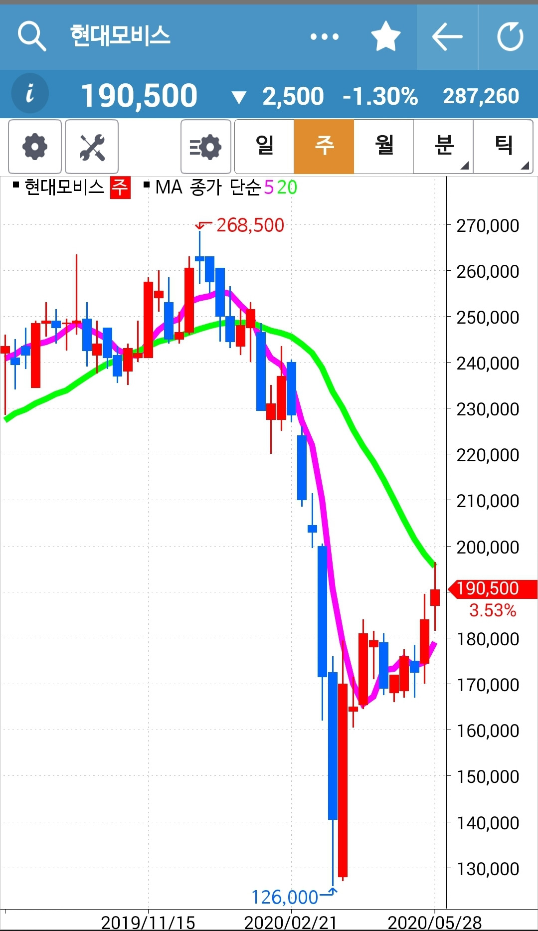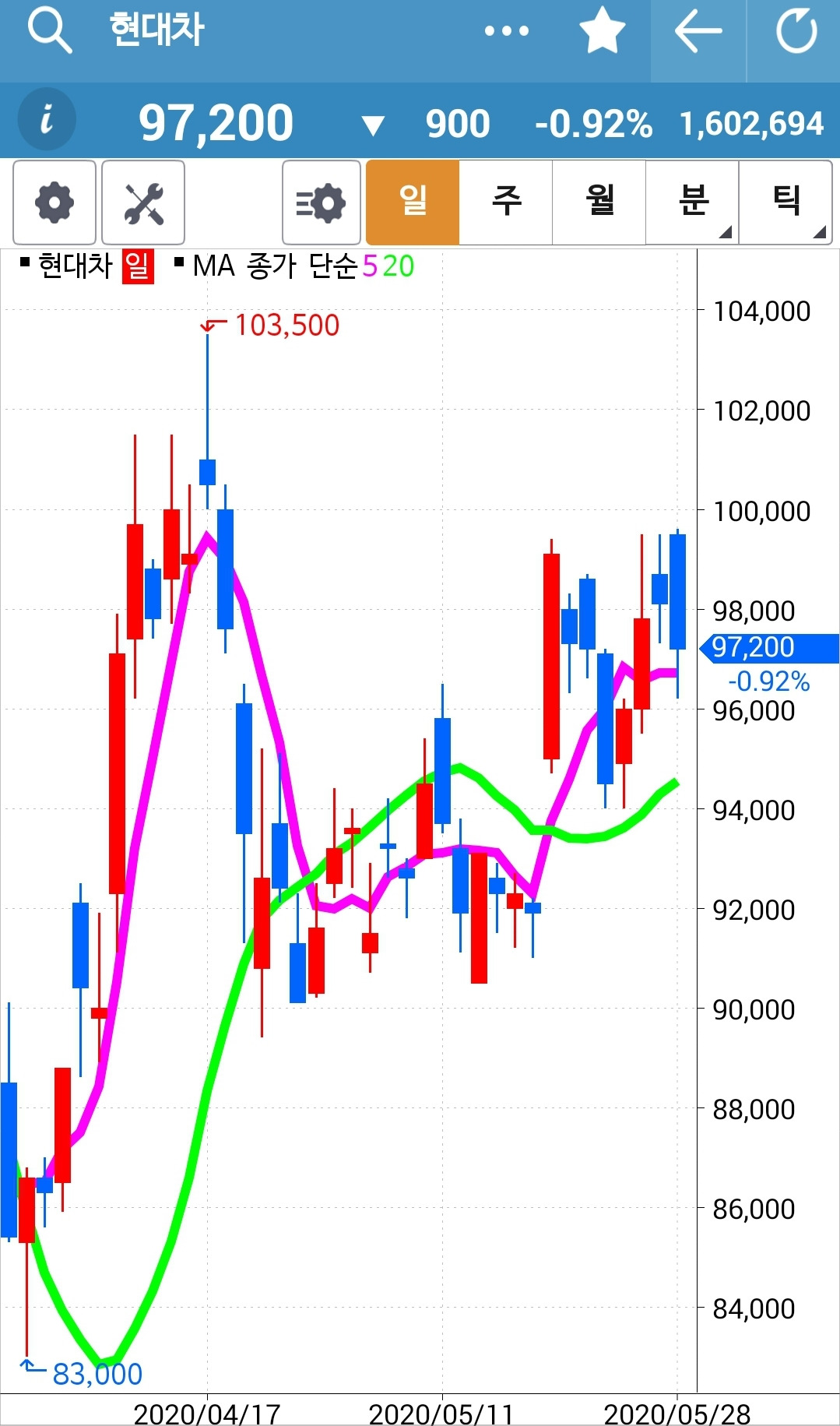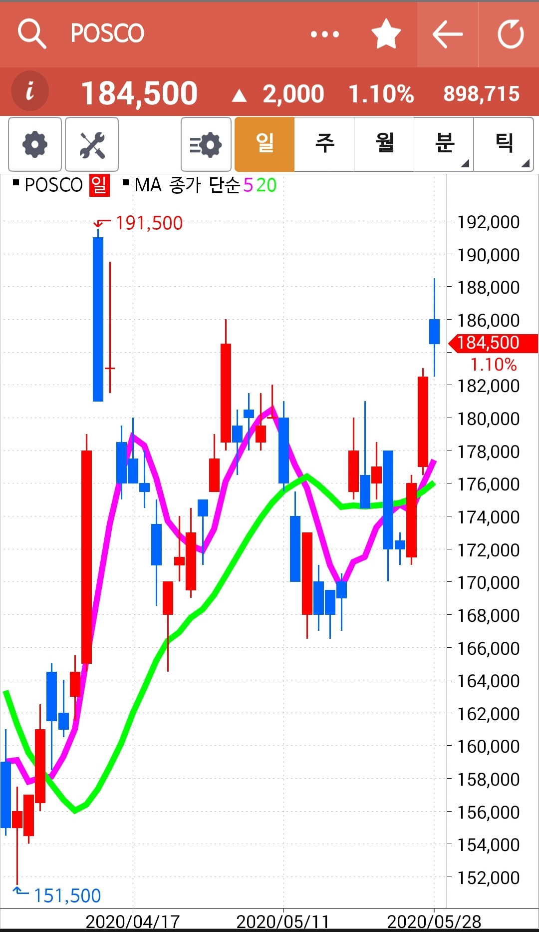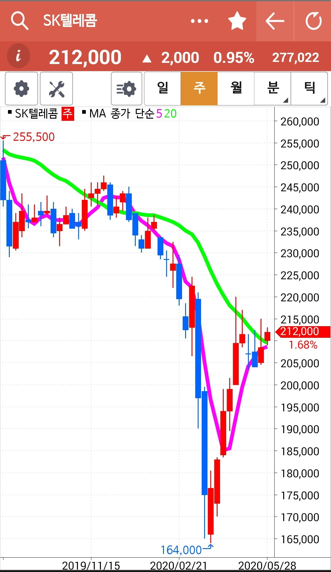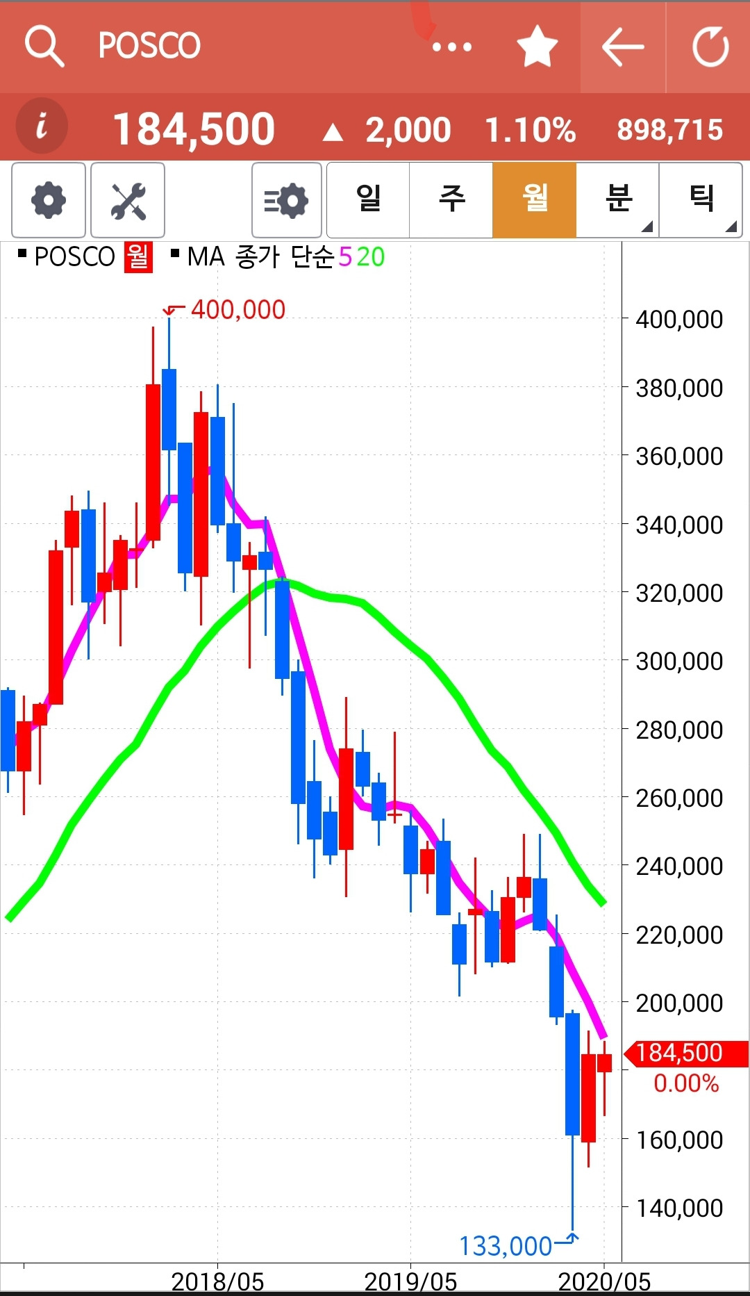 20주선과 5개월선에 부딪쳐서 조정 중이라고 생각하자. 5일선이 20일선 위에 있는데 무어 걱정! 매수유지! 하! 그런데 20주면 바로바로 5개월 아닌가? 푸하하하 그러니까 20주선에 닿으면 5개월 선에 닿는 거지. 바보. 푸하하하