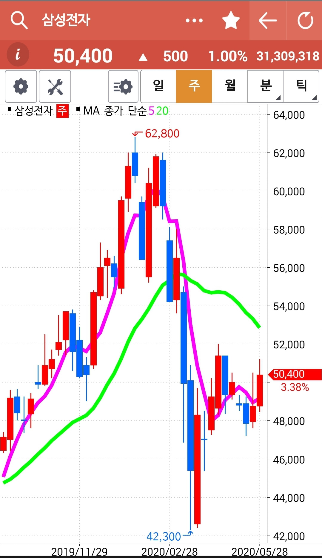 잘 올라가더니 전 고점과 전전 고점을 뚫고 힘이 들었을까. 음봉출현. 그래도 5일선이 위로 향하고 있으므로 걱정 말자. 20주봉 근처에 가니까 조정중일게다. 잘 지켜보자.