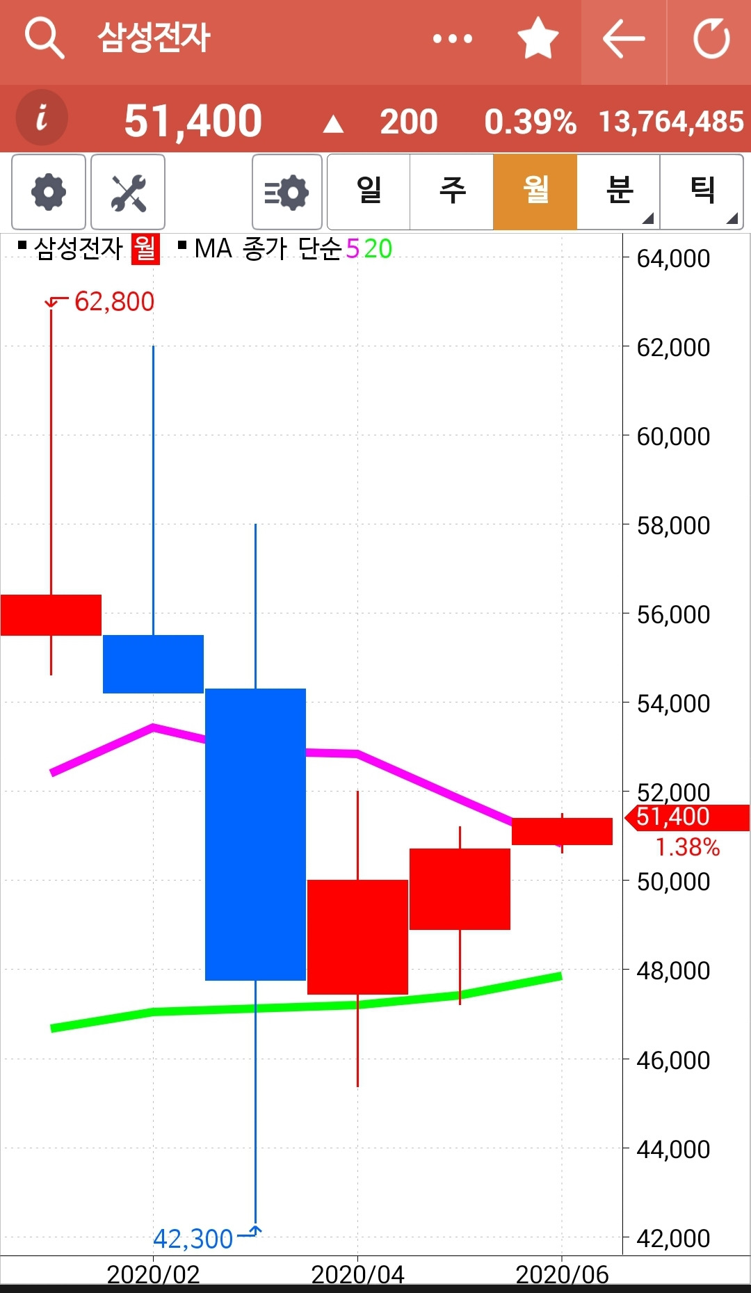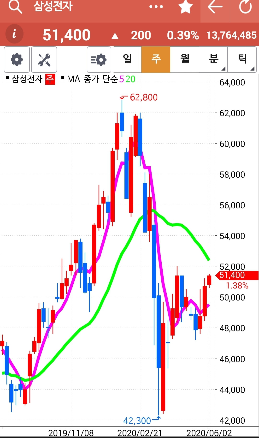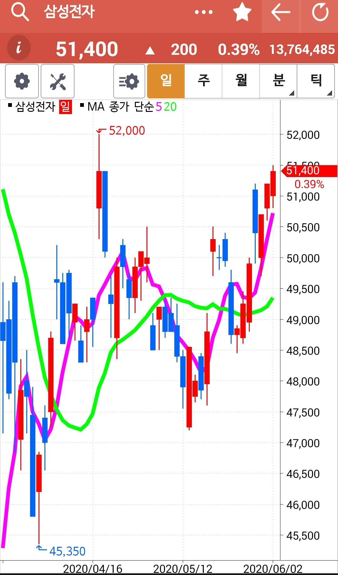 삼성전자. 5일선 위에서 잘 올라가고 있으니 오케이. 20 주선에 다가가고 있는 주가. 오케이. 좋아요.