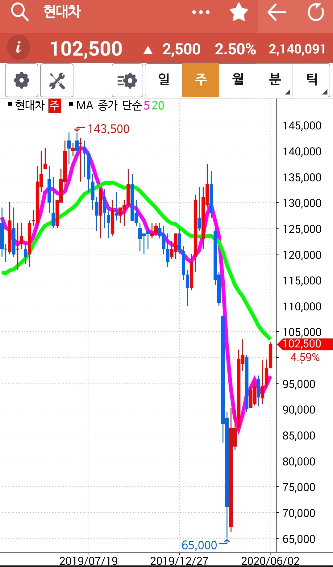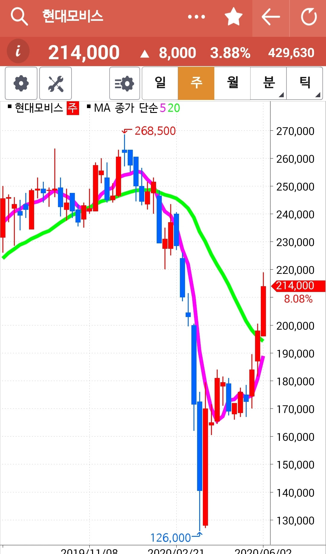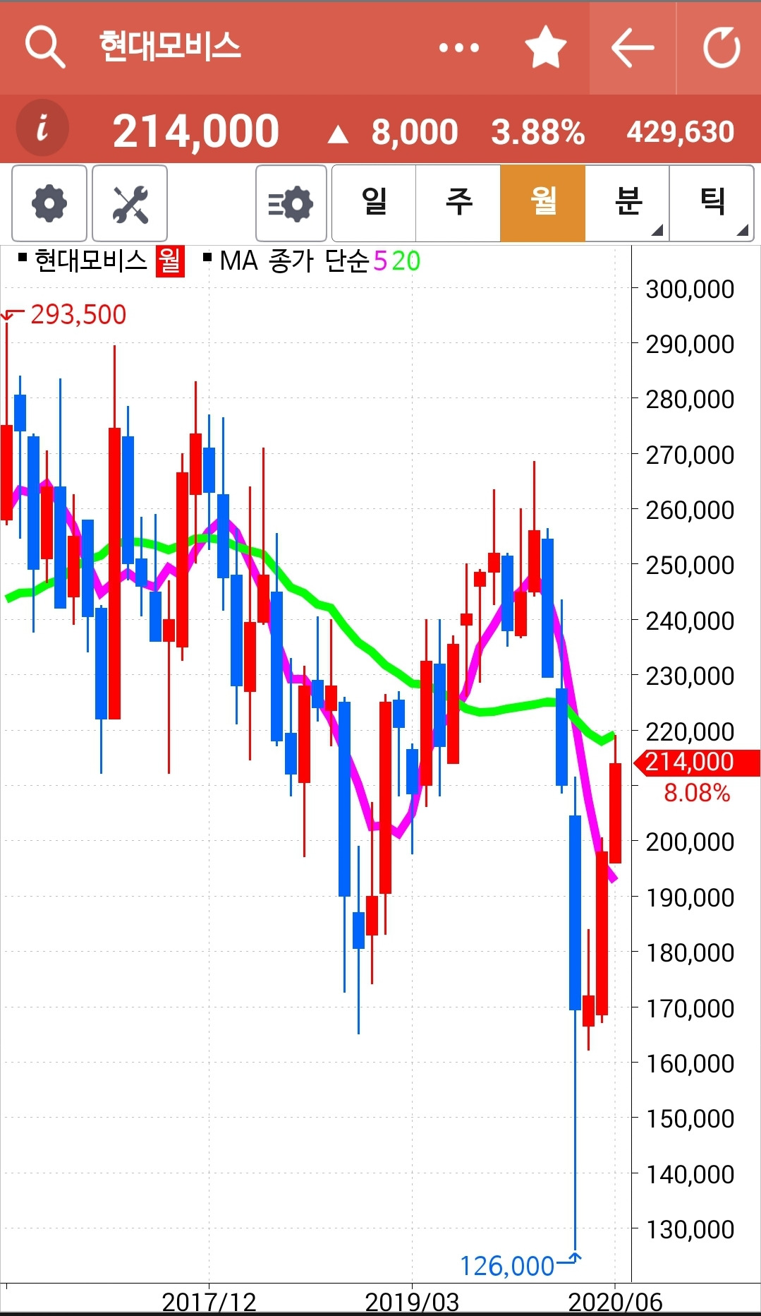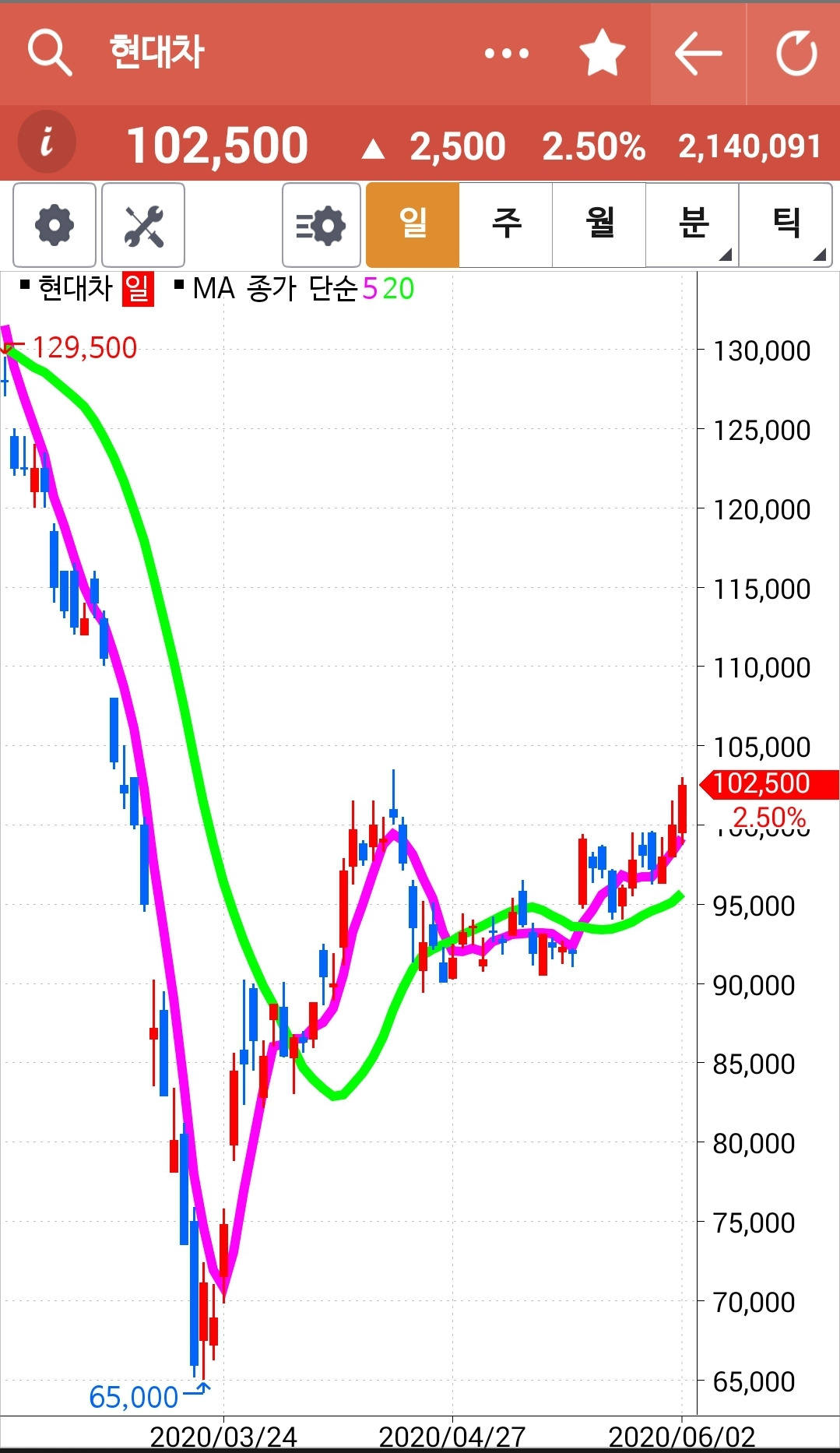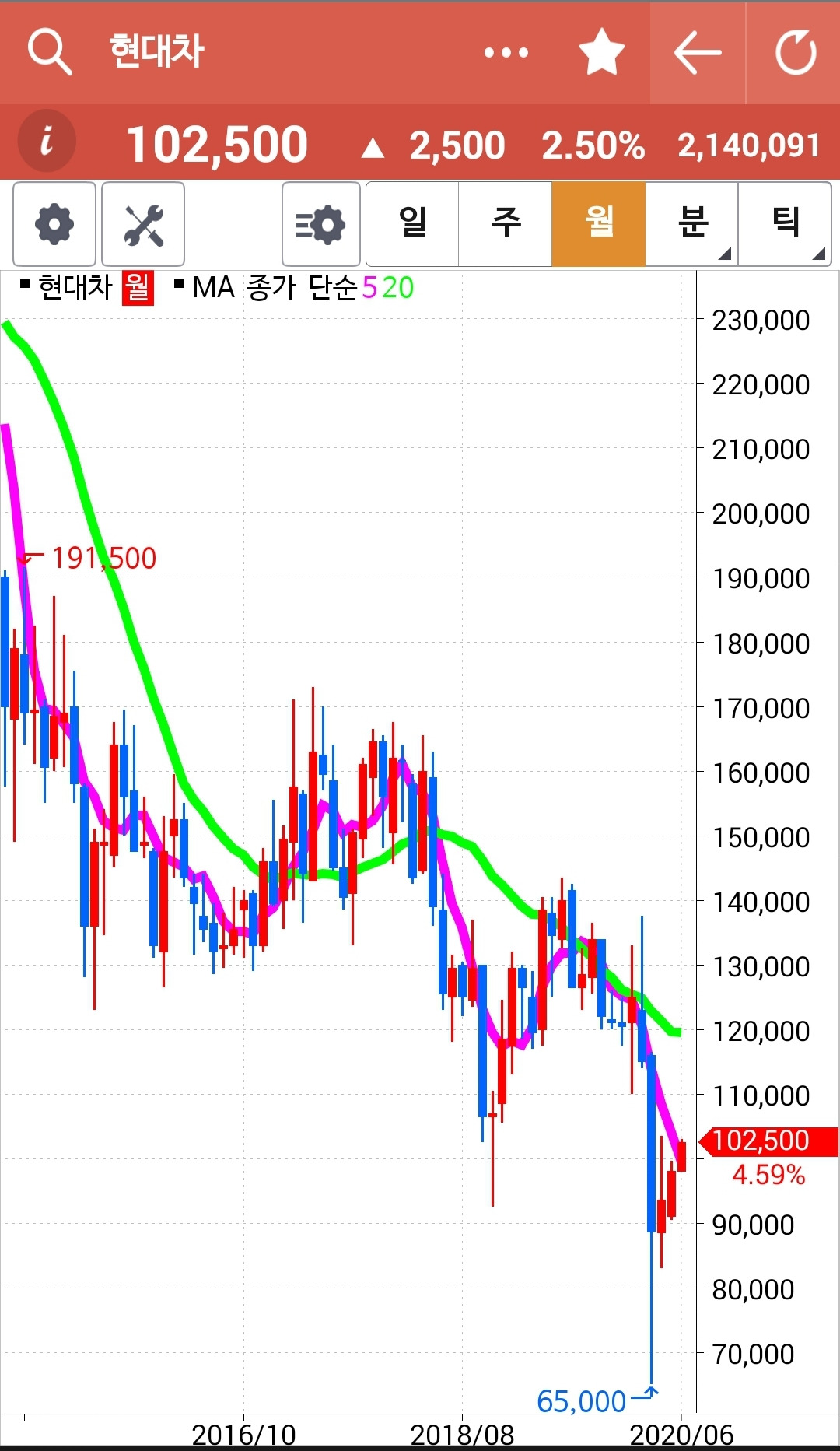 현대차. 5일선 위로 빵빵. 주가 양봉. 주봉에선 20 주선에 다가가고 있고 5 주선은 위로 향하고 있고. 5개월 봉을 뚫고 위로 가려하고 있고. 월봉에서의 저 무지막지 하락 선을 위로 돌릴 수 있을까? 지켜보잣.