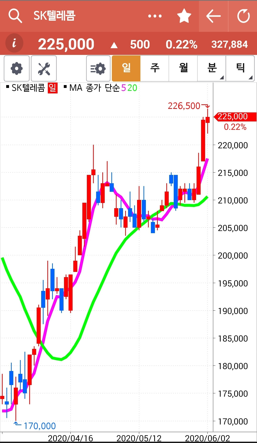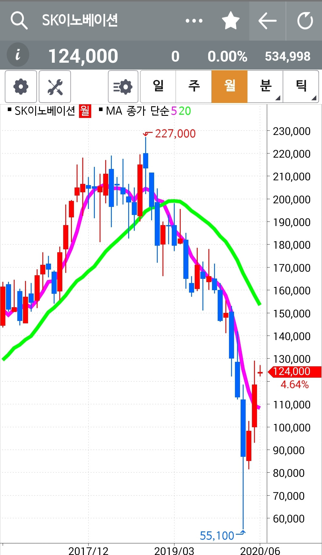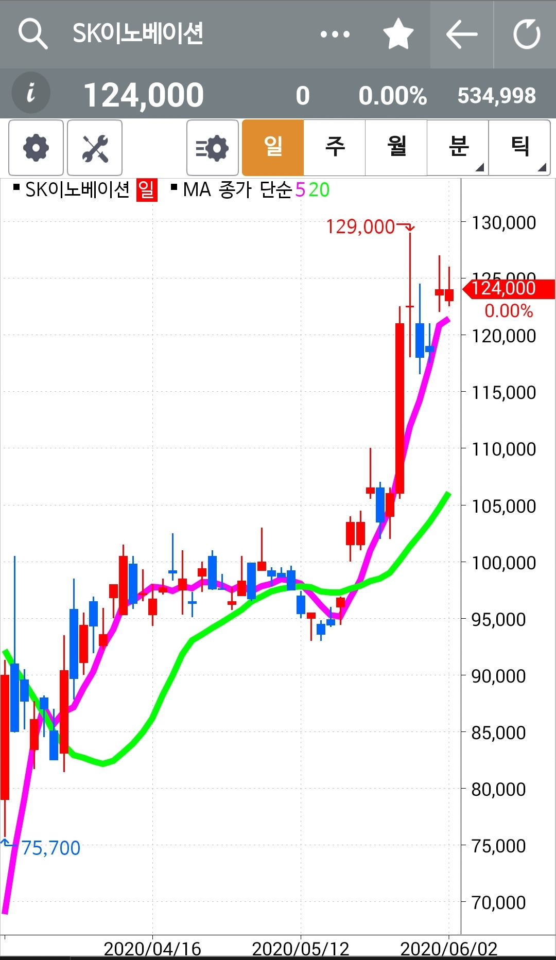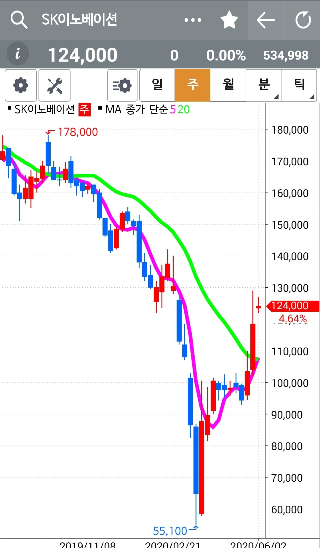 SK이노베이션. 5일선이 빵! 위로. 이격이 너무 큰가? 곧 간격을 좁히러 조정이 있으려나? 그러면 어때. 20일선을 뚫고 내려오기 전까지는 내가 할 일은 없음. 난 아무것도 몰라요 5일선이 20일선 아래로 내려가면 매도할 뿐야요~ 그래. 그때까지 할 일은 없다. 20주 선위로 빵 솟은 주가. 5 주선이 20 주선 위로 통과. 5개월 선도 통과. 오케이. 아주 좋아요~ 오늘 공부 끝. 내일 새벽에 나가야 하니 일찍 자야 한다. 파이팅!