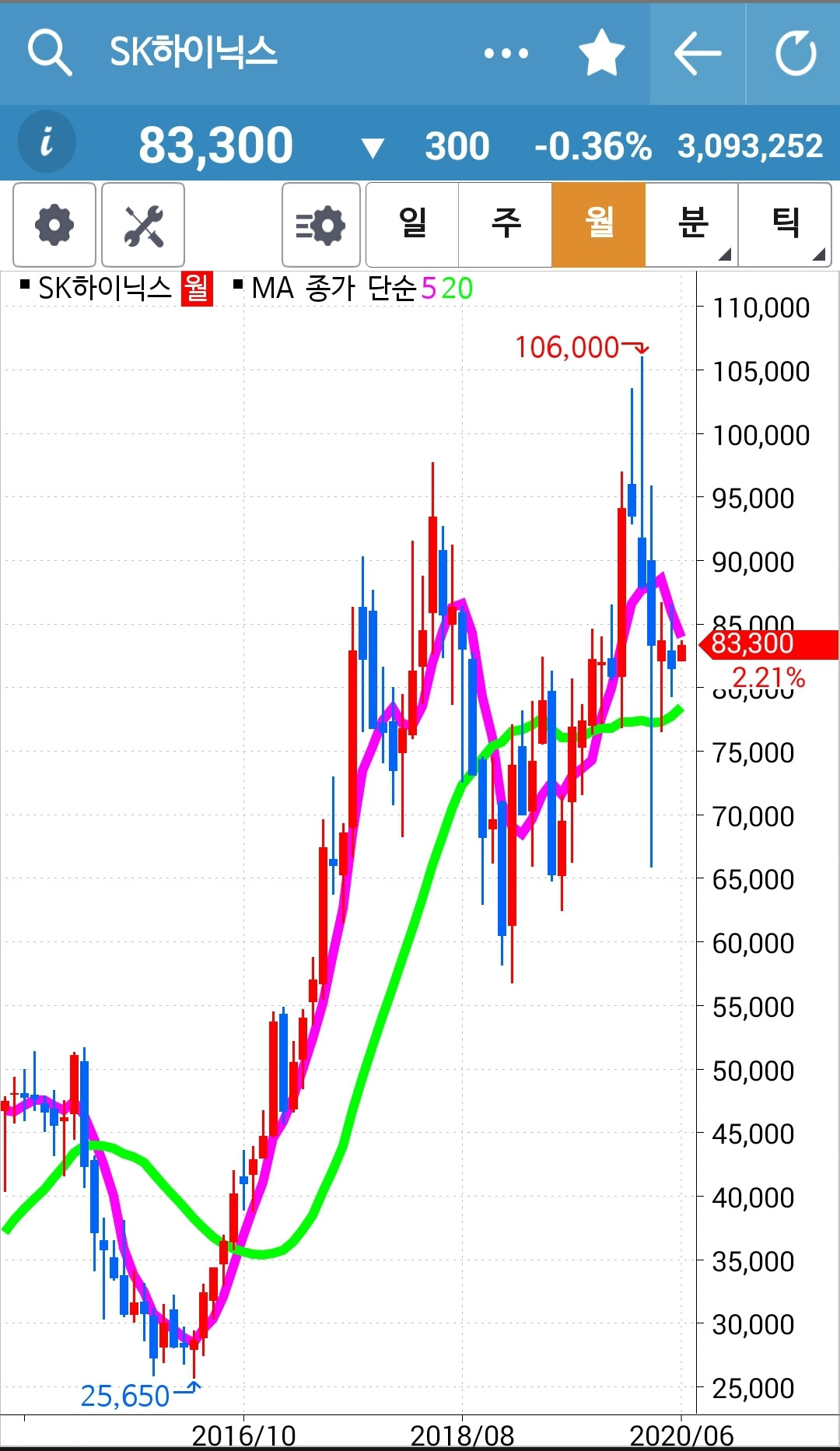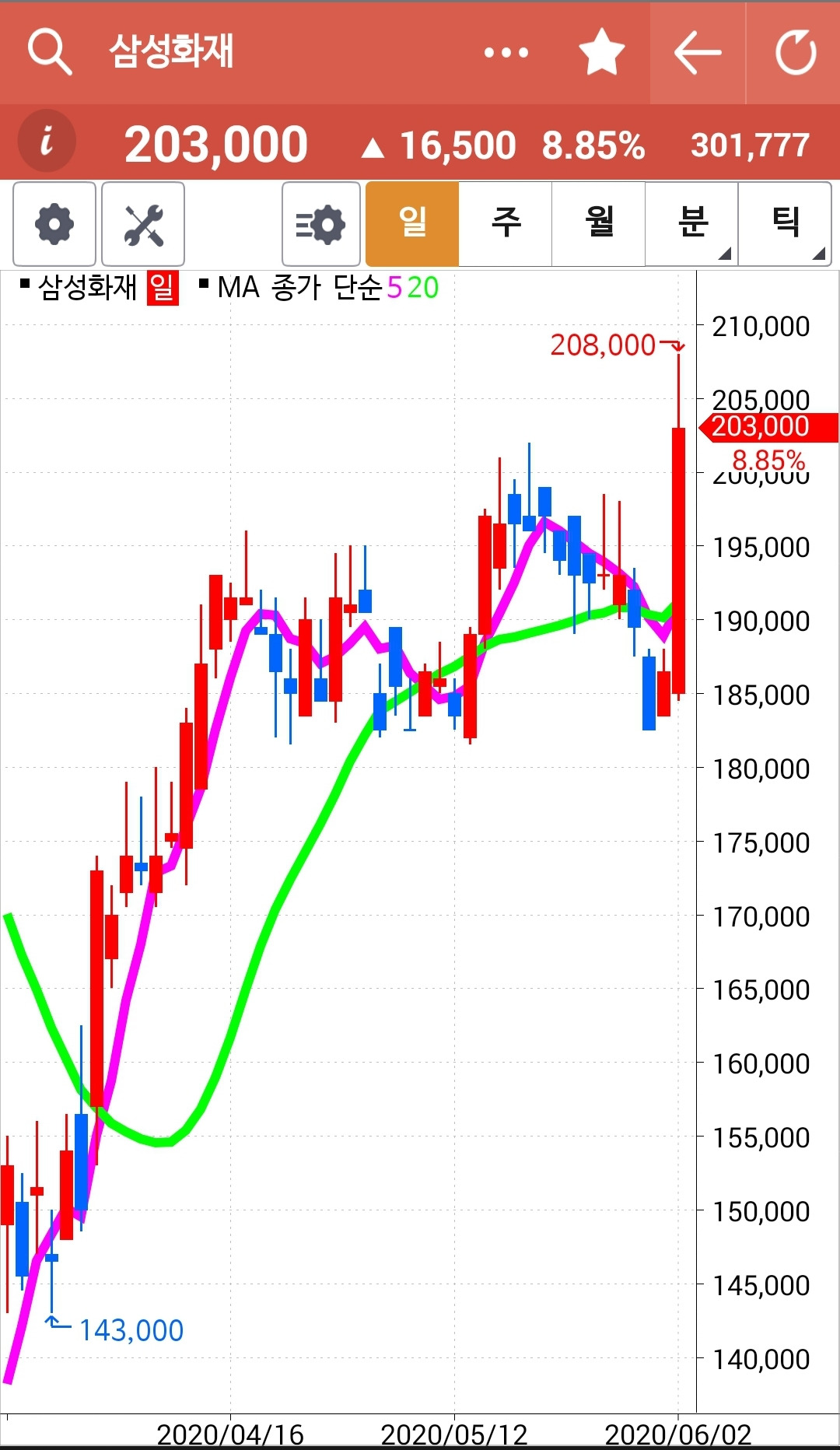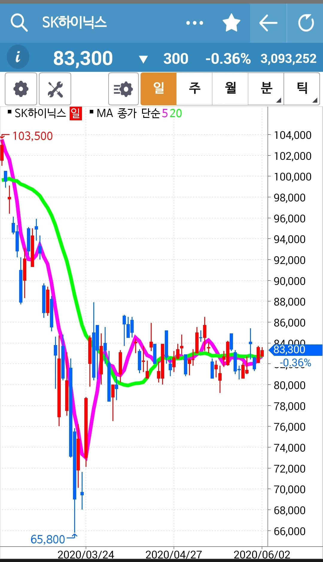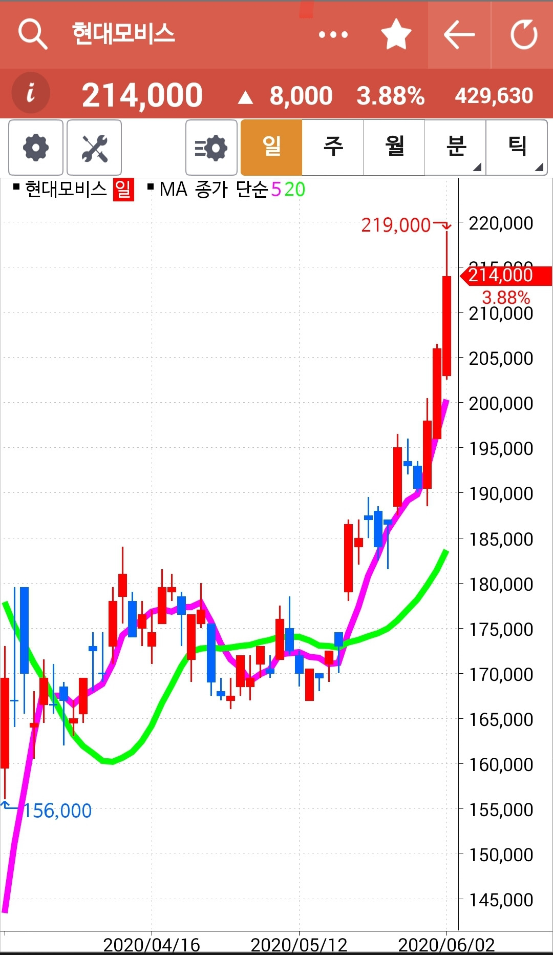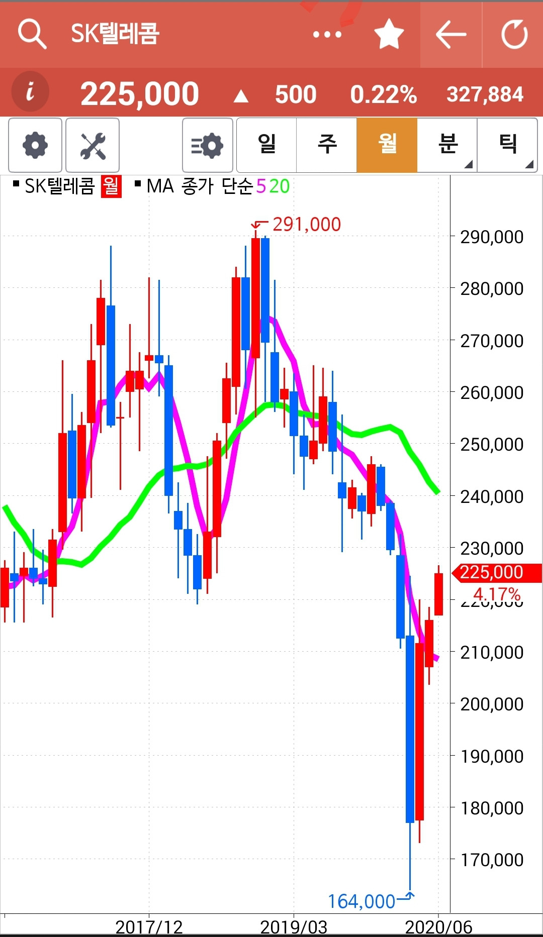 SK이노베이션. 5일선이 빵! 위로. 이격이 너무 큰가? 곧 간격을 좁히러 조정이 있으려나? 그러면 어때. 20일선을 뚫고 내려오기 전까지는 내가 할 일은 없음. 난 아무것도 몰라요 5일선이 20일선 아래로 내려가면 매도할 뿐야요~ 그래. 그때까지 할 일은 없다. 20주 선위로 빵 솟은 주가. 5 주선이 20 주선 위로 통과. 5개월 선도 통과. 오케이. 아주 좋아요~ 오늘 공부 끝. 내일 새벽에 나가야 하니 일찍 자야 한다. 파이팅!