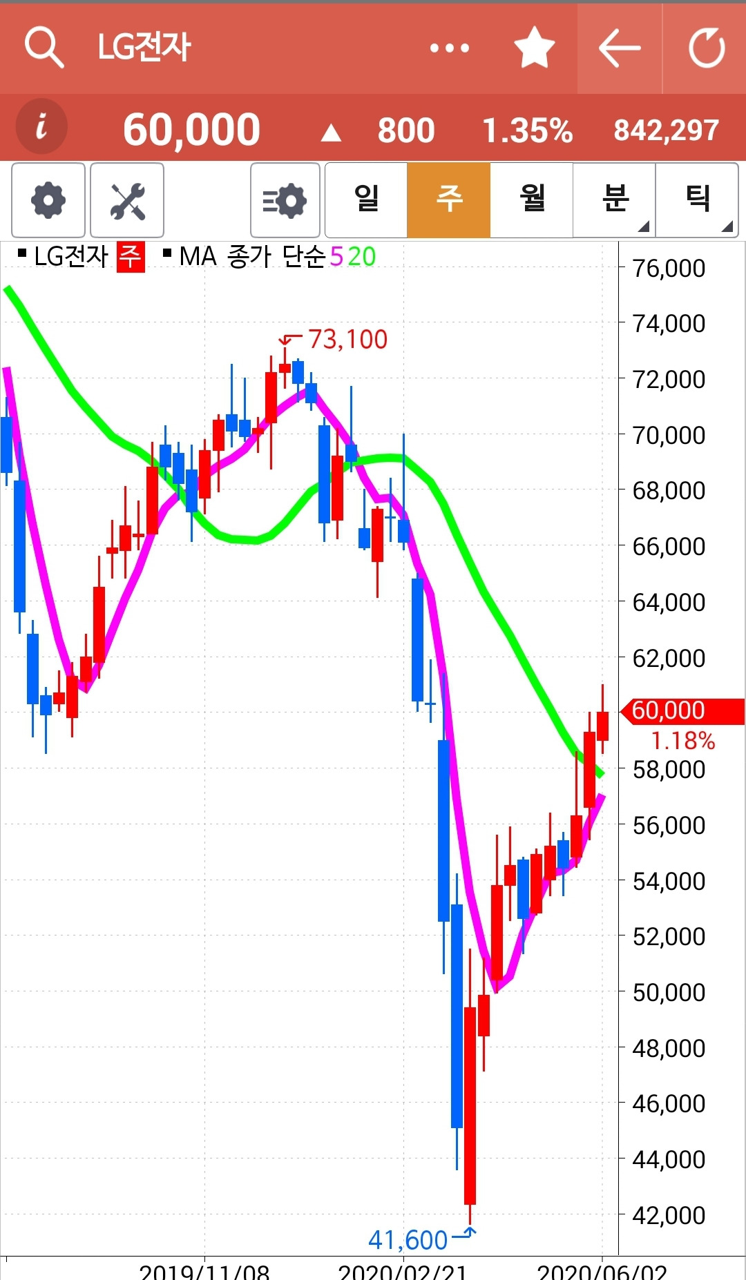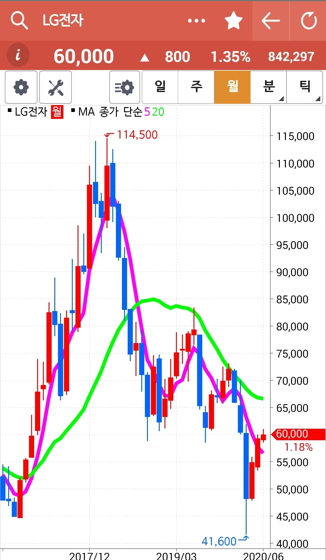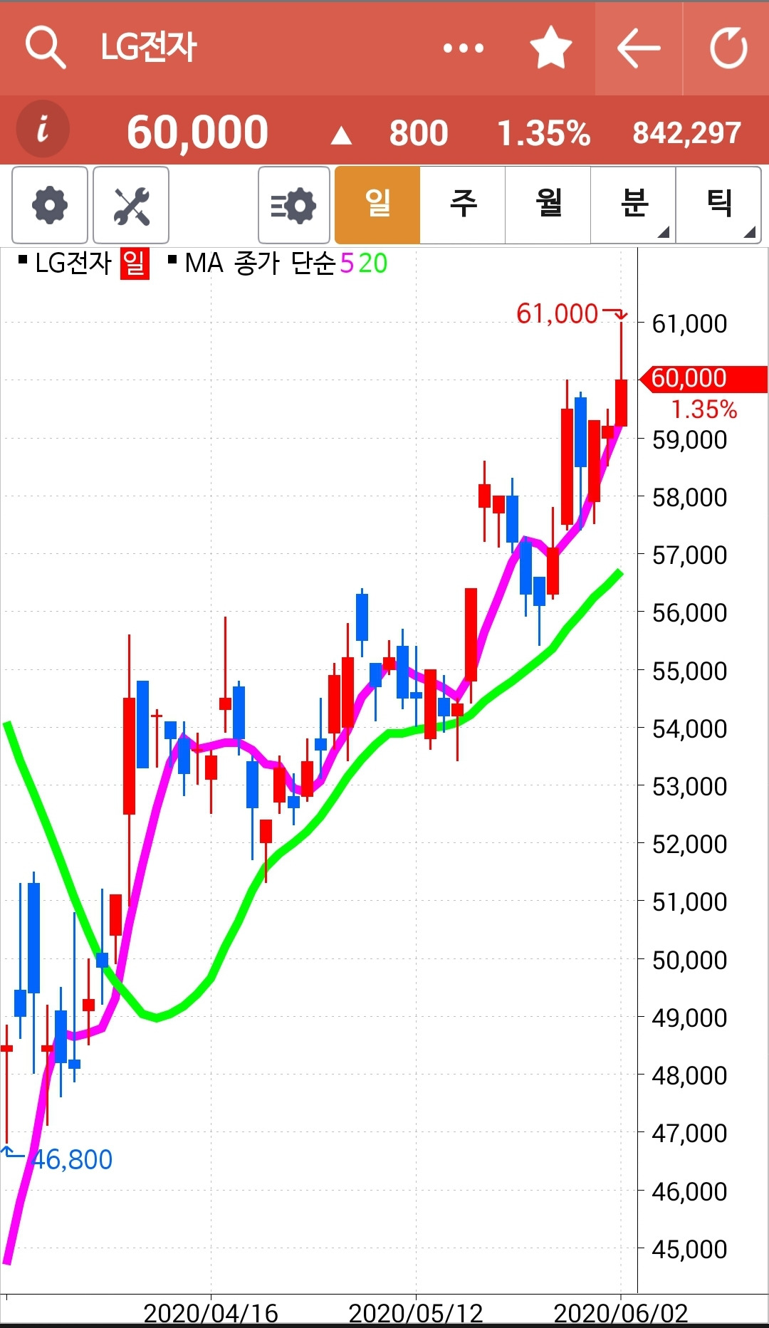 LG전자. 역시 20일선 파괴 없이 위로 쭉쭉빵빵 힘차게 올라가고 있다. 걱정 무! 20주 선도 가볍게 통과. 5개월 선도 통과. 어떻게 월봉의 저 길고 긴 하락 추세를 위로 방향 턴하게 만들지 눈을 부릅뜨고 지켜볼 일이다. 그냥 쭉쭉 가지는 못할 테고 울퉁불퉁 굴곡을 주면서 가겠지. 차트의 변화를 매일 이렇게 체크해보는 재미도 아주 괜찮다. 파이팅.