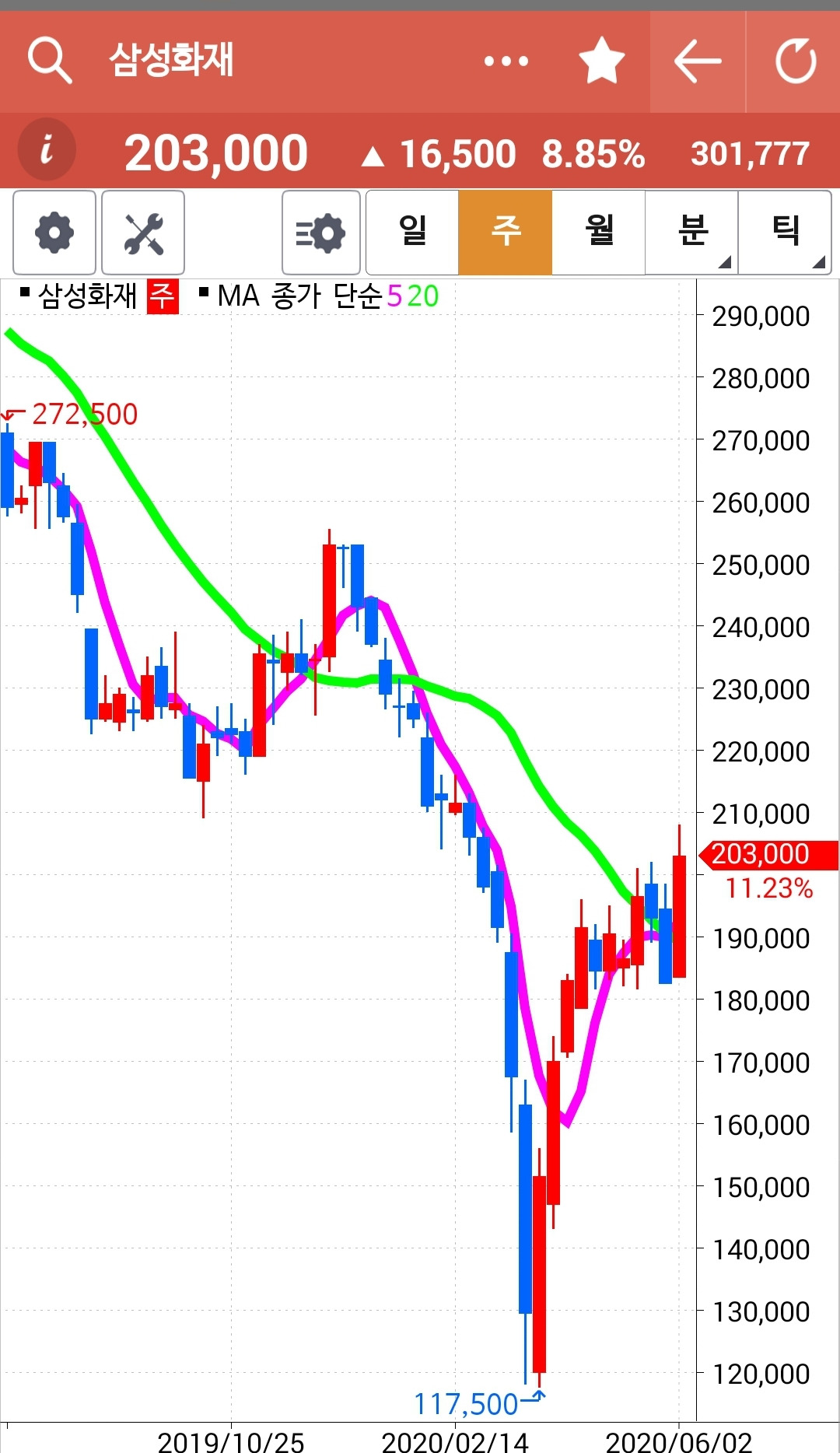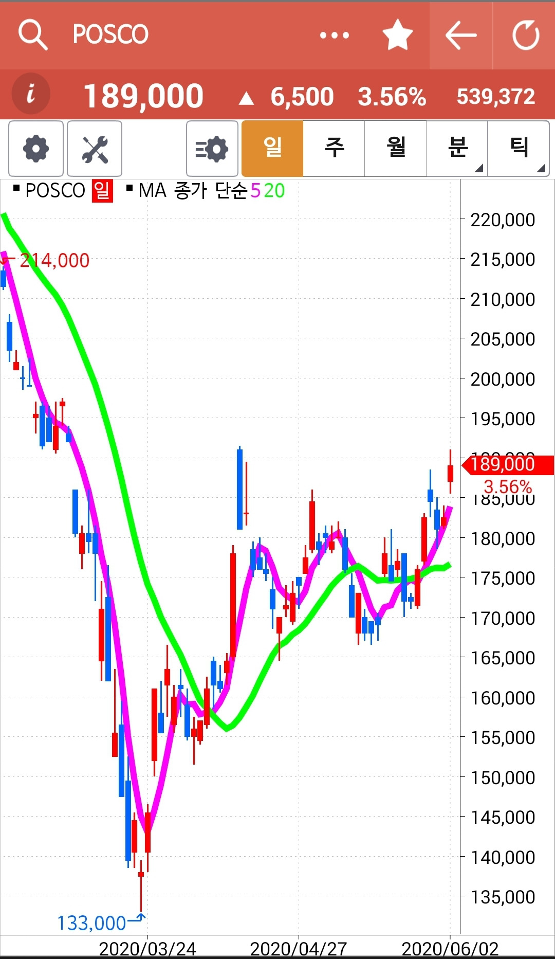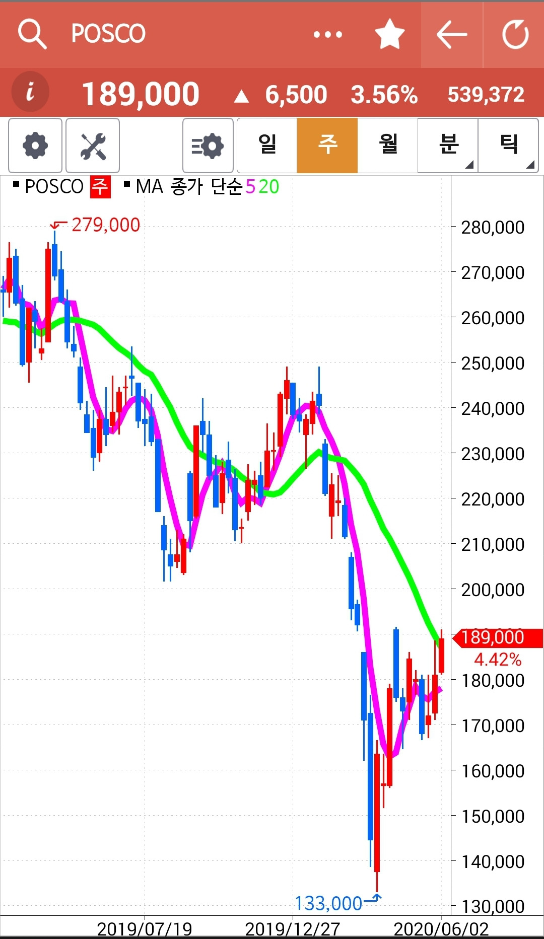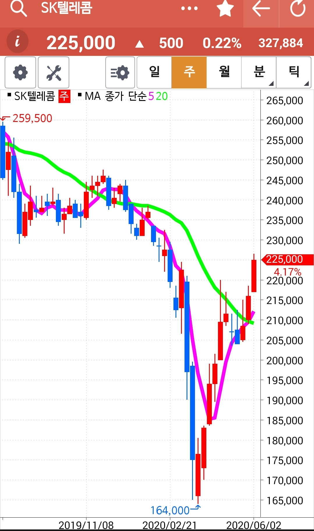 SK텔레콤. 들락날락거리더니 일단 방향을 잡고는 쭉쭉 빵빵 멋지게 위로 향하고 있다. 그러니까 어디로 튀건 끝까지 따라가면서 위면 매수! 아래면 매도! 그것만 지켜내리라. 주봉상 골든 크로스. 20 주선을 훌쩍 넘어 위로 달려가는 주가. 오호 좋아요~