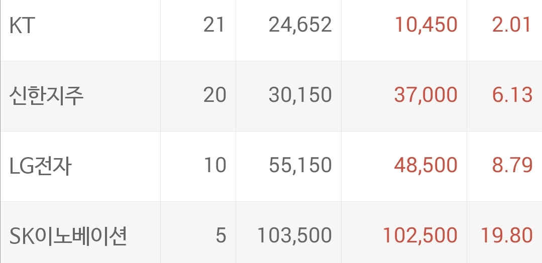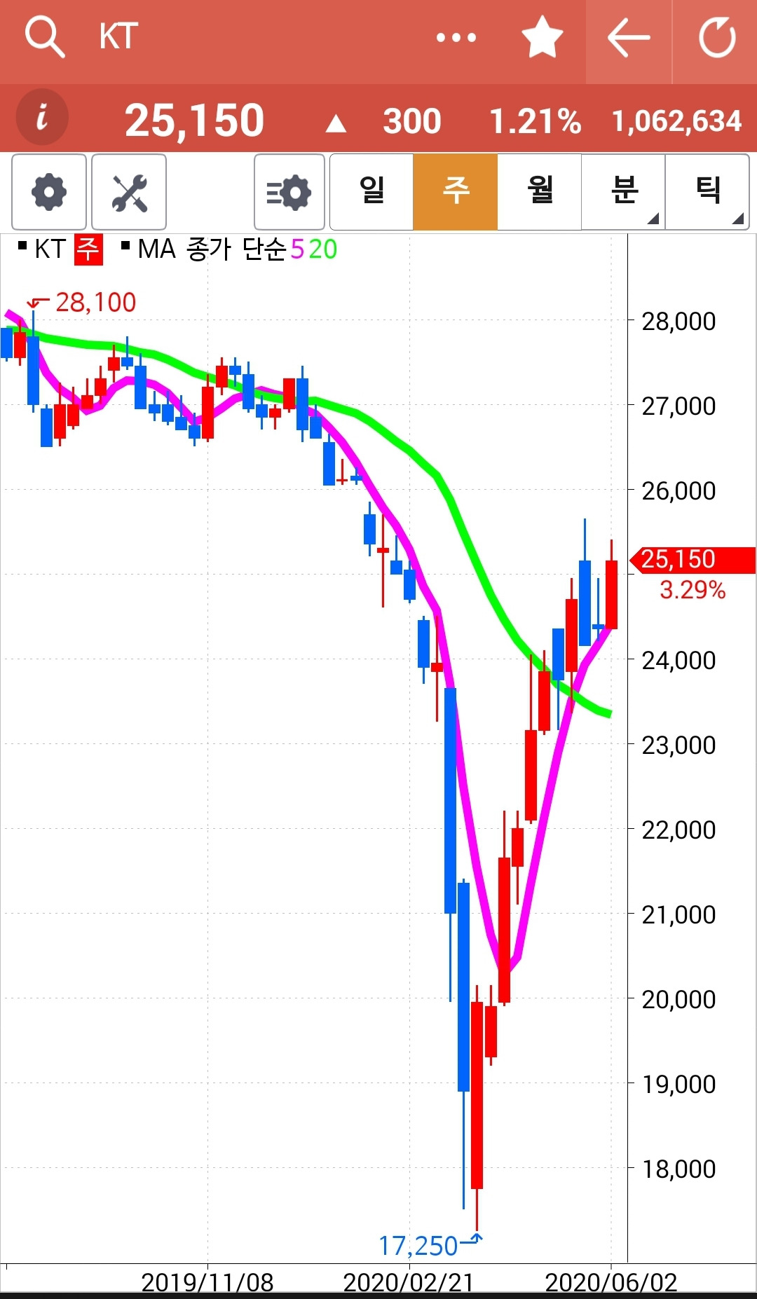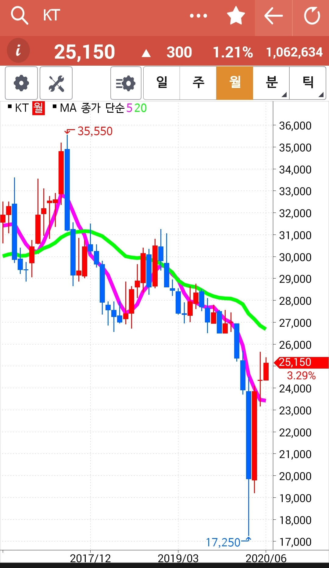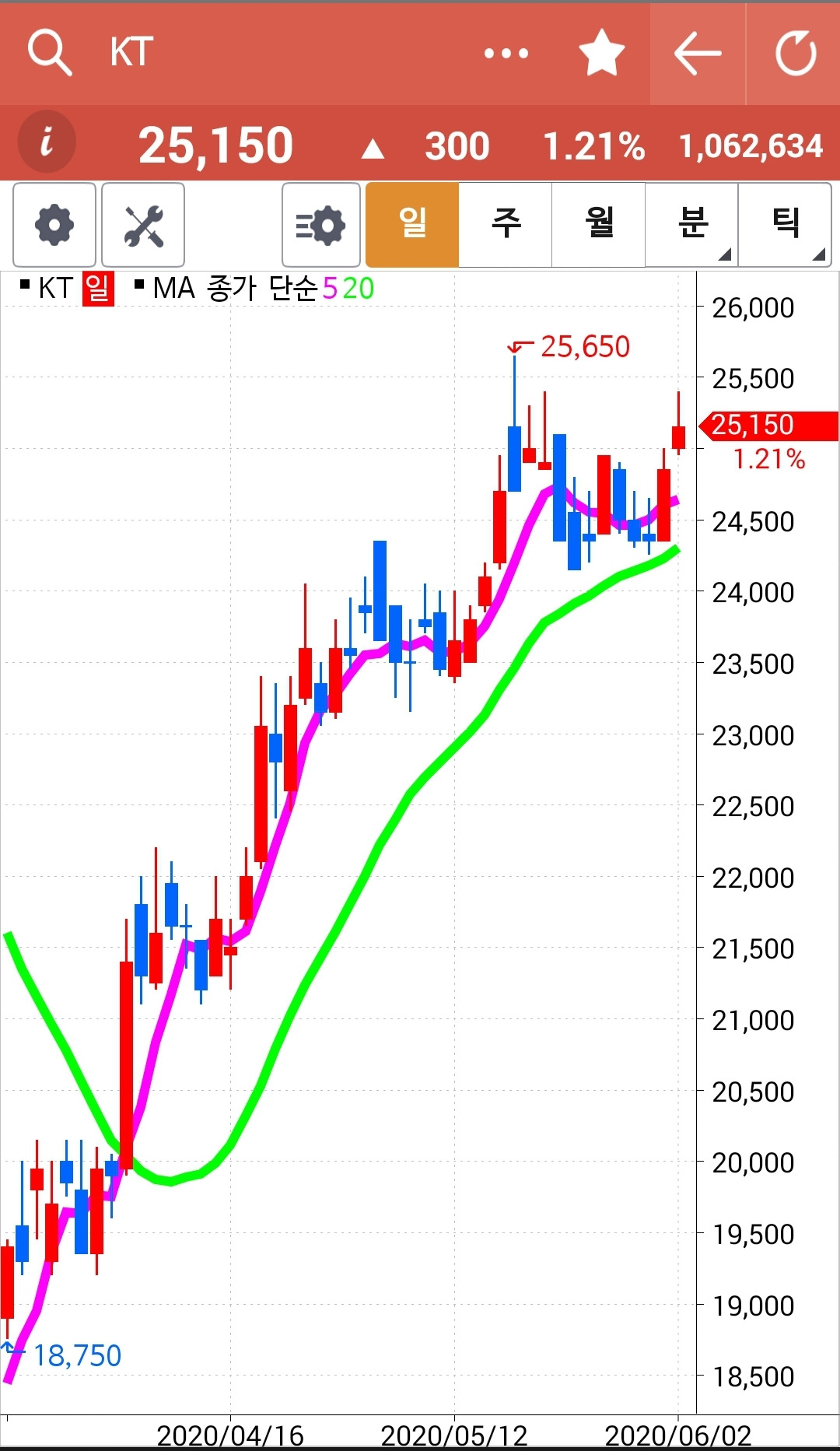 KT 단 한 번도 20일선 파괴 없이 쭉쭉 올라가고 있는 KT 예쁘게 잘 올라가고 있다. 5 주선이 20 주선을 확실하게 뚫었고 5개월 선도 깡총 뛰어넘었다. 이 기세 이대로 파이팅.