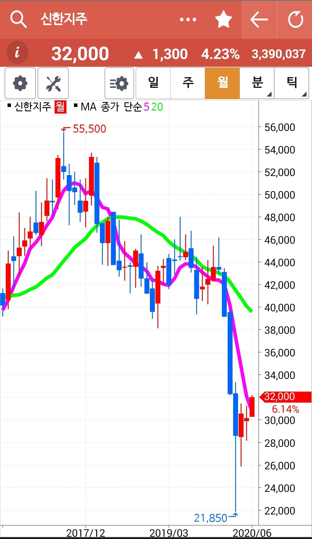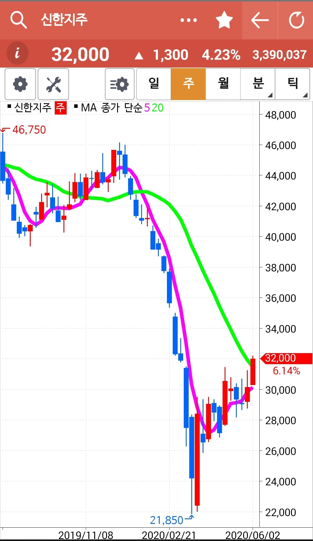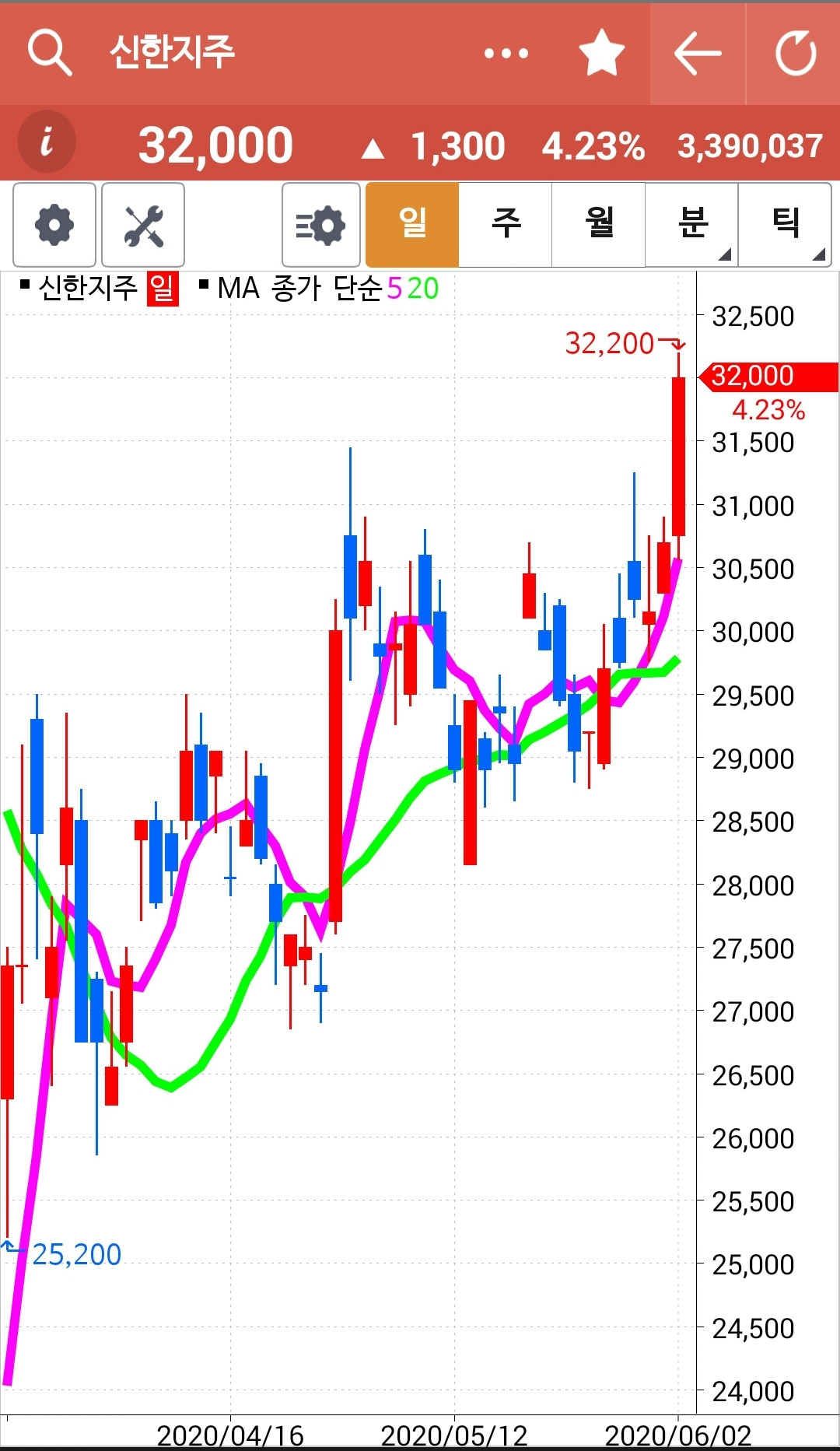 신한지주. 살짝 들락날락하며 나를 고생시켰지만 열심히 따라붙은 결과 오늘 긴 장대양봉. 하하. 보기 좋게 올라간다. 20 주선을 가볍게 돌파. 5개월 선도 돌파. 파이팅.