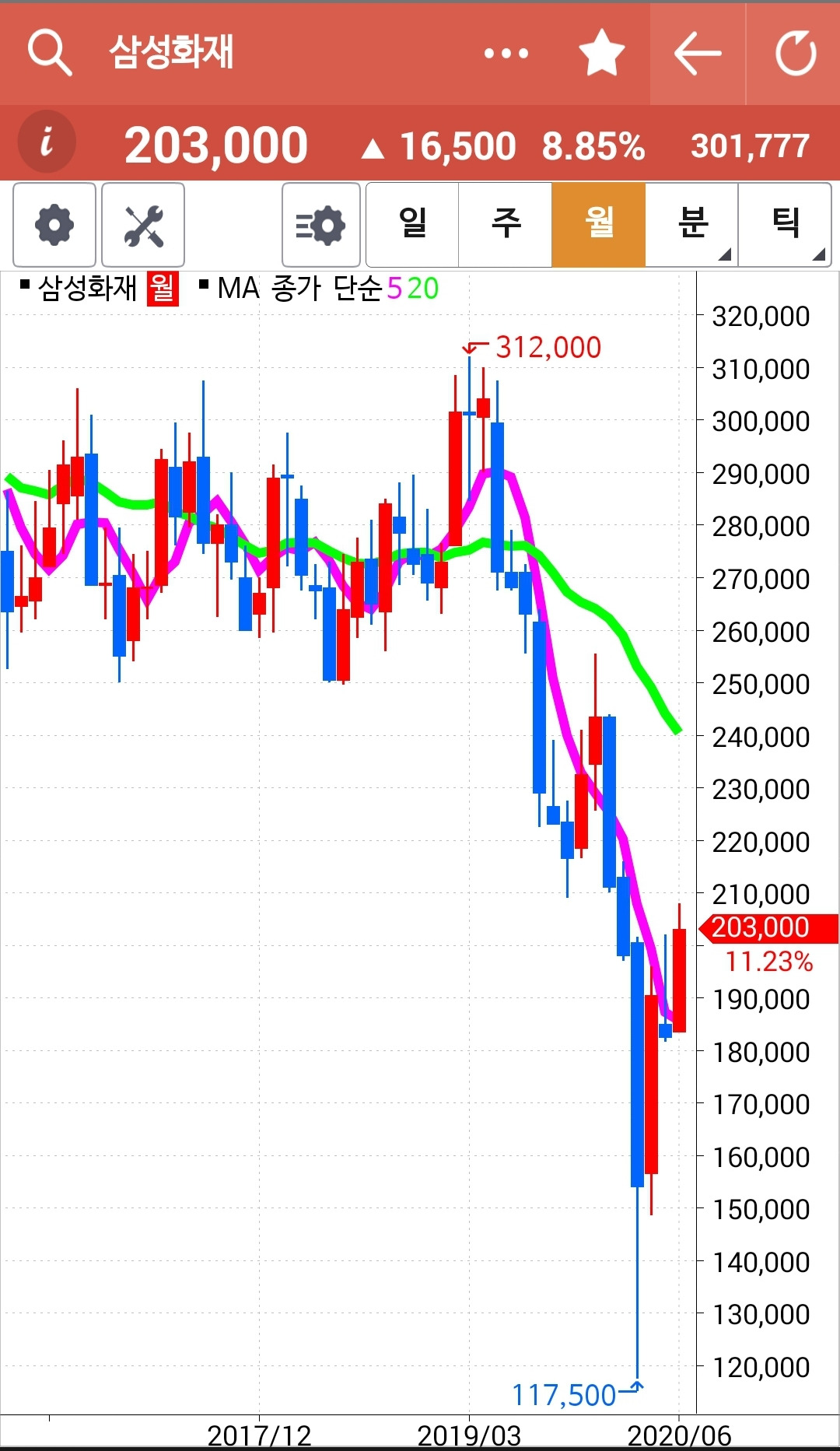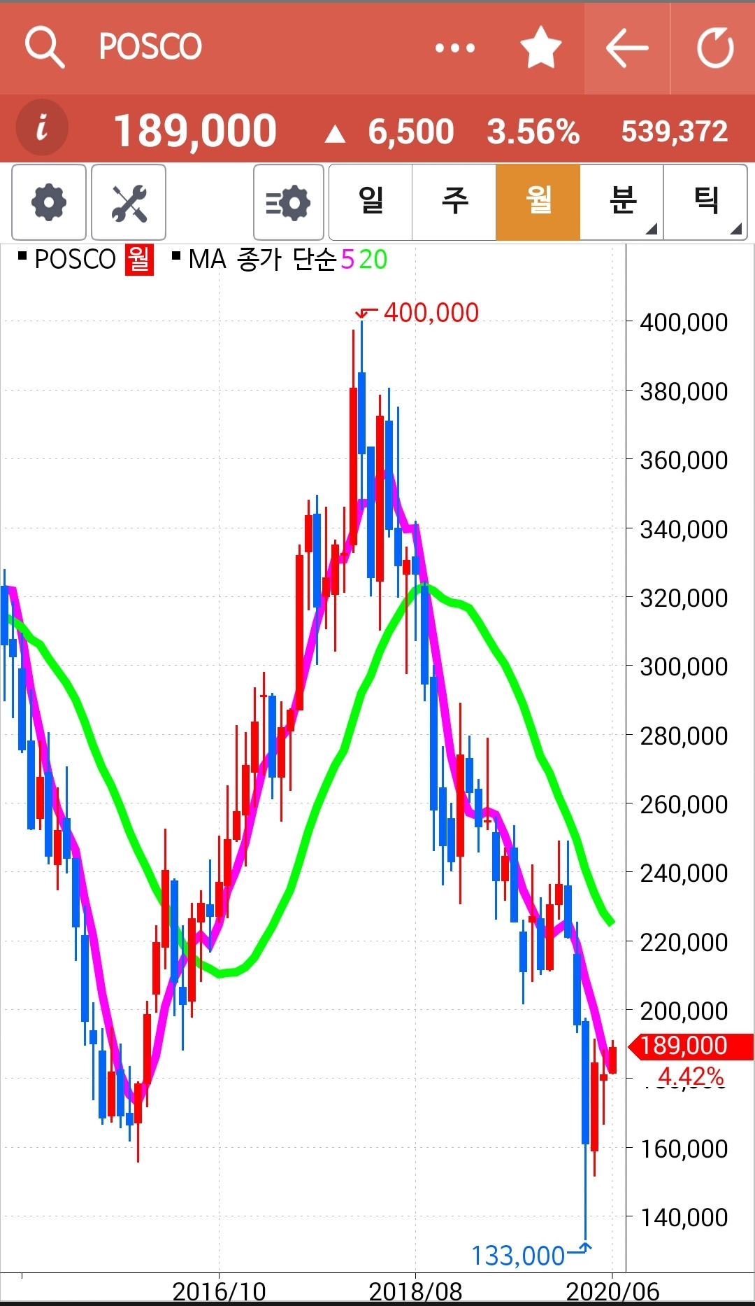 포스코. 일봉엔 문제없고. 그러나 전 고점 근처로 가니 조정은 있을 수도 있겠구나. 저 많은 고점들을 몽땅 뚫고 위로 간다면 하하 그다음엔 아주 쉽게 위로 향하지 않을까. 그래도 워낙 월봉이 하향 중이라 올라가기가 그리 수월하지만은 않으리라. 잘 감상할지어다.