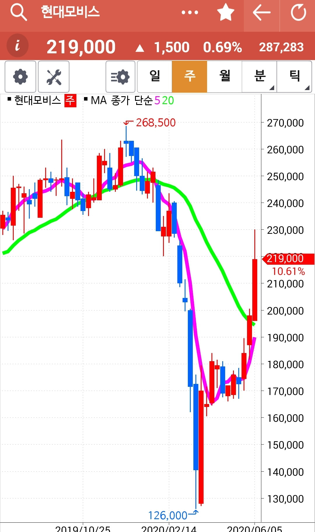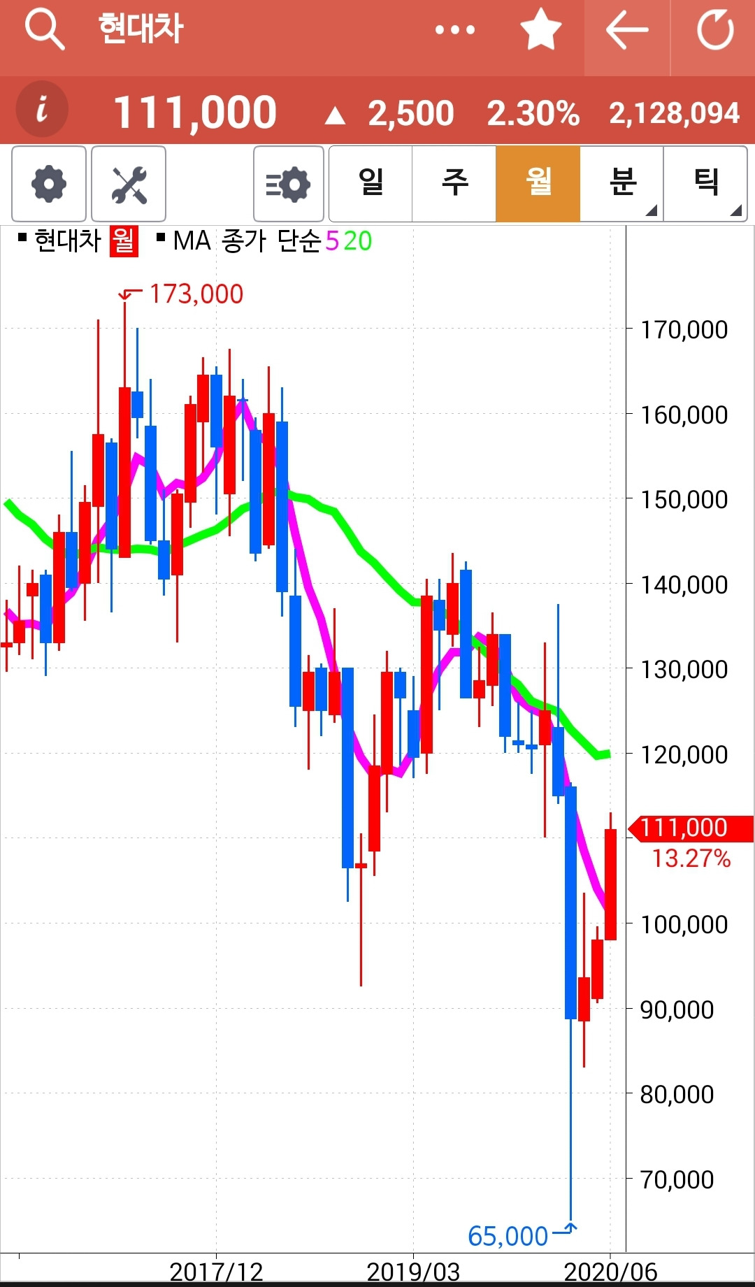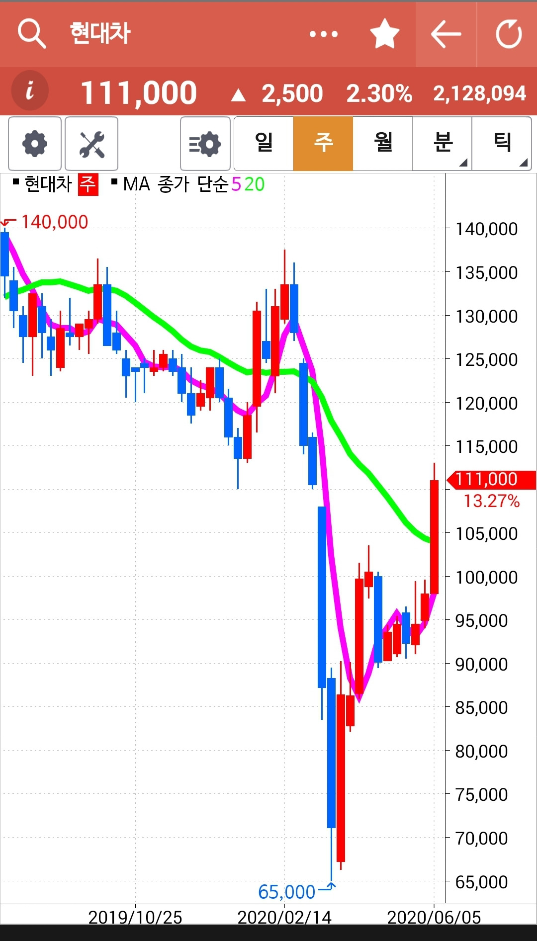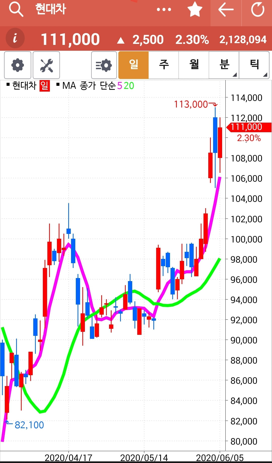 현대차. 오홋 긴 양봉. 5일선 위로 쭉쭉빵빵. 걱정 무!