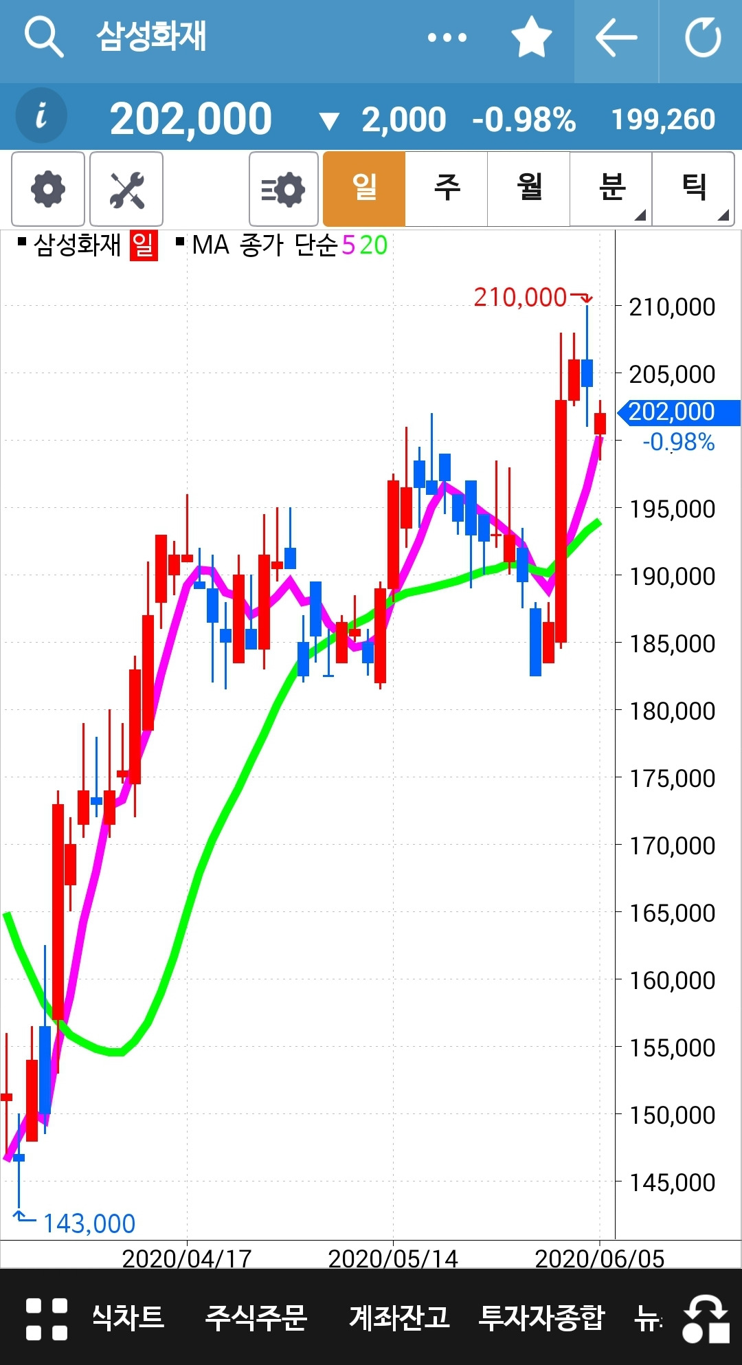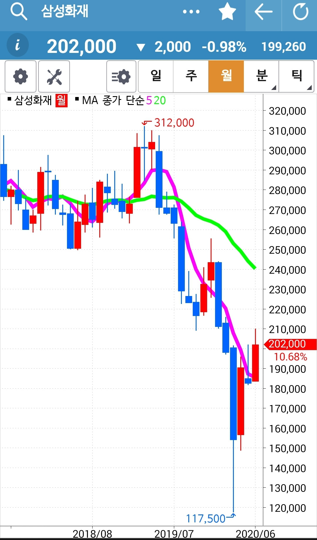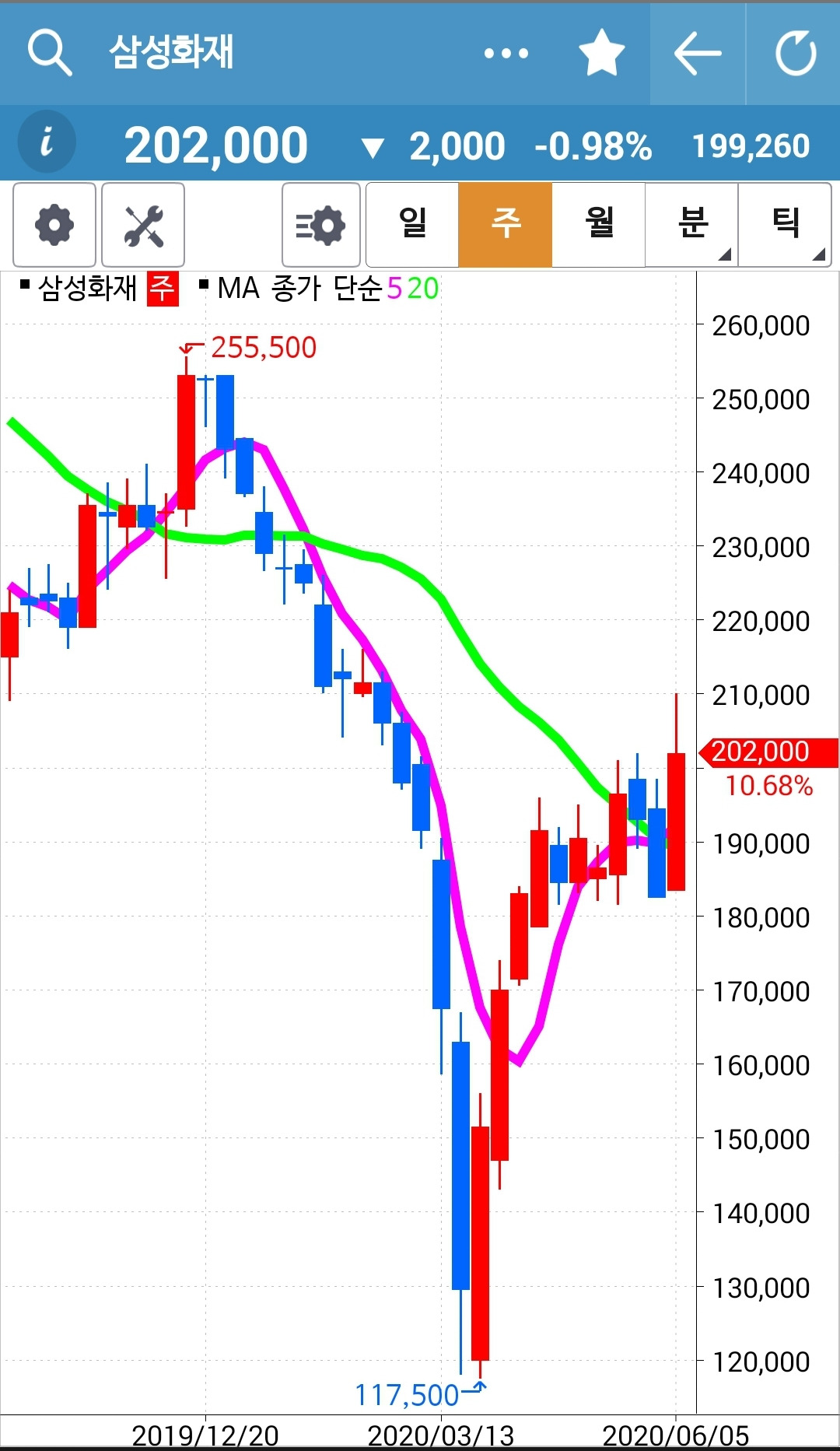 삼성화재. 주가는 떨어져도 5일선이 위에 있으니 걱정하지 말자.
