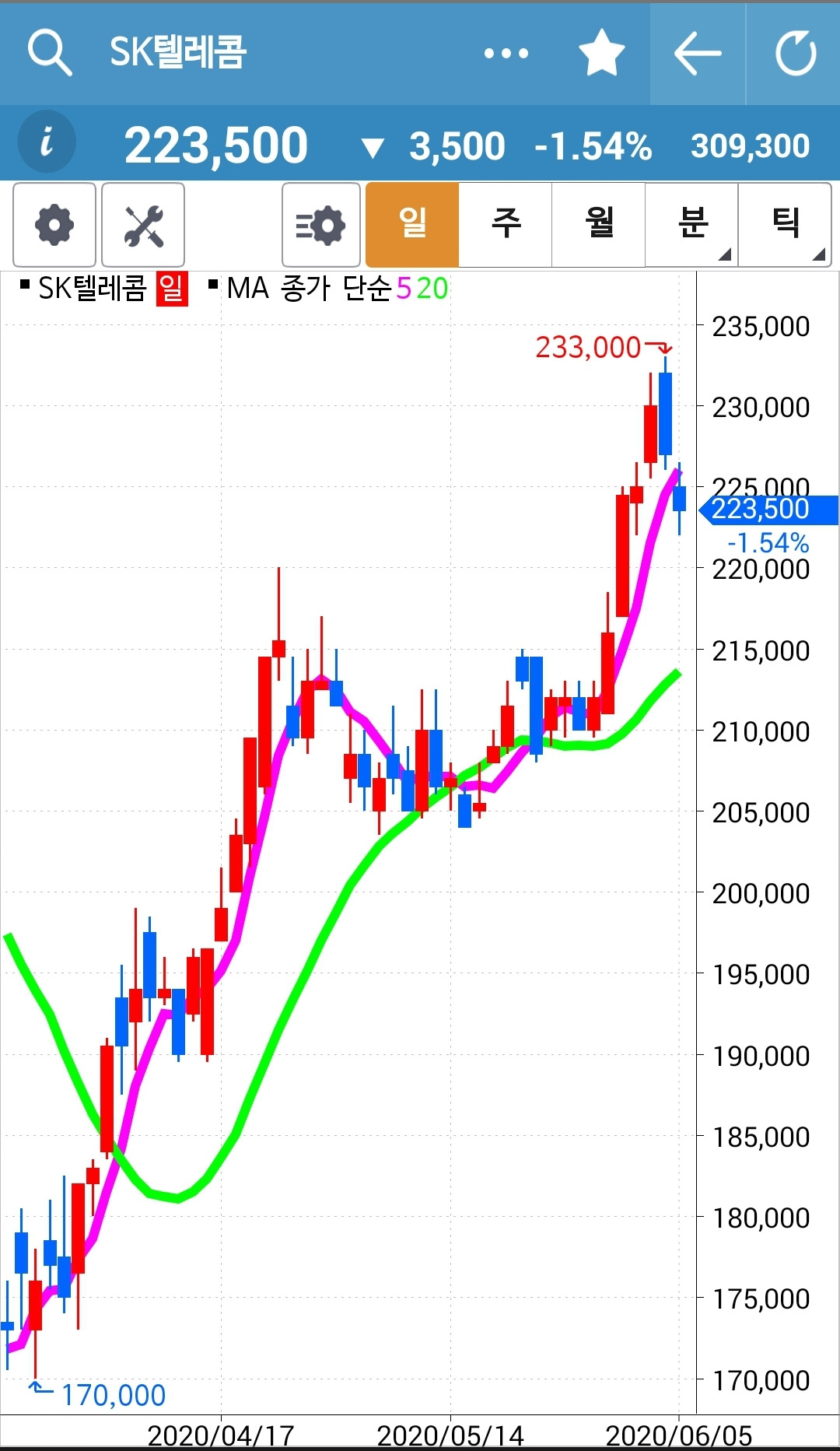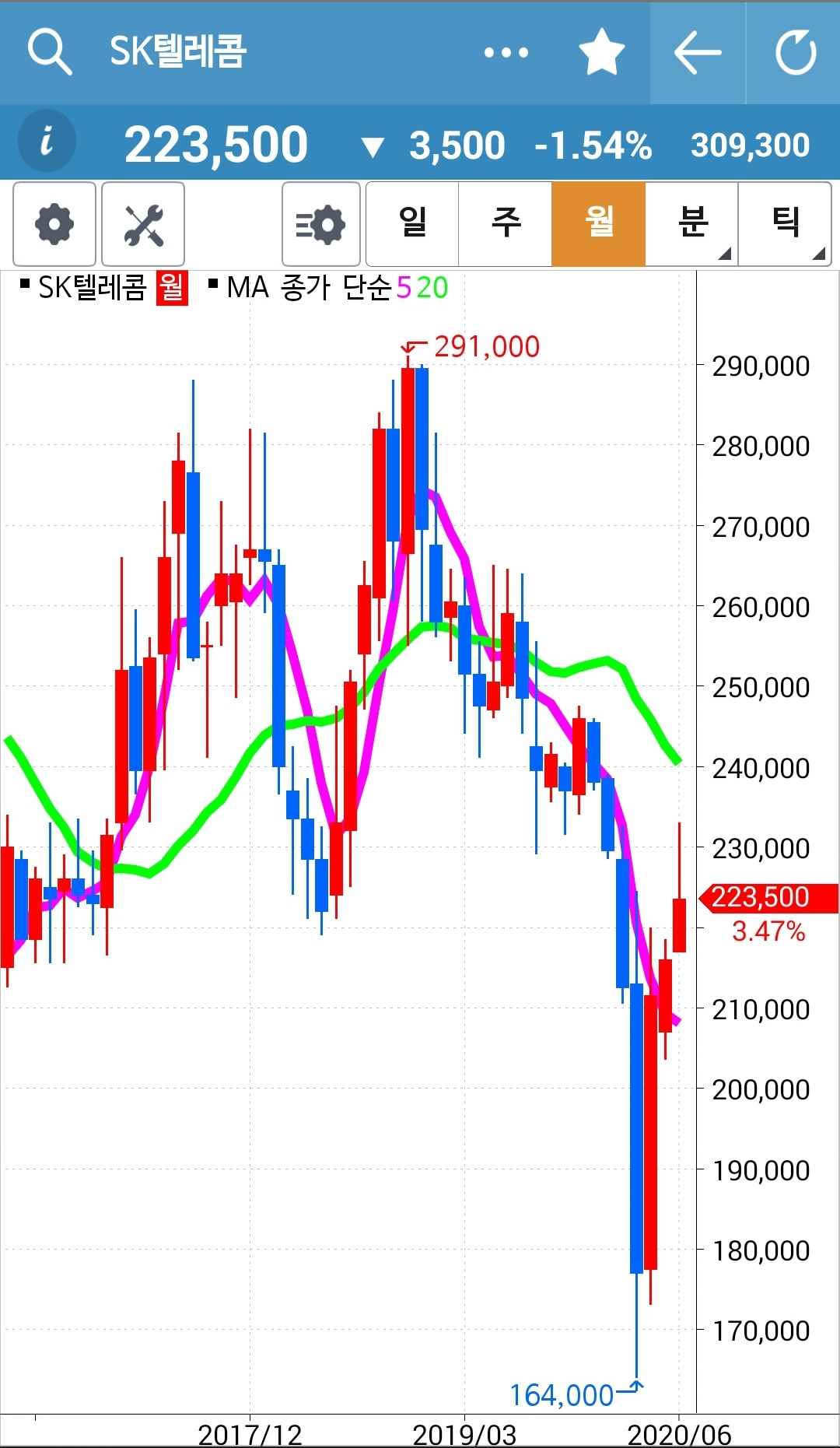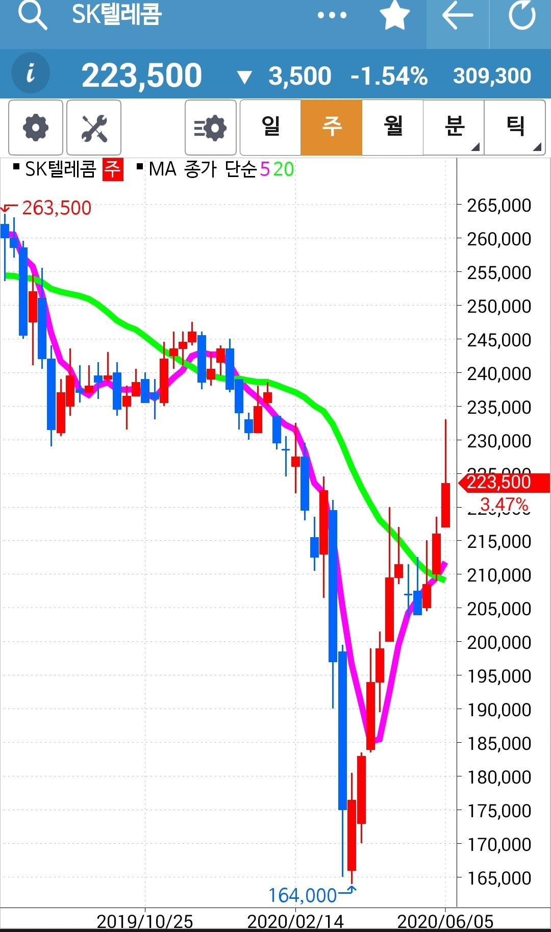 SK텔레콤. 가격은 아래로 떨어졌으나 5일선이 20일선 위에 있으므로 아직은 걱정할 필요 없다. 패스!
