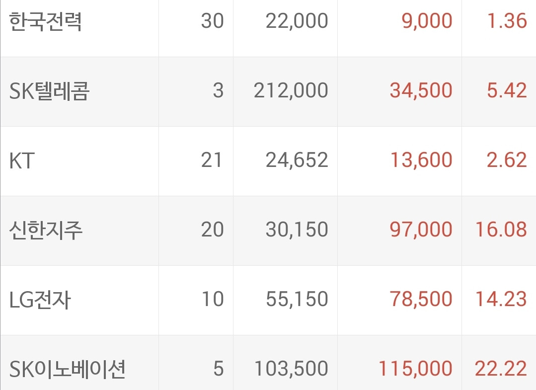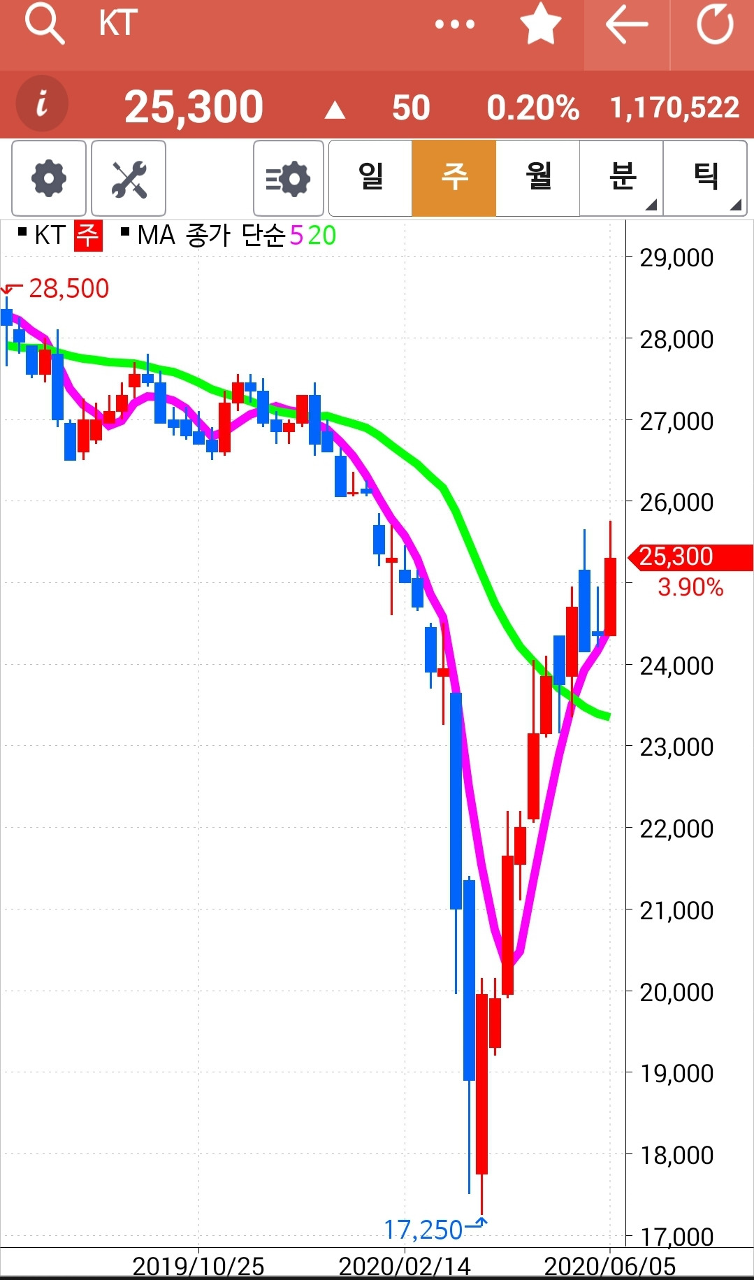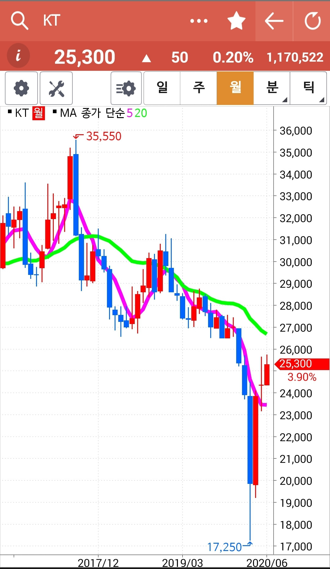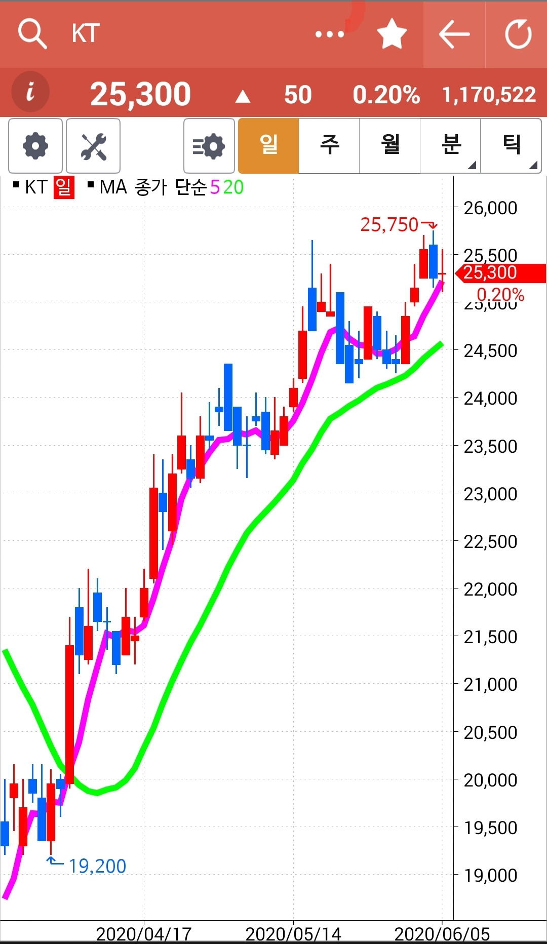 SK텔레콤. 가격은 아래로 떨어졌으나 5일선이 20일선 위에 있으므로 아직은 걱정할 필요 없다. 패스!