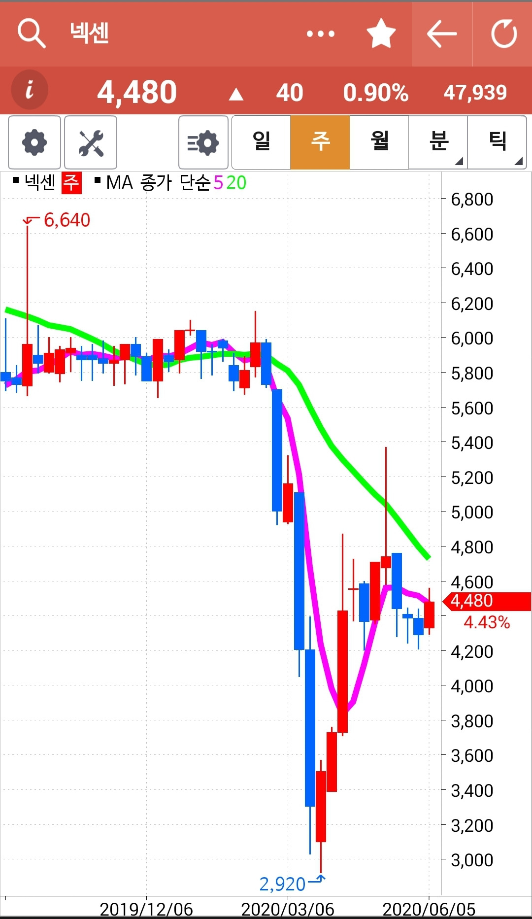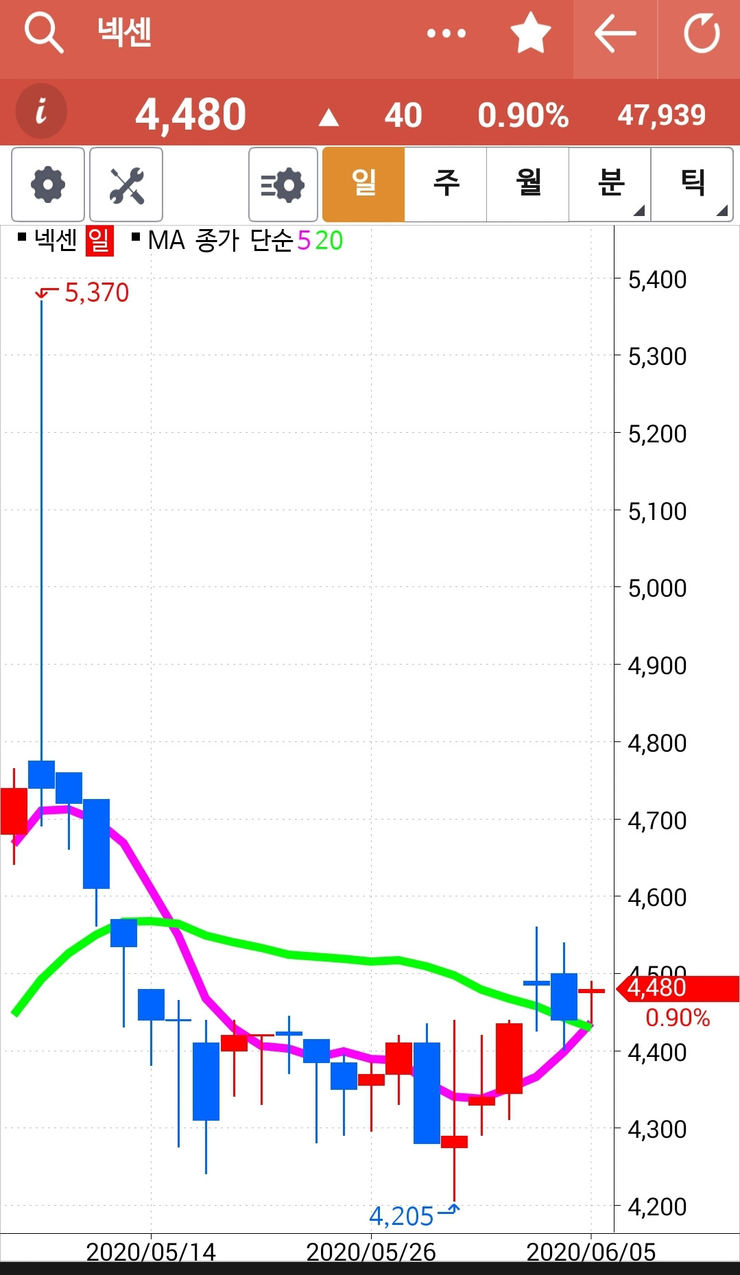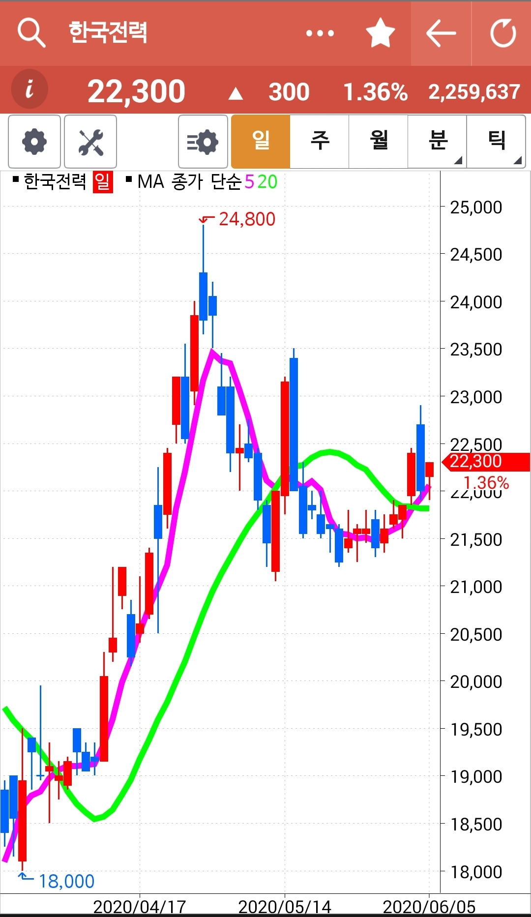 나의 투자금액 천만 원. 수익 56만 원 정도. 계좌에 남아있는 종목 순서대로 차트를 감상하자.