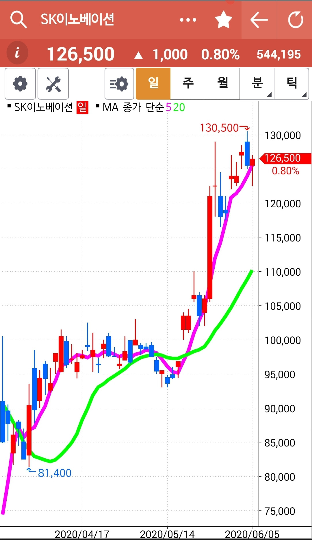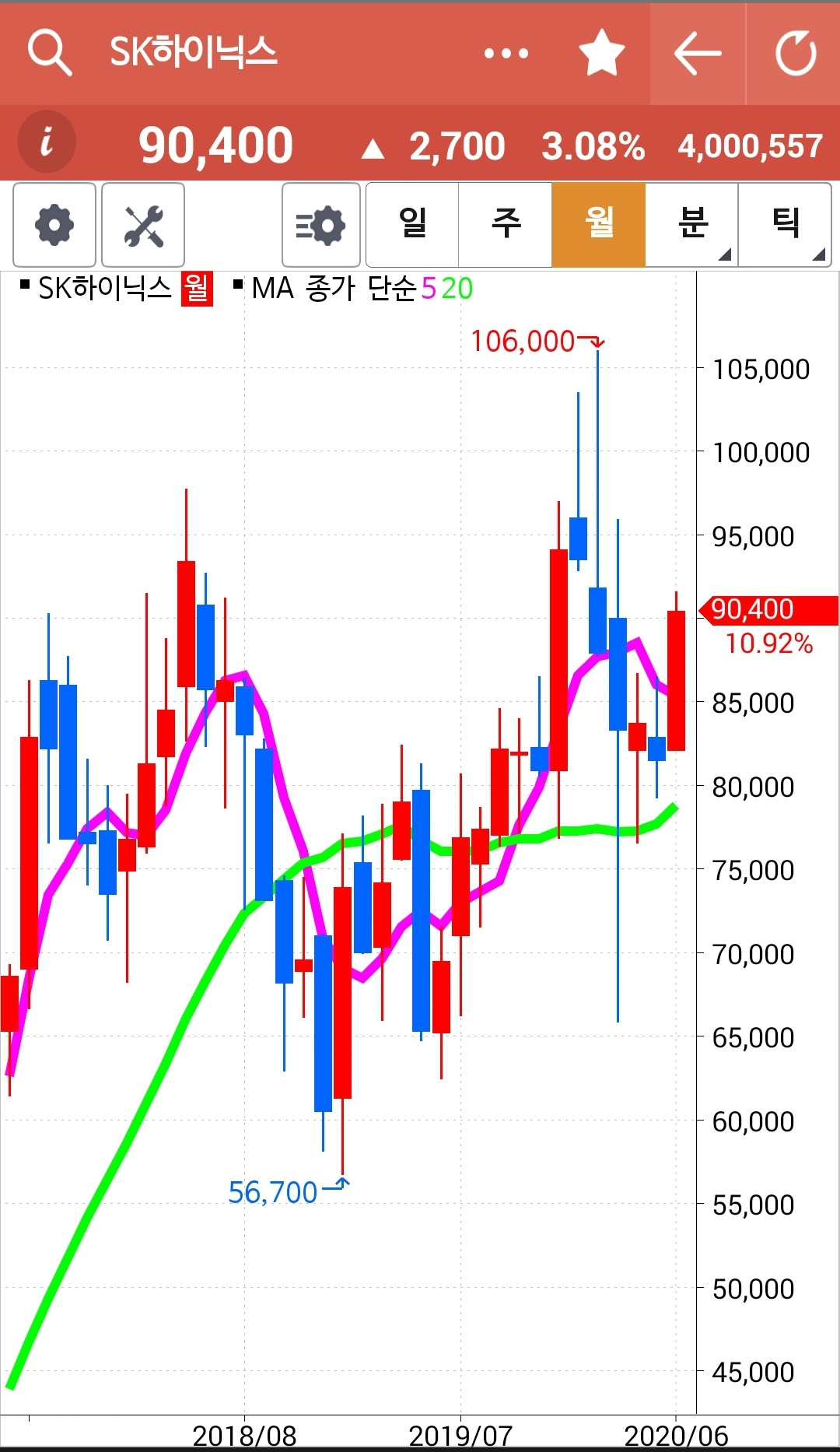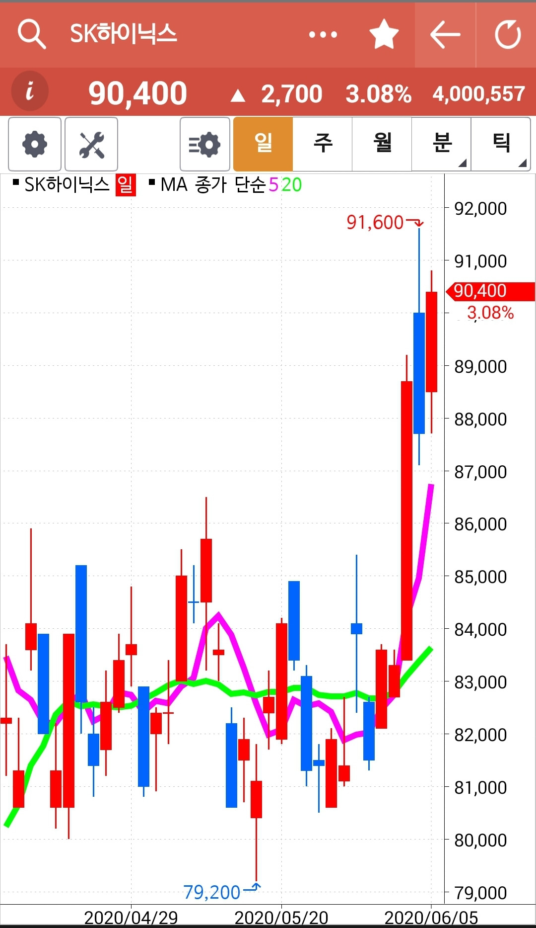 SK하이닉스. 전일 긴 음봉에 버금가는 양봉. 오일선 위로 빵빵. 매수 유지.