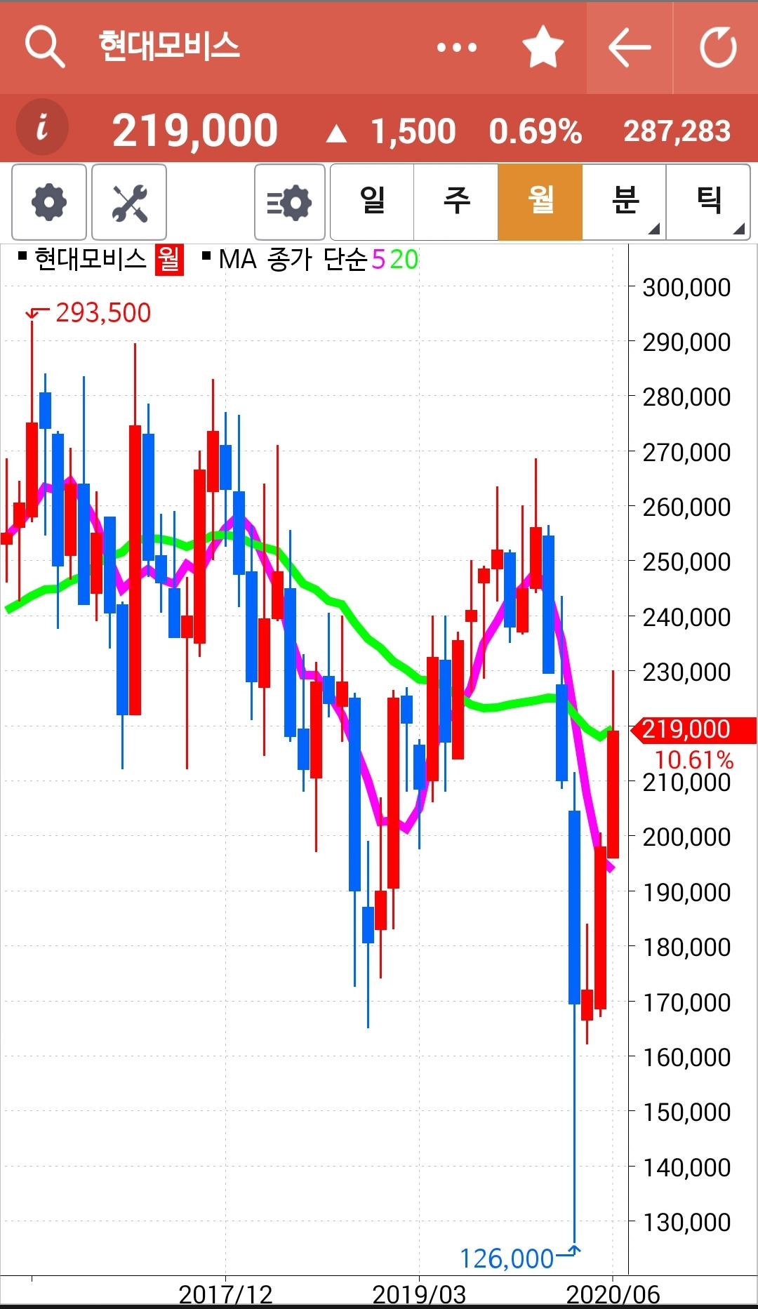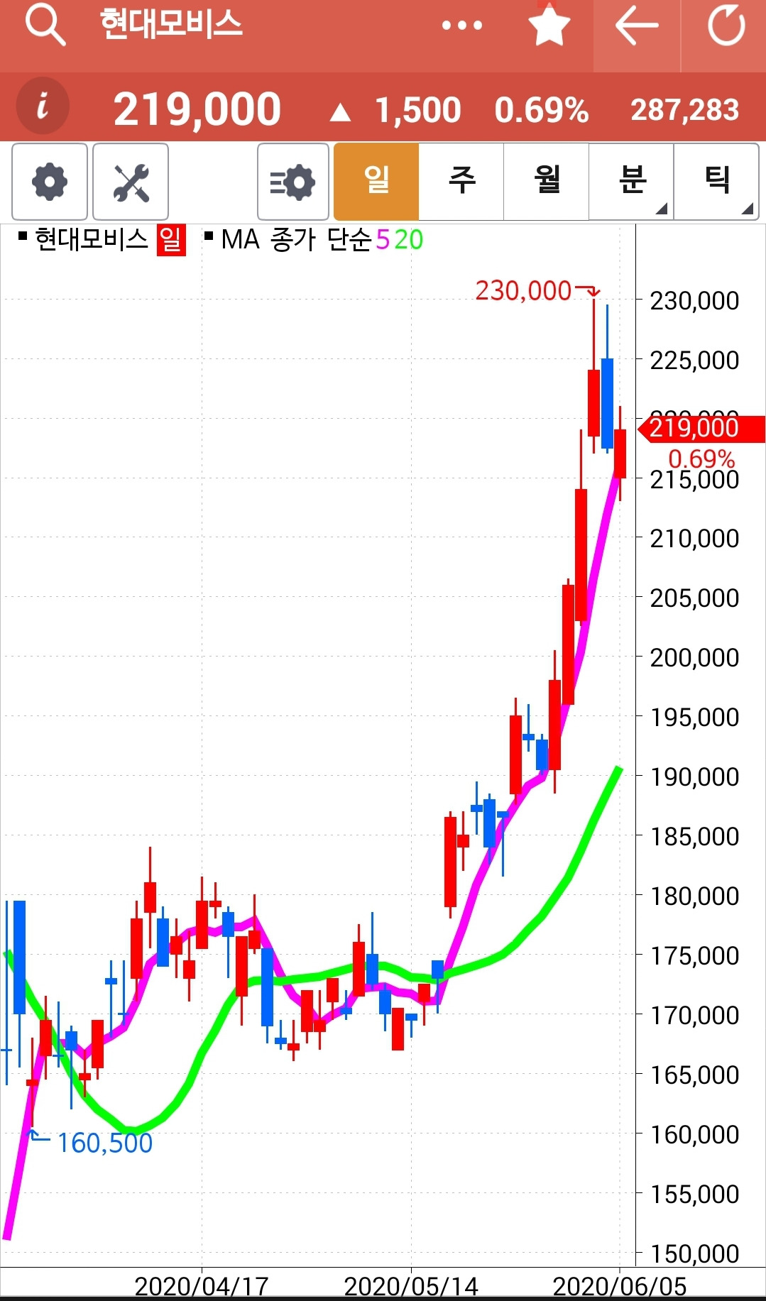 현대모비스. 이격이 과하다 싶게끔 올라가고 있다. 매수 유지.