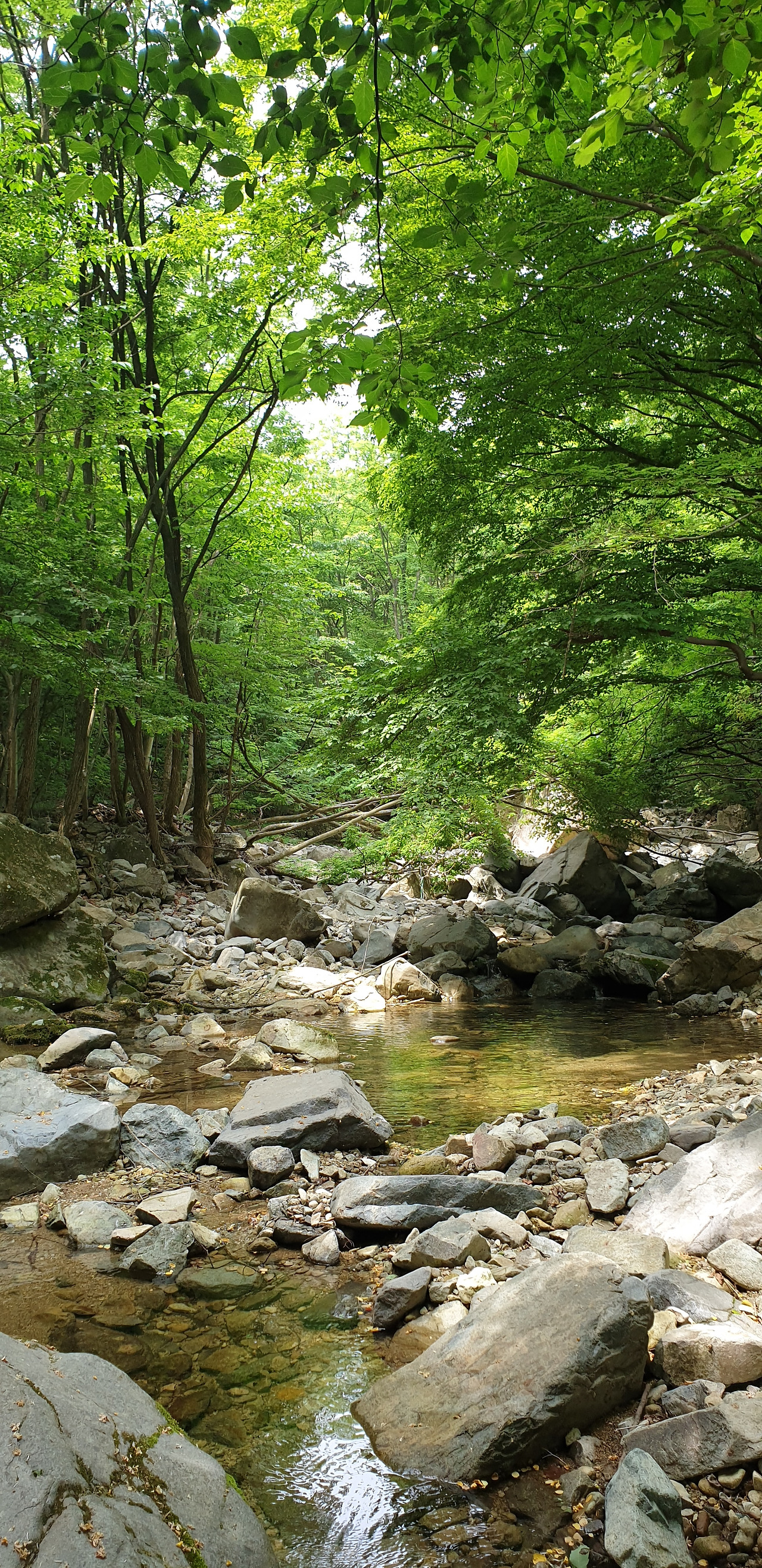 한참을 그렇게 땡볕의 넓은 포장된 도로 위를 걷는다. 다리 보호를 위해 반드시 스틱을 사용하라는 서울의 산 잘 타는 아이 조언 따라 나는 계속 스틱을 짚고 걷는데 땅땅 땅땅 포장된 도로 위라 스틱 닿는 소리가 여간 시끄러운 게 아니다. 시끄럽지? 네! 하하 귀에 거슬렸지만 참고 있었나 보다. 얼른 스틱을 들어 올려 땅에 닿지 않도록 옆으로 쥐고 걷는다. 아, 조용하다. 그런데 곳곳에 나무 심기 공사 중이다. 땀을 뻘뻘 흘리며 아저씨들이 일하는 중이다. 이게 등산길 맞을까? 아저씨 이 길이 등산로 맞아요? 웽웽 물을 주는 거대한 차 소리 앞에서 수건을 둘러쓰고 일하는 아저씨가 친절하게도 다가와 뭐라고요? 묻고는 아주 친절하게 답해준다. 네. 이리 가는 거 맞아요. 조금 더 가세요. 그래서 우린 땡볕에 좀 더 직진하고 드디어 나무 숲 울창한 나무 구름 사이로 들어간다. 와우. 그동안 뜨거웠기에 더욱 시원하게 느껴지는 울창한 숲. 밑으로는 계곡물이 좔좔 위로는 나뭇잎이 산들산들. 우리 바나나 먹고 가자. 거기 모닝커피까지. 하하 바나나와 모닝커피는 나의 준비물. 계곡물 졸졸 흐르는 아름다운 곳에 자리 잡고 앉아 바나나를 먹고 커피를 마신다. 아흥. 신선놀음이야.