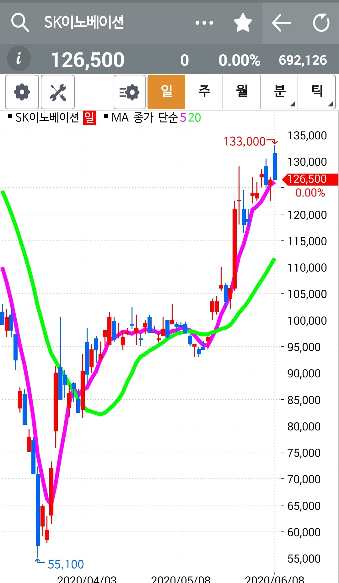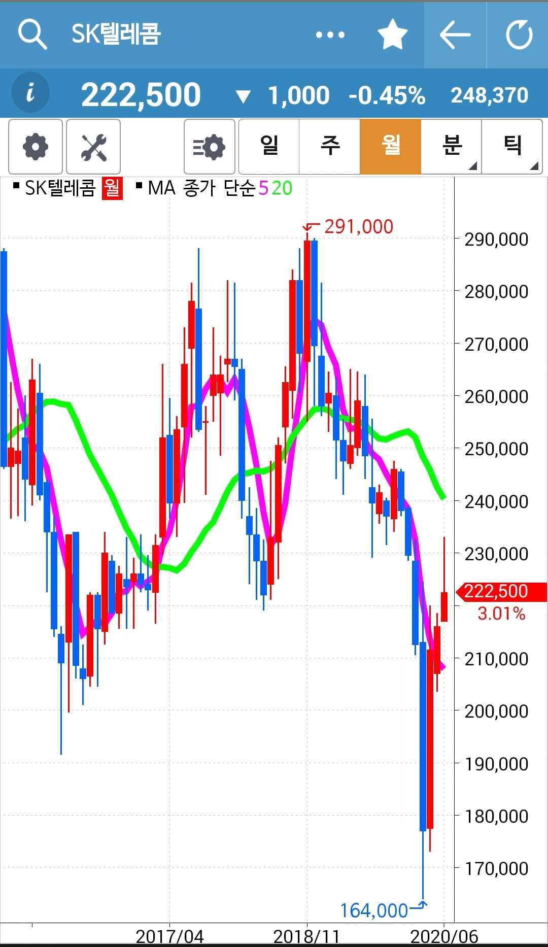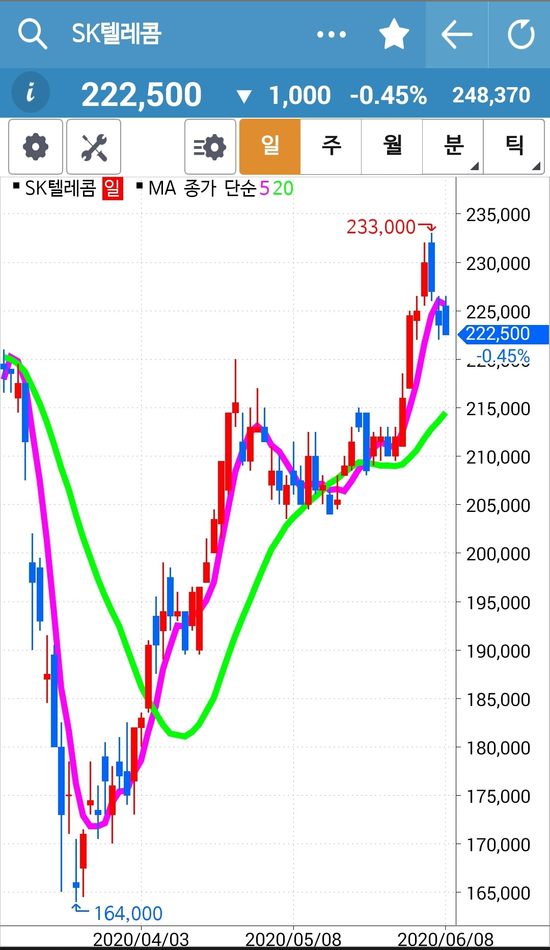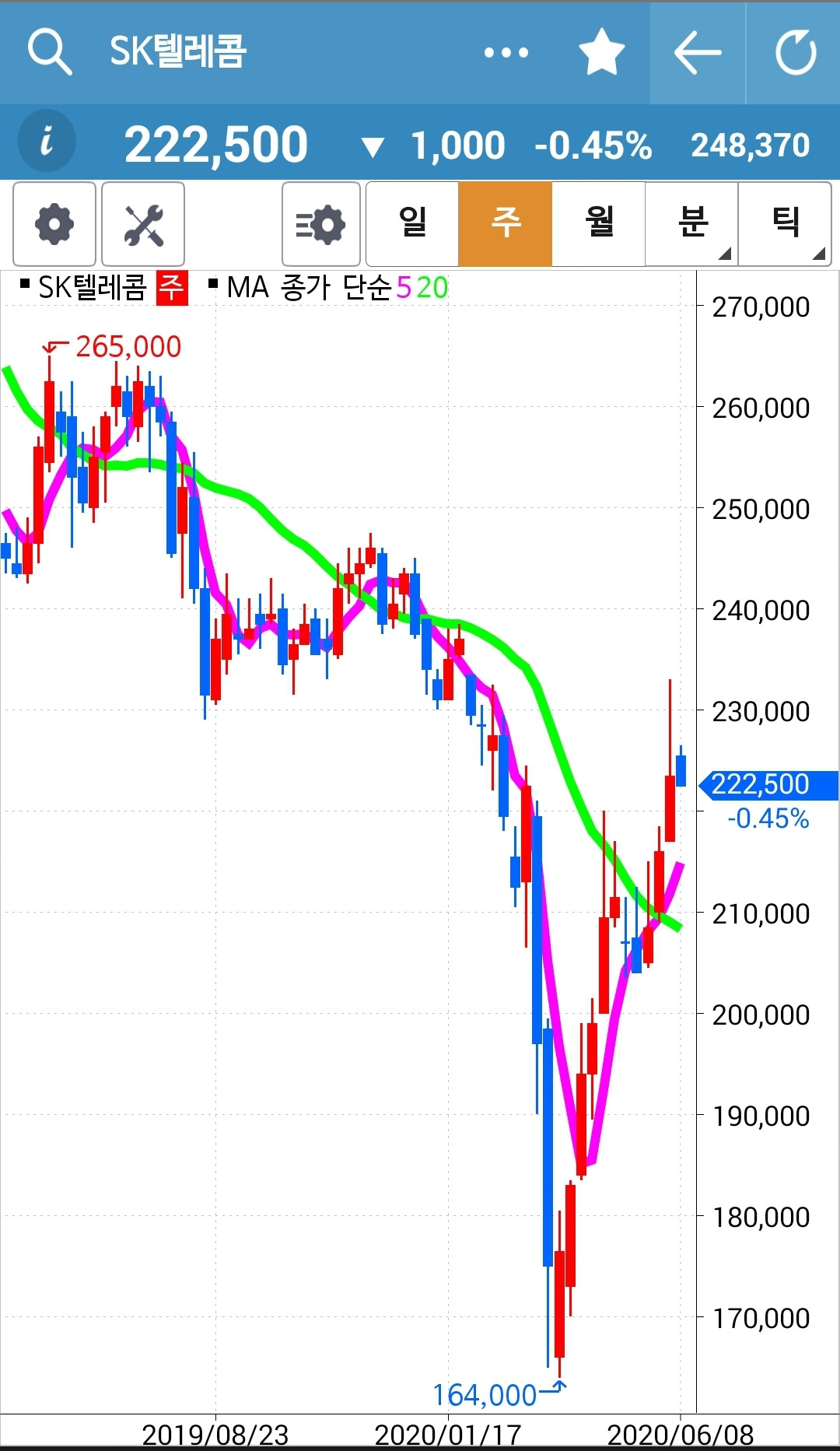 SK텔레콤. 음봉이 많아지고 있다. 5일 선도 꺾이고 있다. 그러나 아직 20일선 위에 있으므로 오케이. 패스.