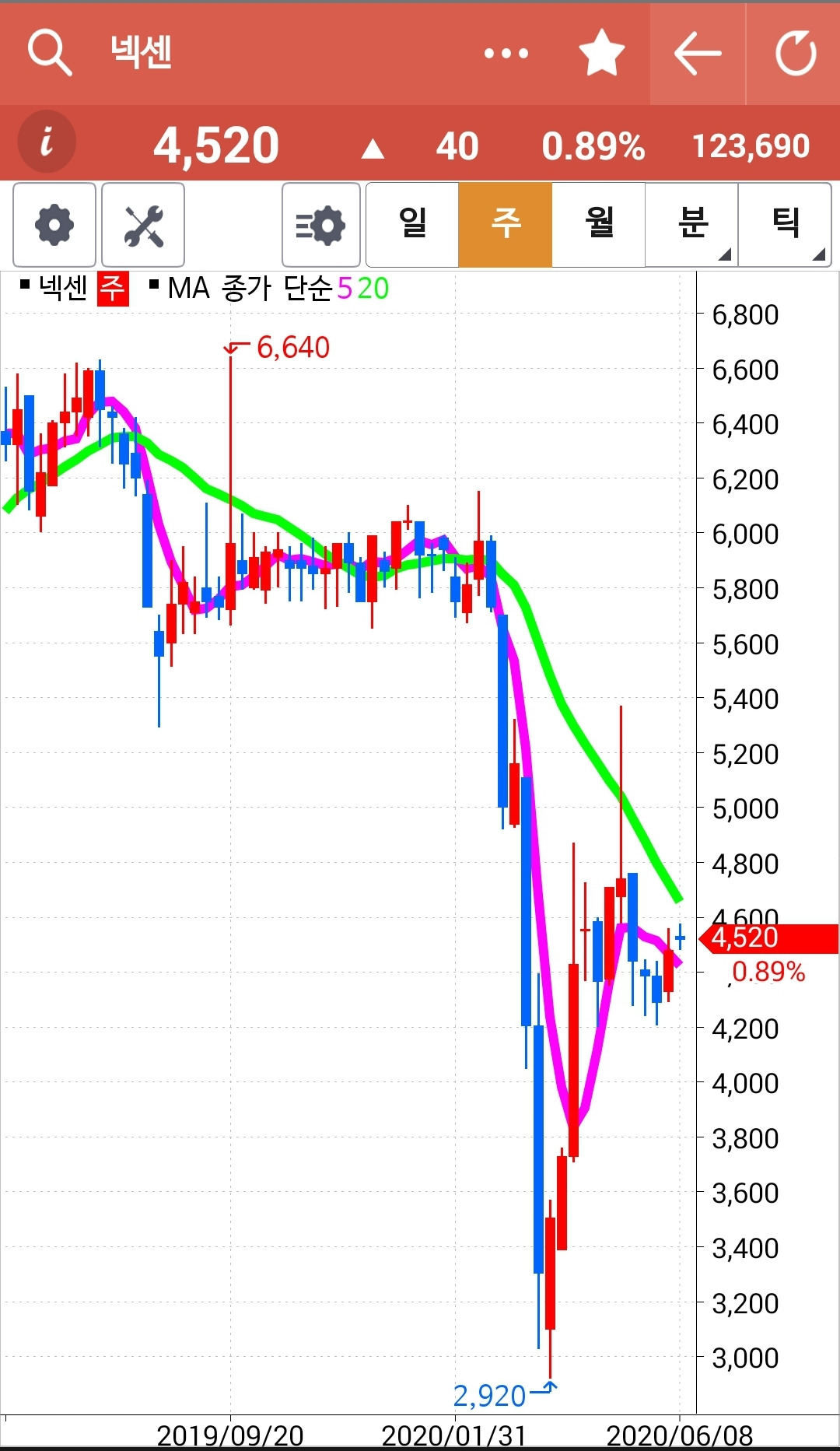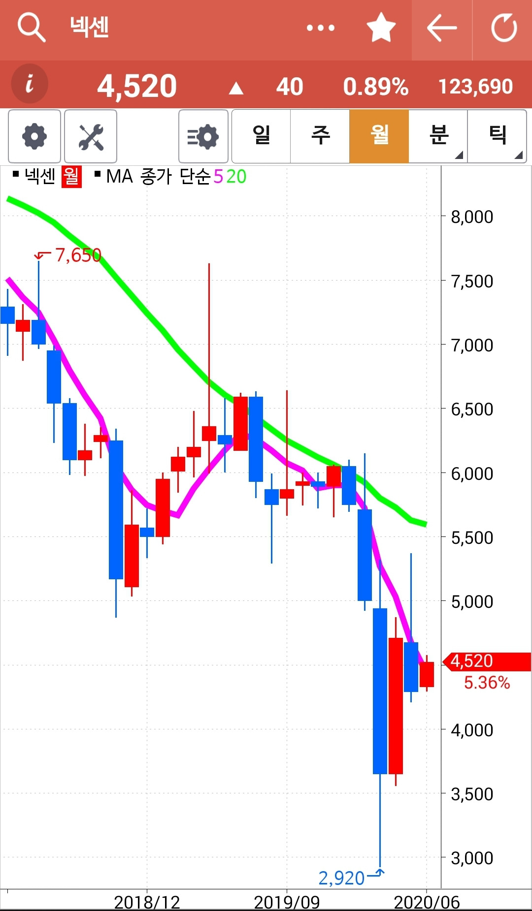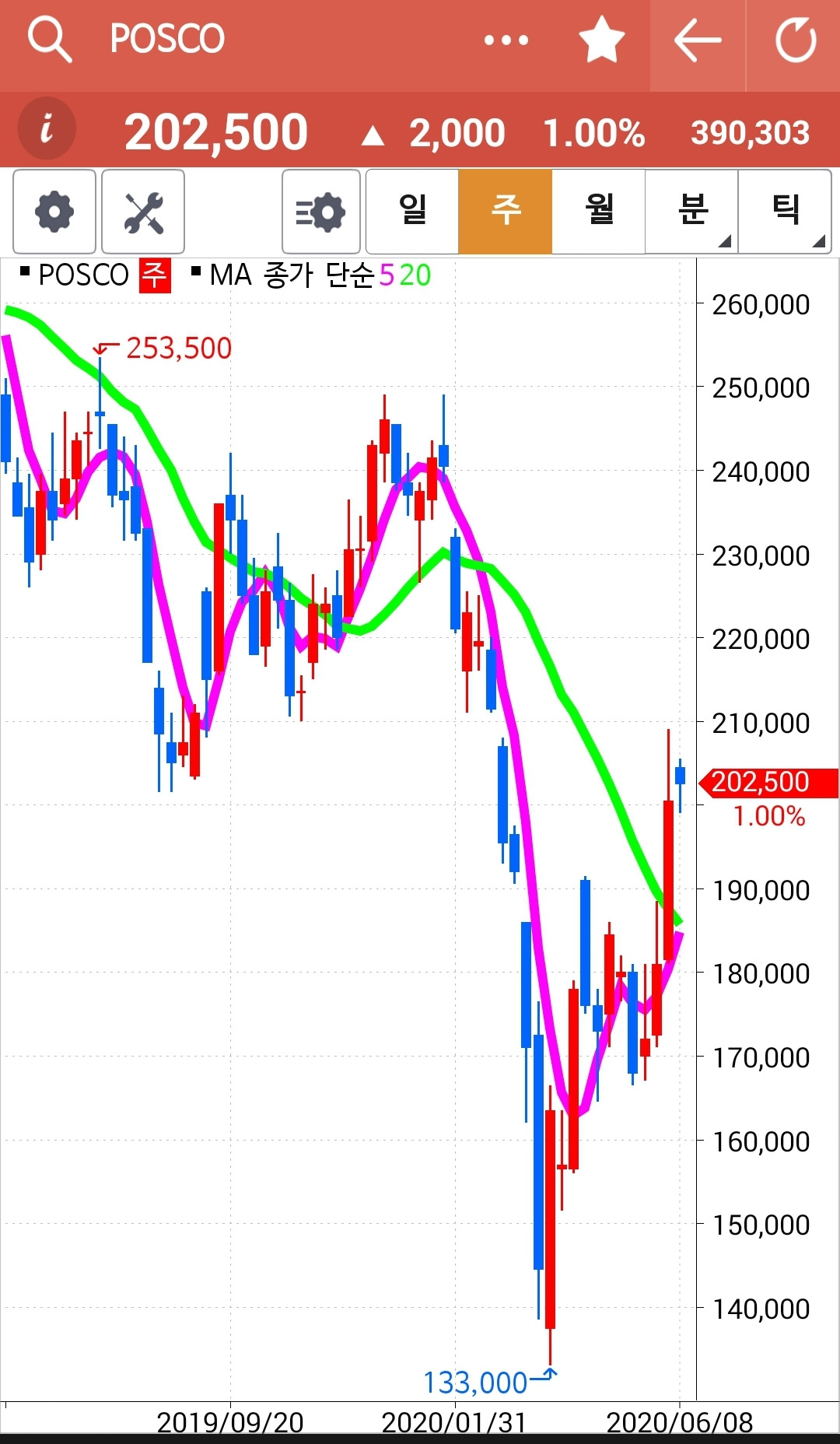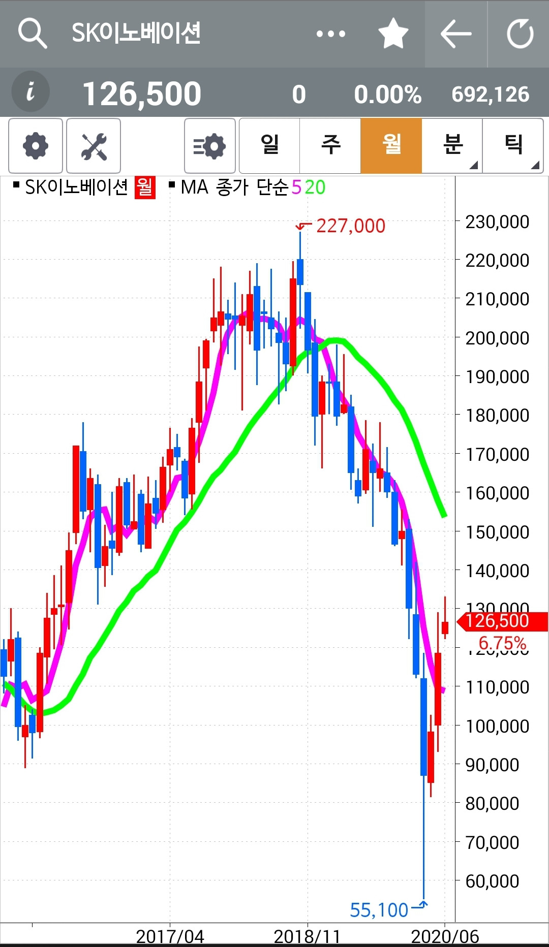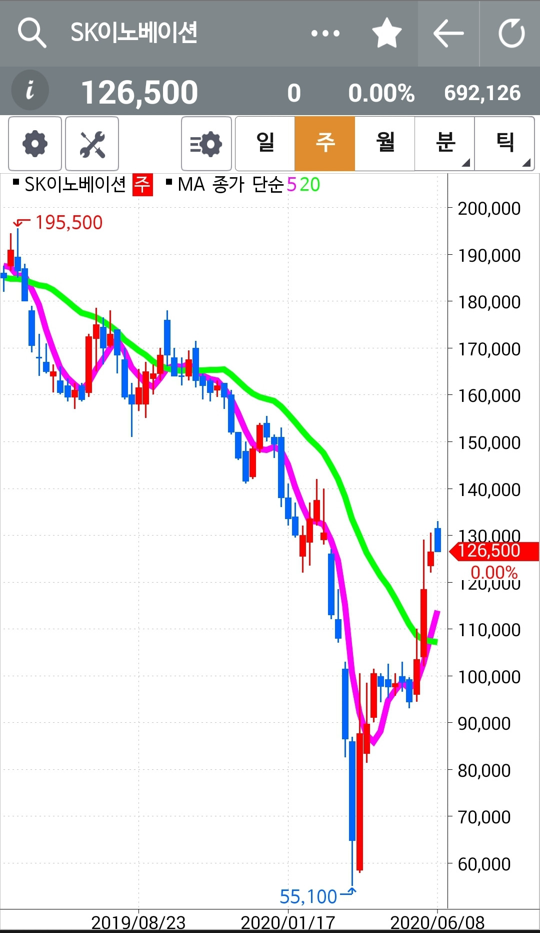 SK텔레콤. 음봉이 많아지고 있다. 5일 선도 꺾이고 있다. 그러나 아직 20일선 위에 있으므로 오케이. 패스.