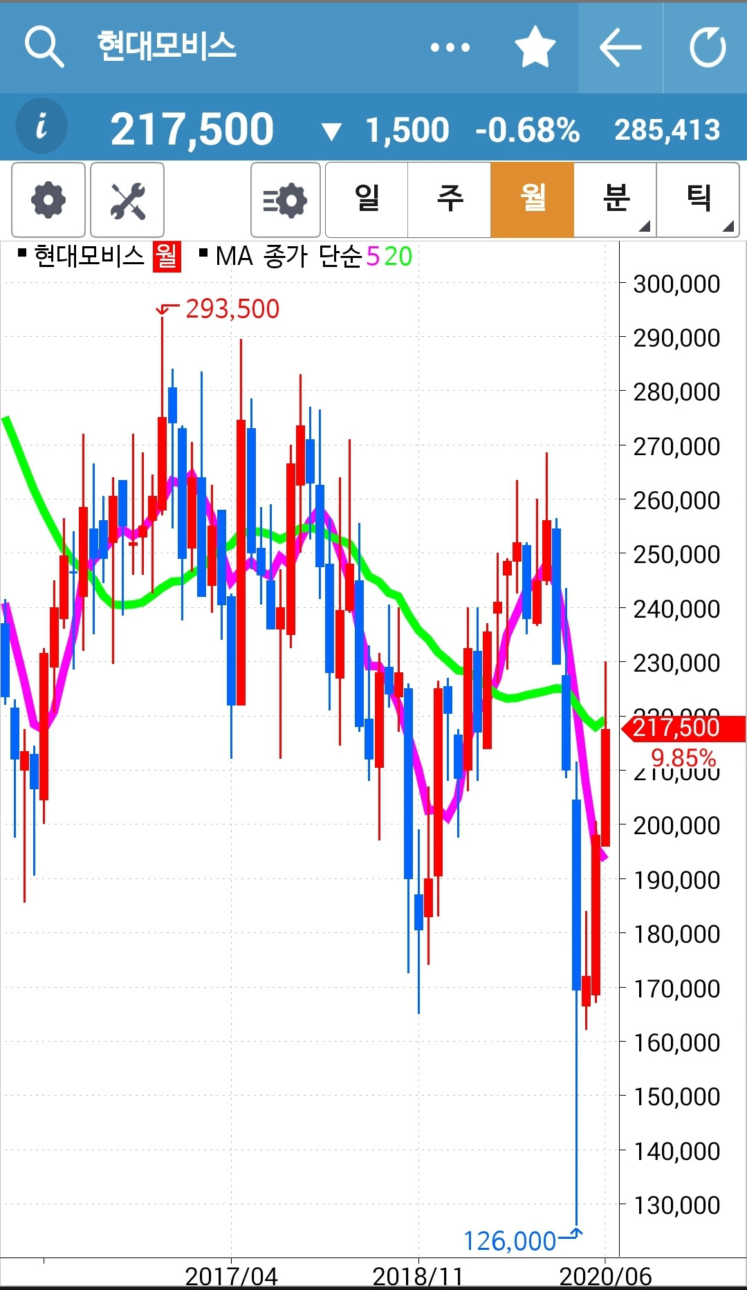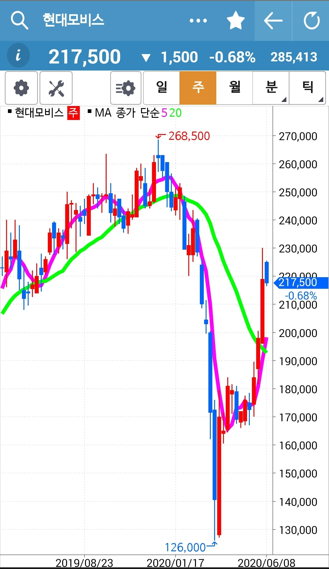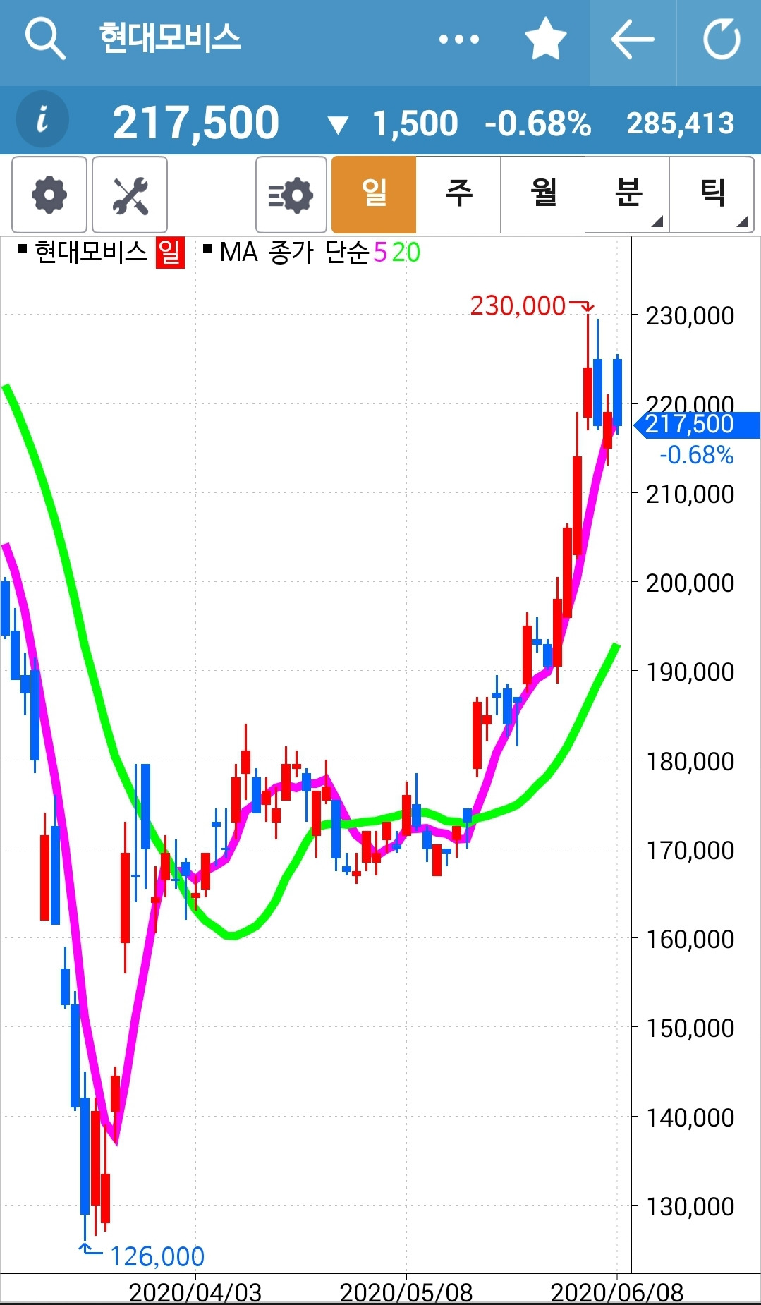 현대모비스. 음봉이지만 5일선이 위에 있으니까 내가 할 일은 없음. 패스.