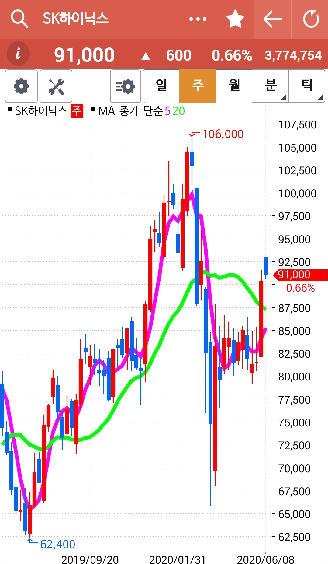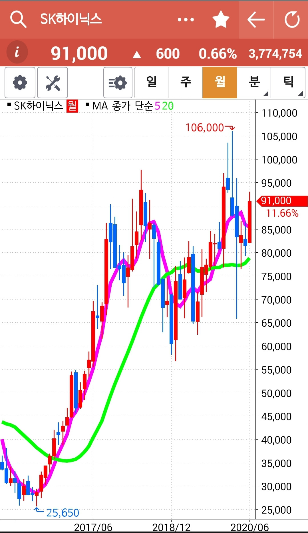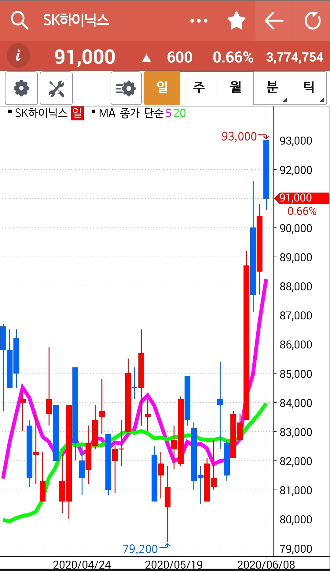 SK하이닉스. 긴 음봉. 그러나 5일선이 20일선 위에 있으므로 노 프라블럼. 패스.