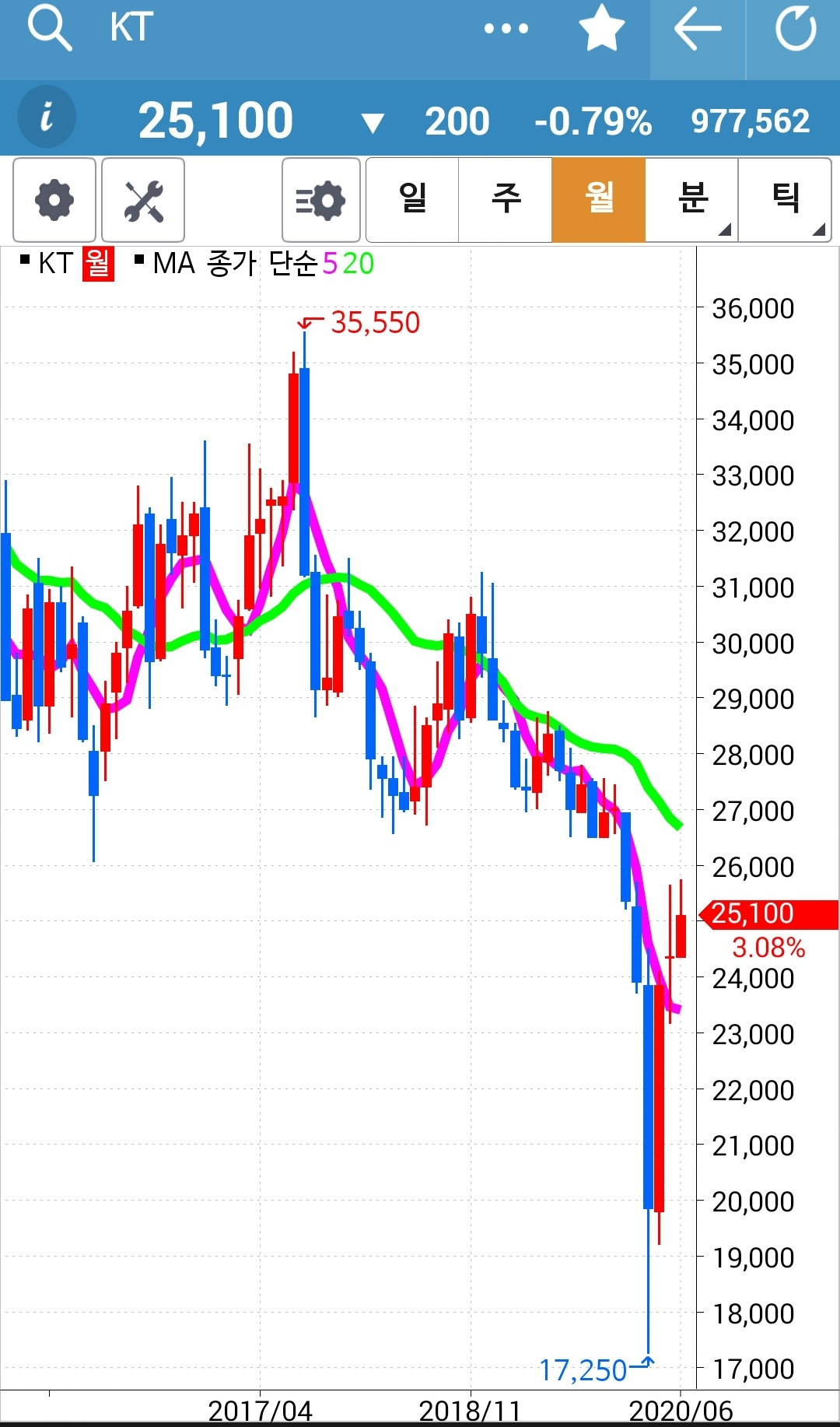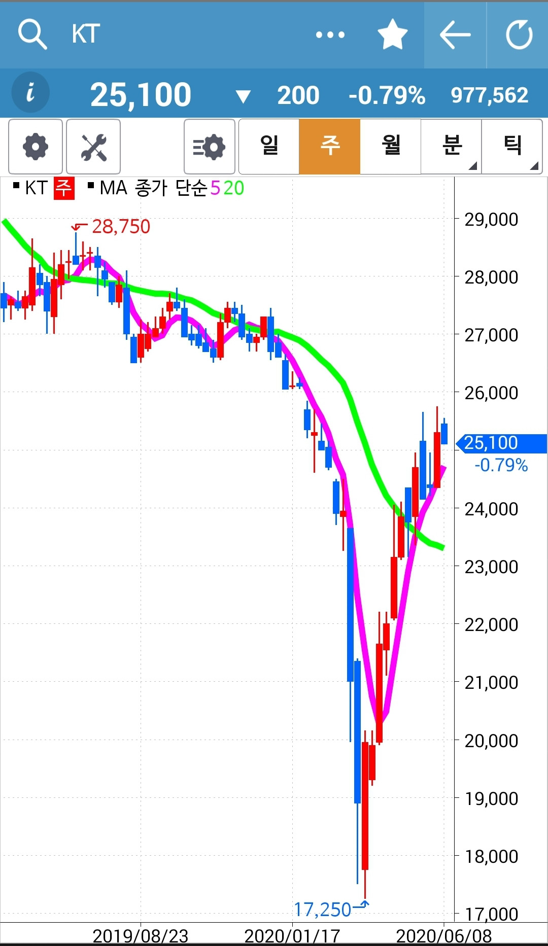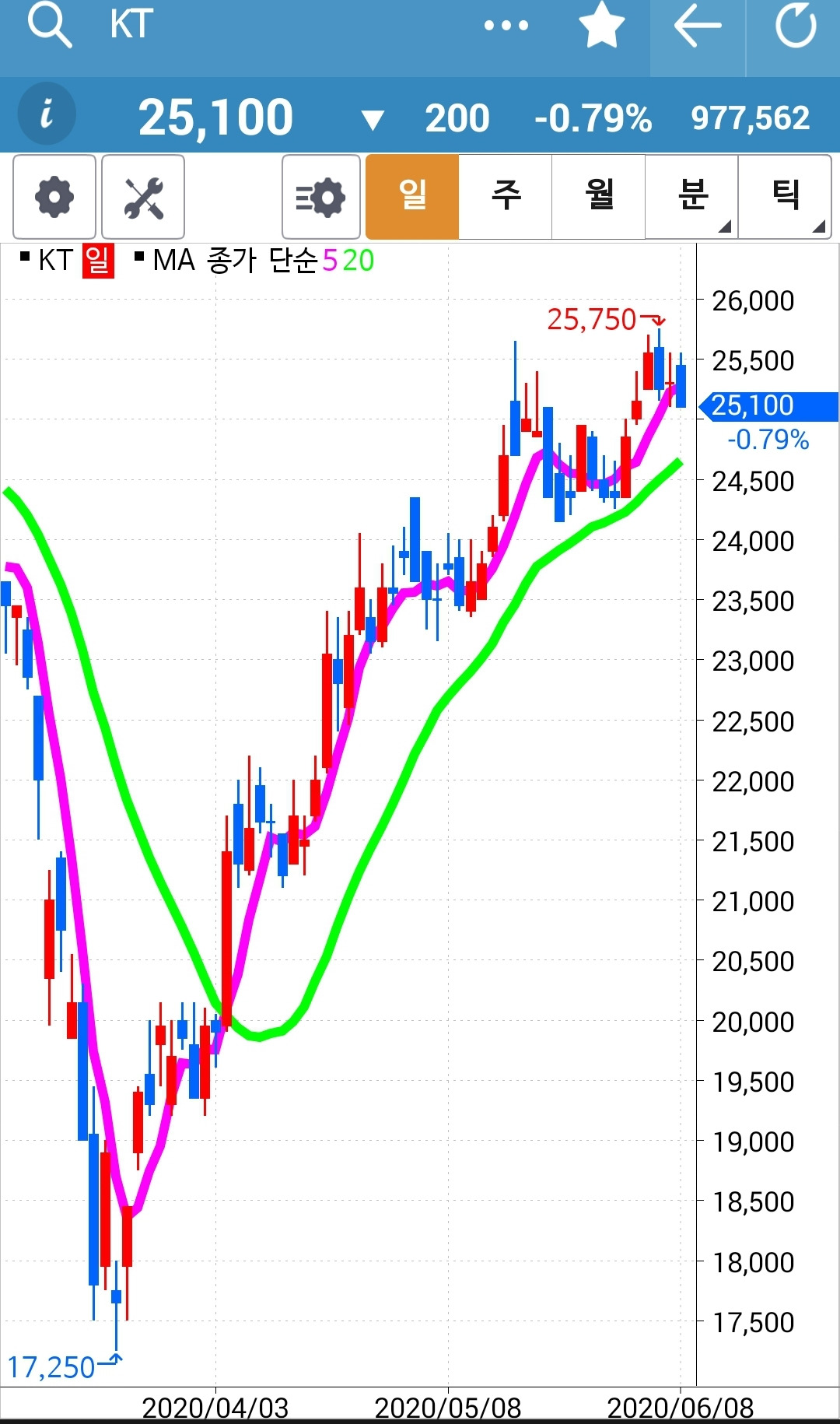 KT. 음봉. 이날 음봉이 꽤 많구나. 거의 모든 종목이 음봉이다. 에구. 그래도 5일선이 위에 있으니 오케이.
